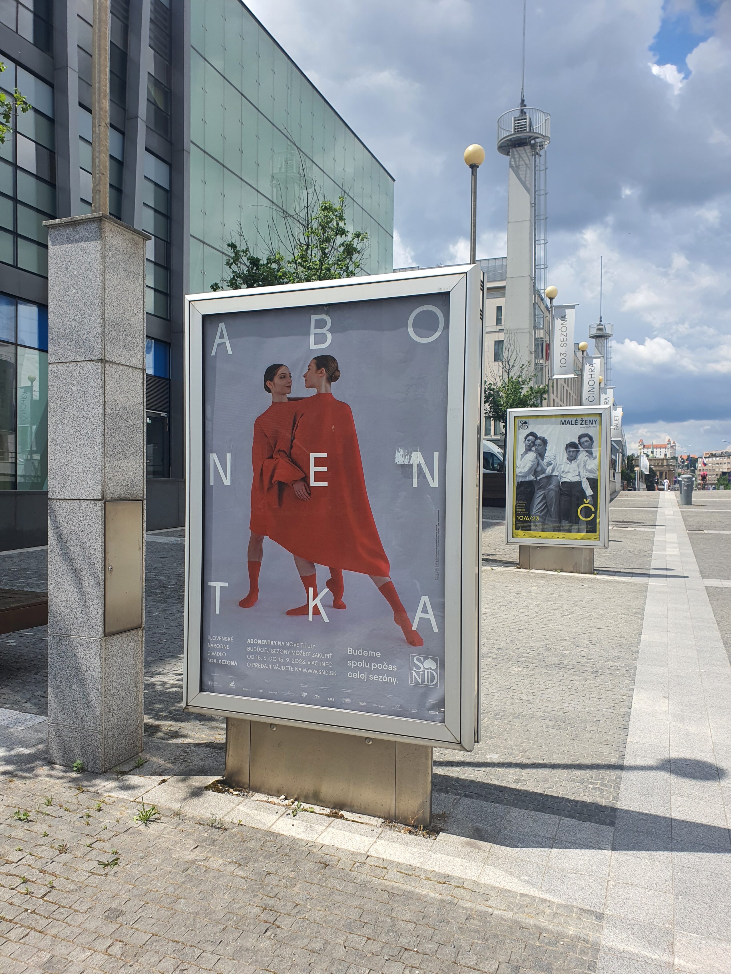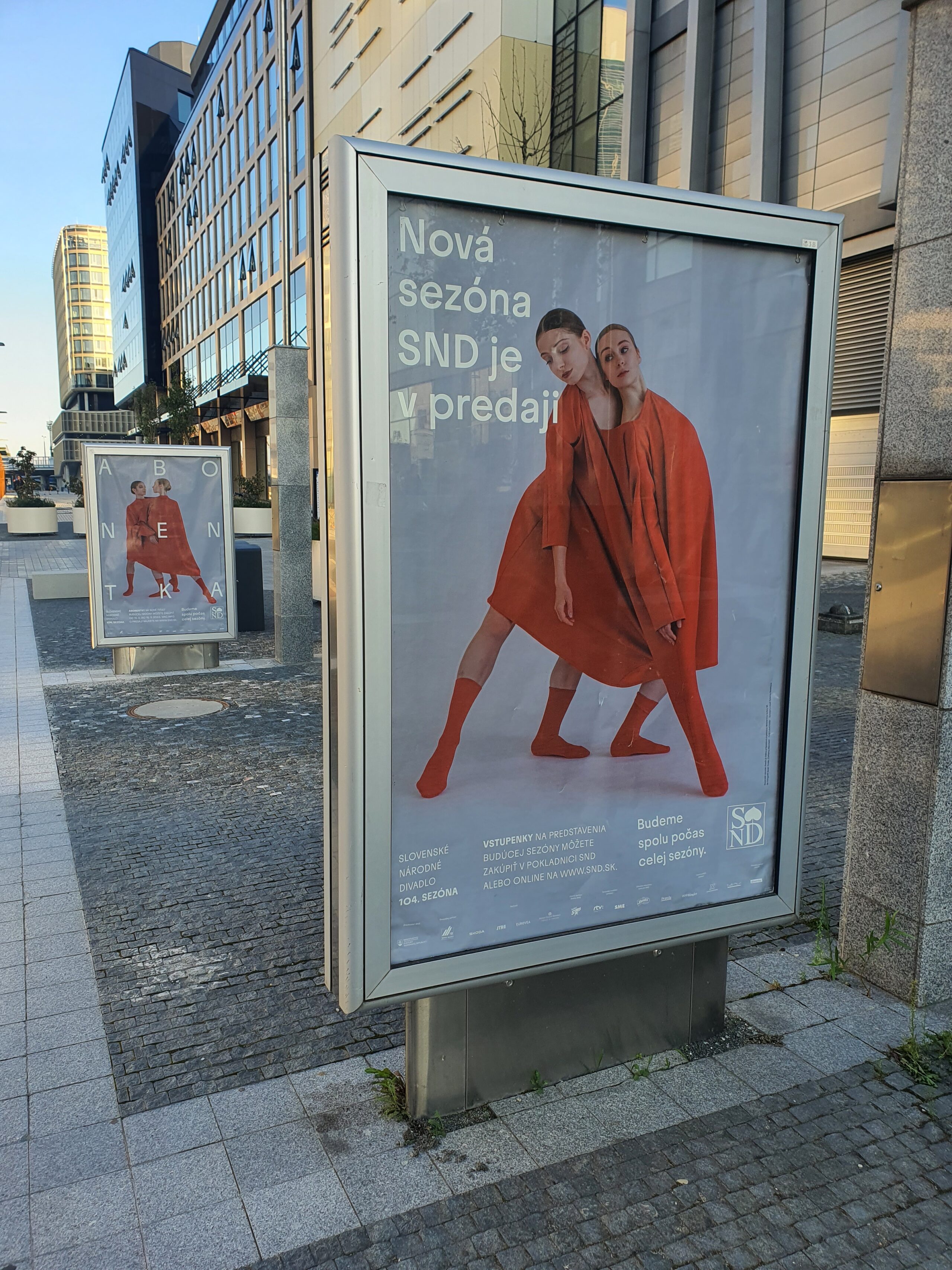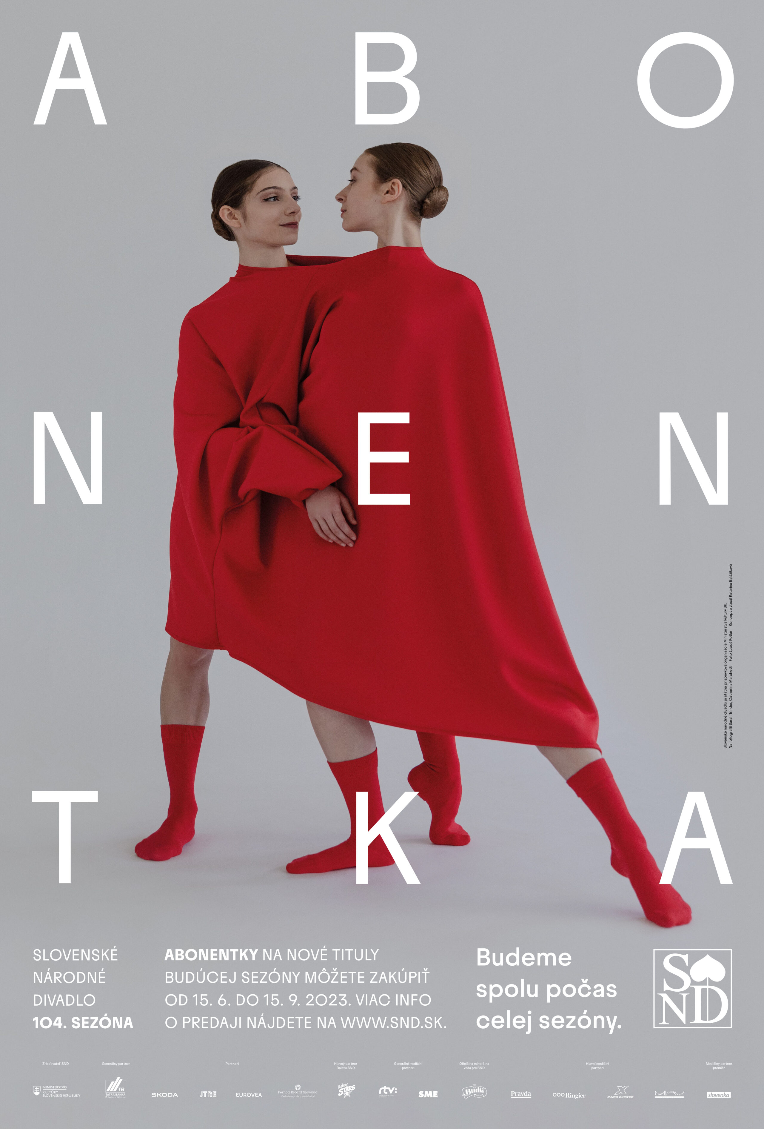 Abonentka je predplatená vstupenka na sériu vybraných divadelných predstavení. Abonentka obsahuje vstupenky na konkrétne miesto v sále na konkrétne divadelné predstavenia, ktoré sa konajú na pevne stanovenom mieste a termíne v konkrétnej sezóne. Koncept kampane a jej vizuál bol vytvorený s cieľom vizualizovať partnertvo, vzťah SND a diváka. Za týmto účelom som sa rozhodla využiť dve členky baletného súboru SND, ktoré v spoločnom kostýme rôznym spôsobom poeticky koexistujú. V symbióze, súhre a vzájomnom pochopení sa vzájomne ovplyvňujú, dopĺňajú, komunikujú. Kampaň komunikuje vzájomnú potrebu a podporu. Kampaň obsahovala outdoorové nosiče, televízny spot a komunikáciu na sociálnych sieťach. Autorom spotu je Samuel Spišák, autorom fotografie je Luboš Kotlár.