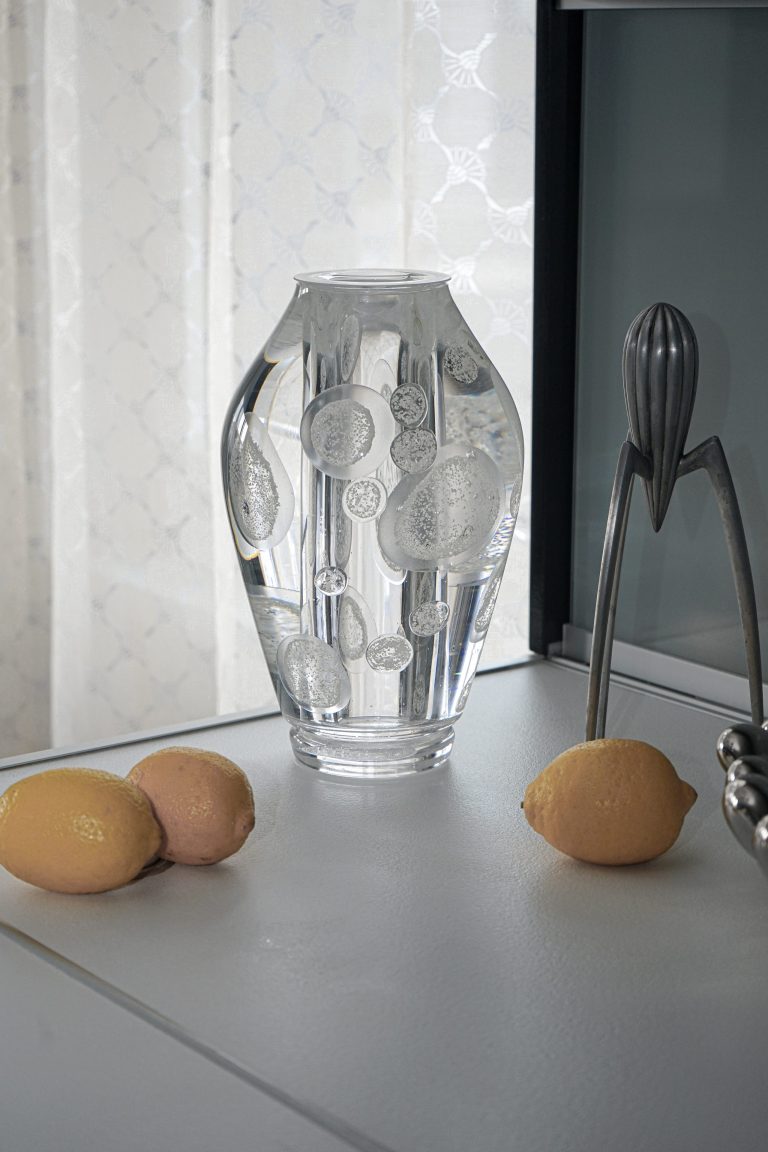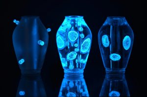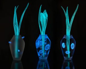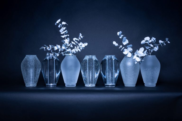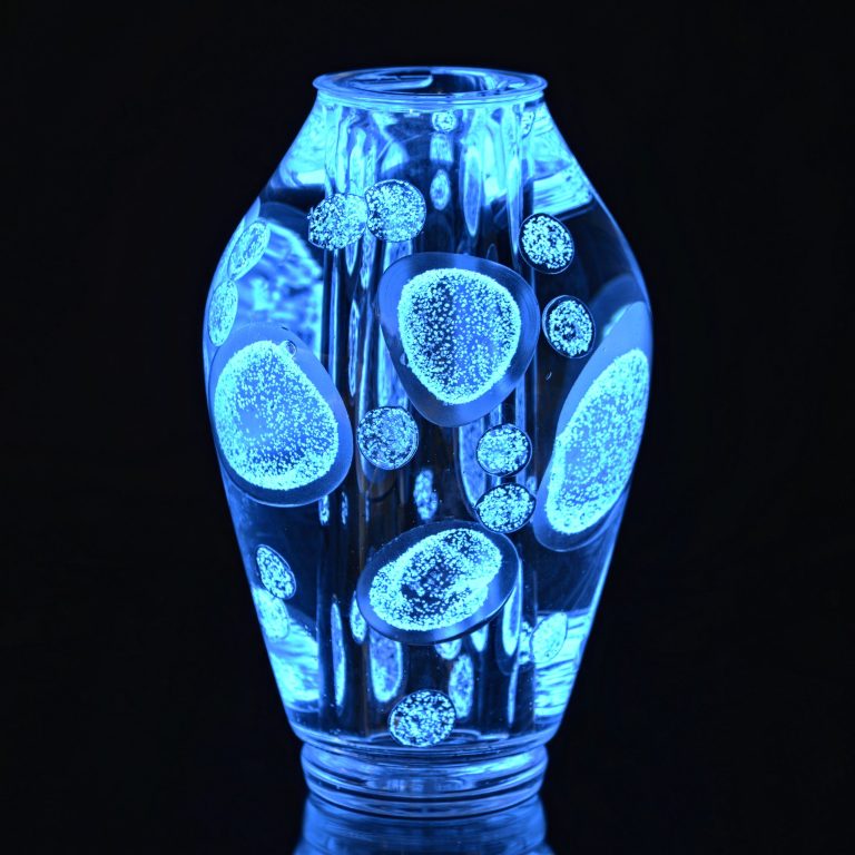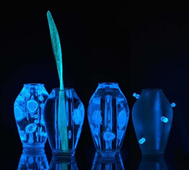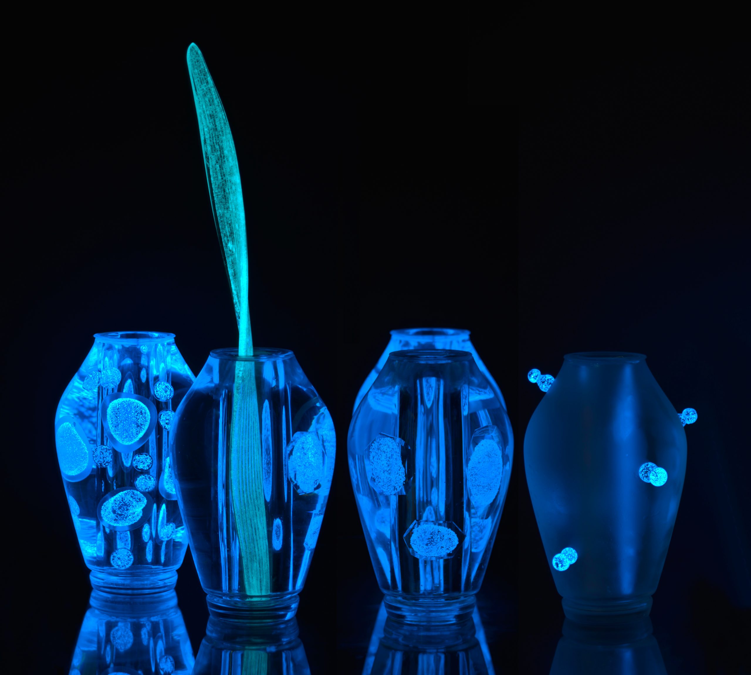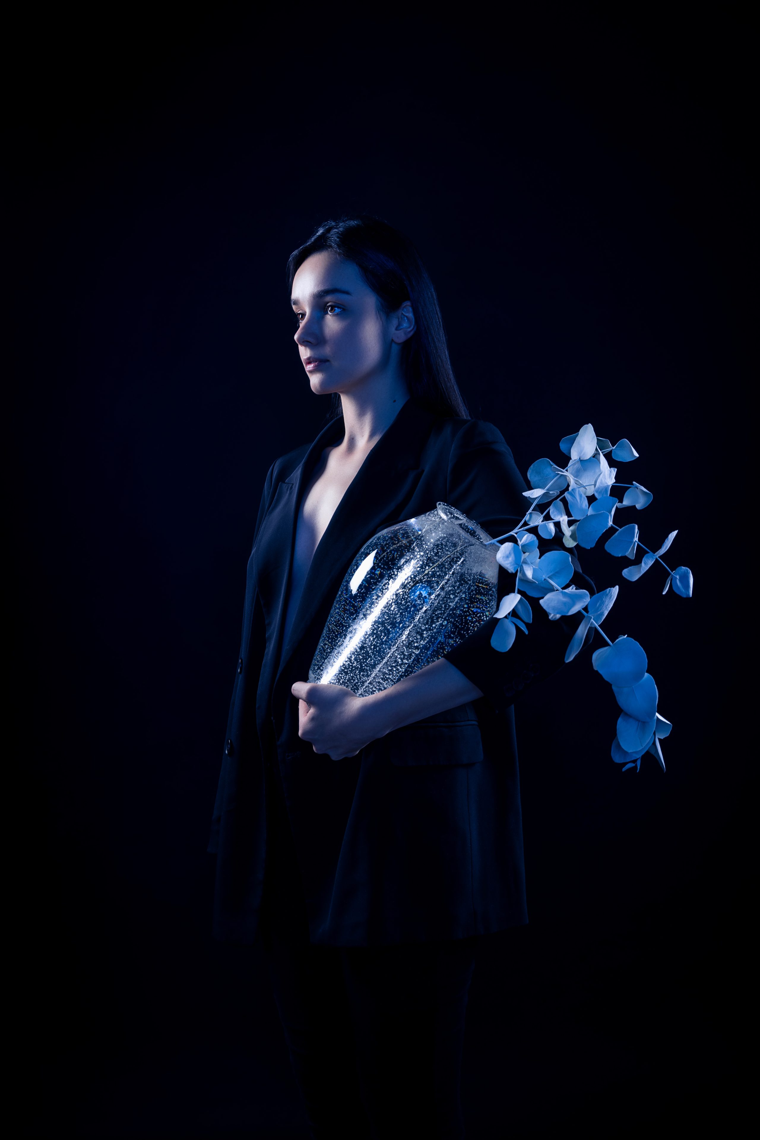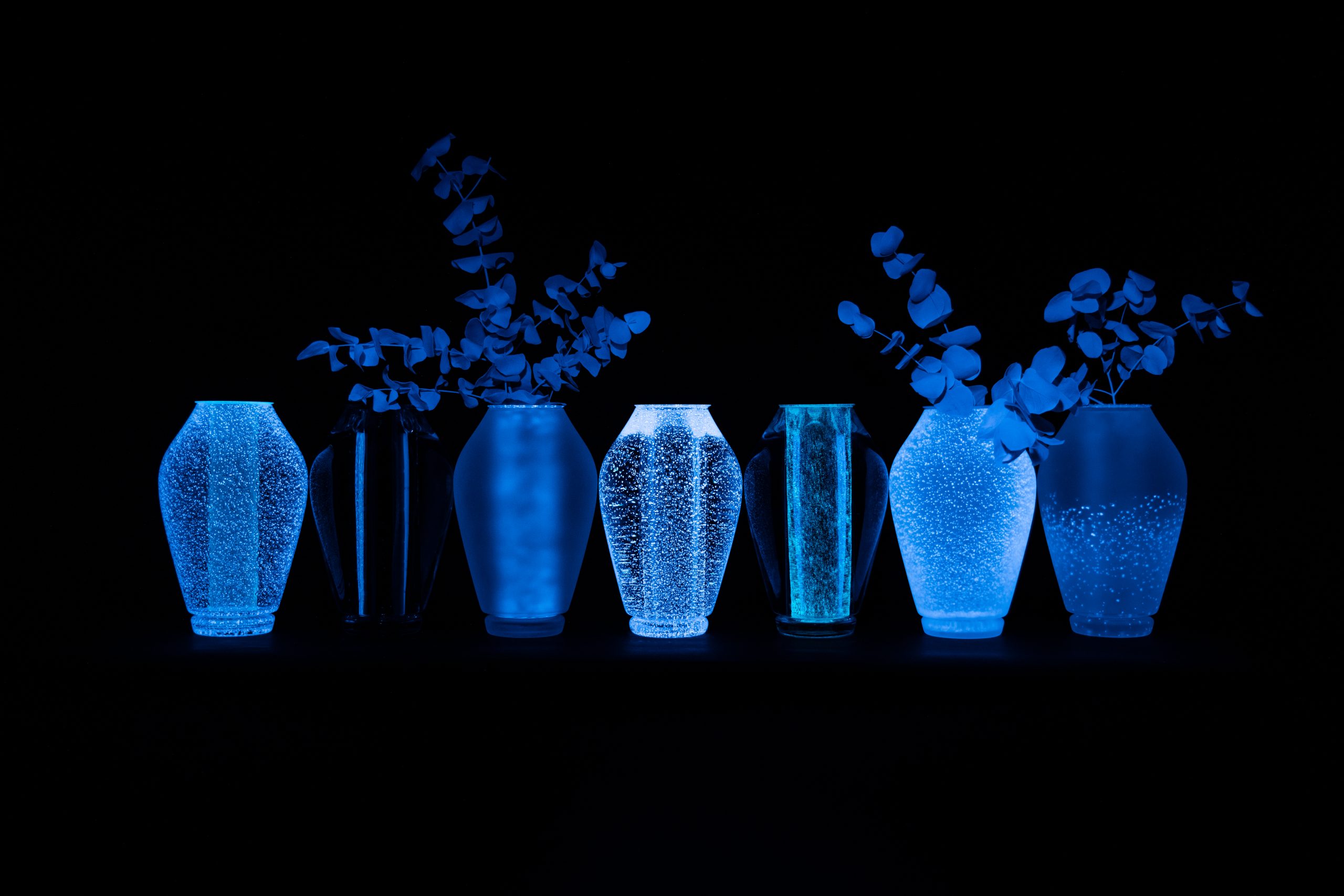 BLUE predstavuje experimentálnu sériu váz, ktoré skúmajú optické vlastnosti krištáľového skla v kombinácii so svetlom, pigmentom a kvapalinou. Interagujú so svetelným spektrom a menia svoju farbu podľa jeho intenzity – ide teda o iluzívne farbenie, pretože sklo samotné je bezfarebné. Inšpiráciou pre koncept bola japonská filozofia wabi-sabi a mono no aware, ktoré oslavujú krásu pominuteľnosti a nedokonalosti. Formálne čerpá dielo z prirodzených tvarov bioluminiscenčných živočíchov, vizuálny efekt svetelného žiarenia je dosiahnutý pomocou fosforeskujúceho pigmentu. Objekt pozostáva z dvoch sklenených rotačných tvarov, medzi ktorými sa nachádza dutina s kvapalinou. Váza plní estetickú a funkčnú úlohu, ale zároveň pôsobí terapeuticky, harmonizujúco a slúži ako orientačný bod v tme.