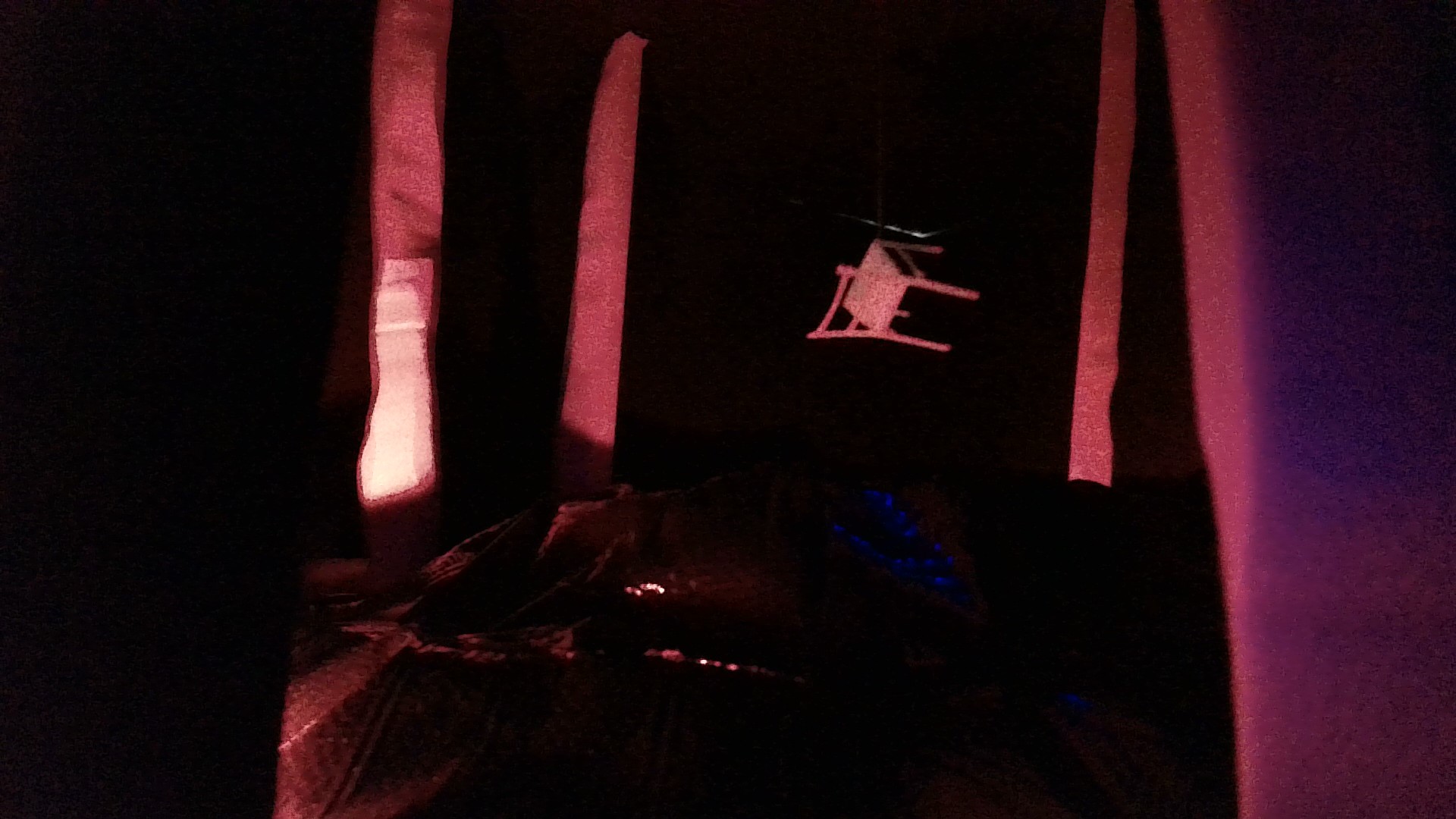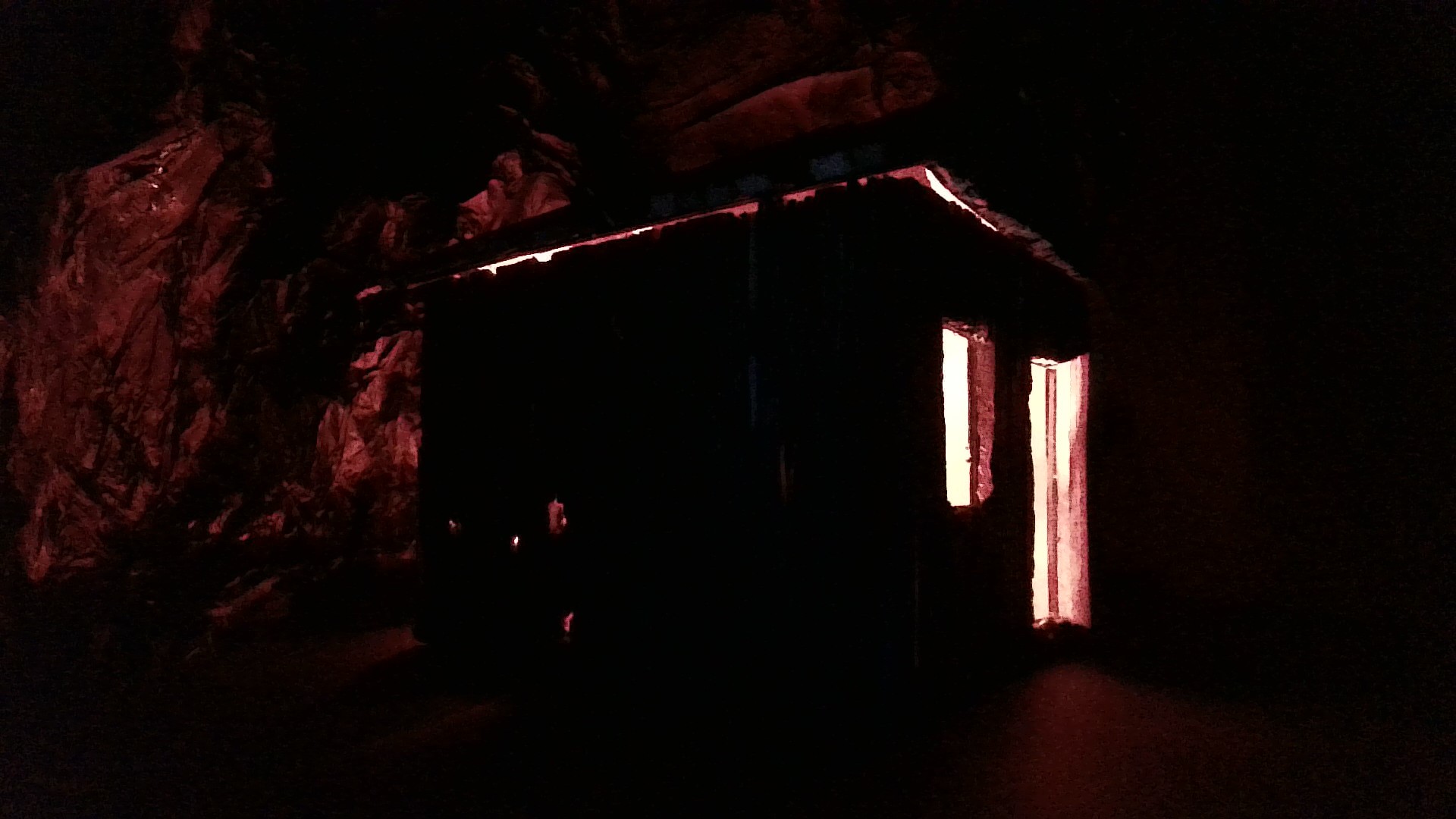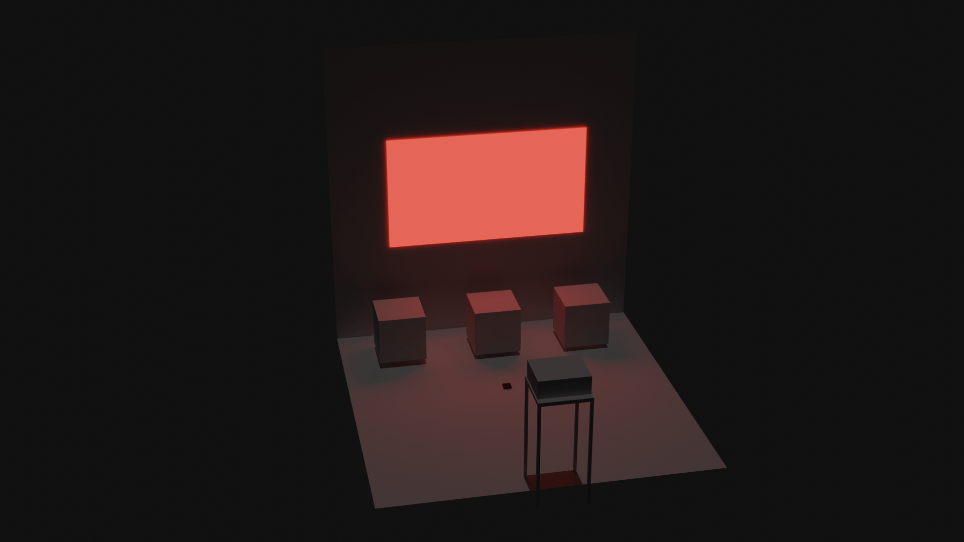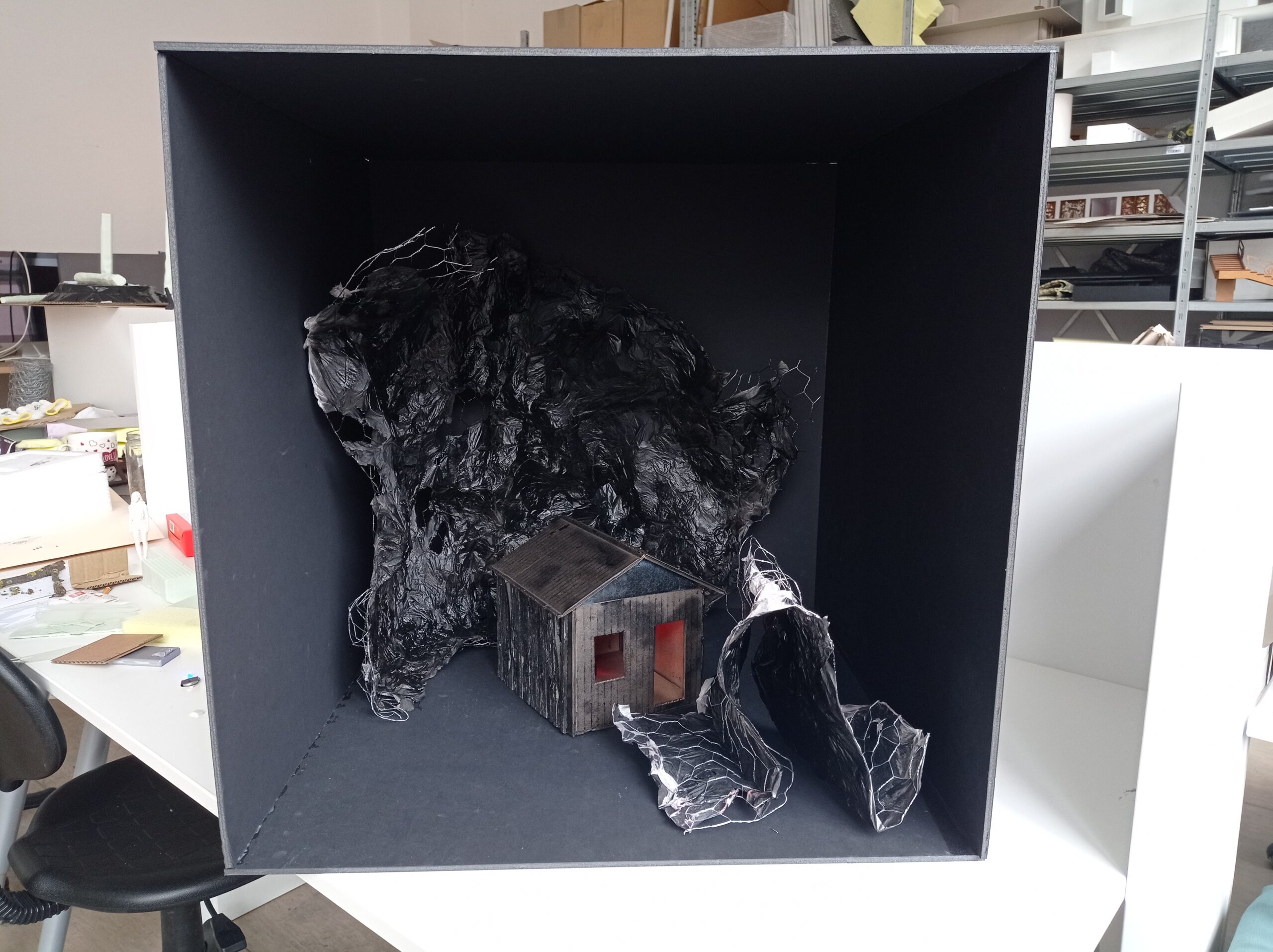 projekcie videa z troch uzatvorených boxov, v ktorých sa nachádzajú diorámy,