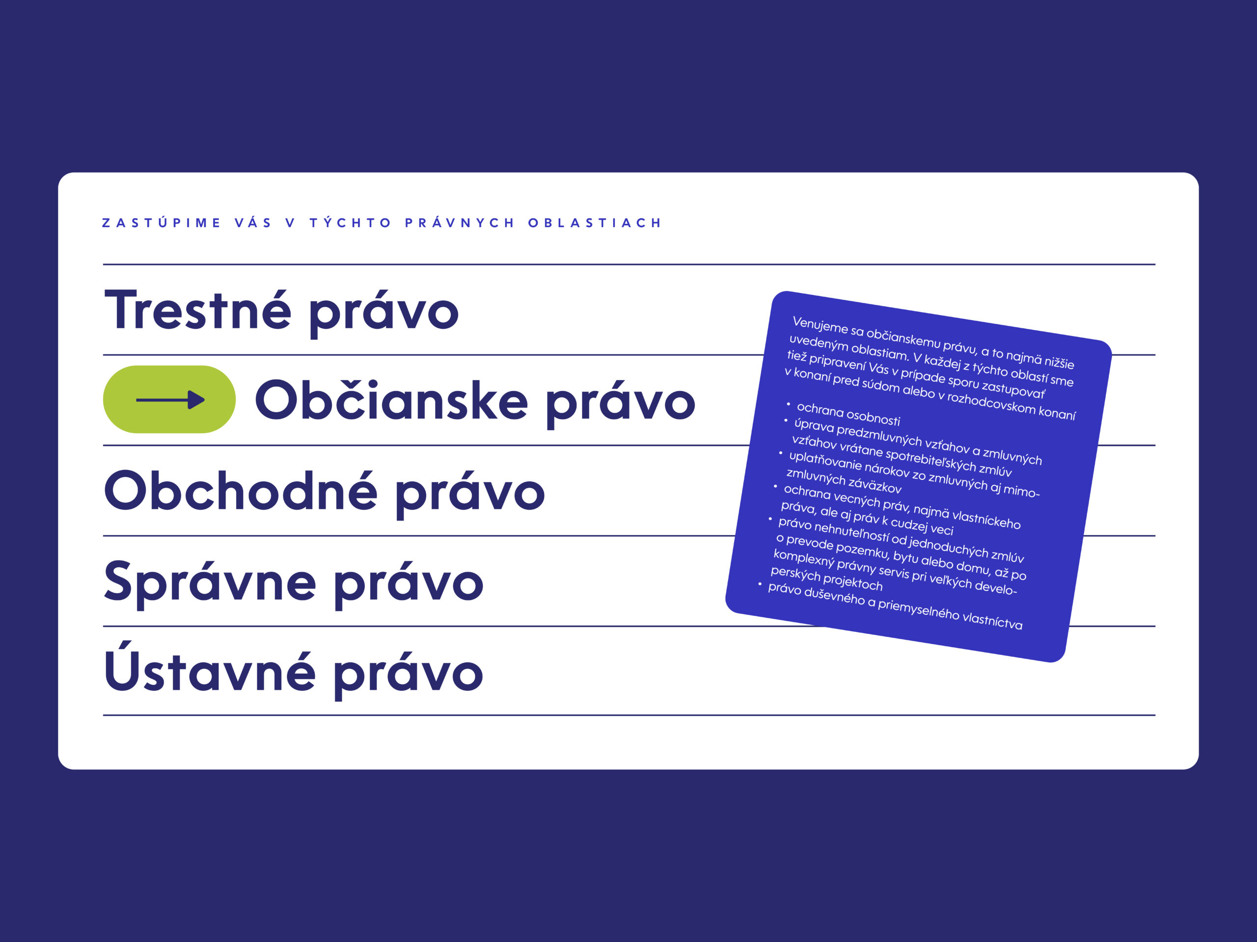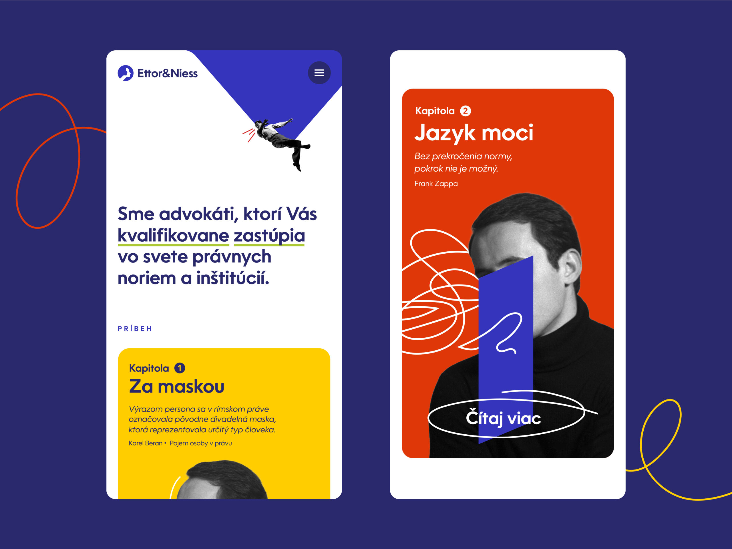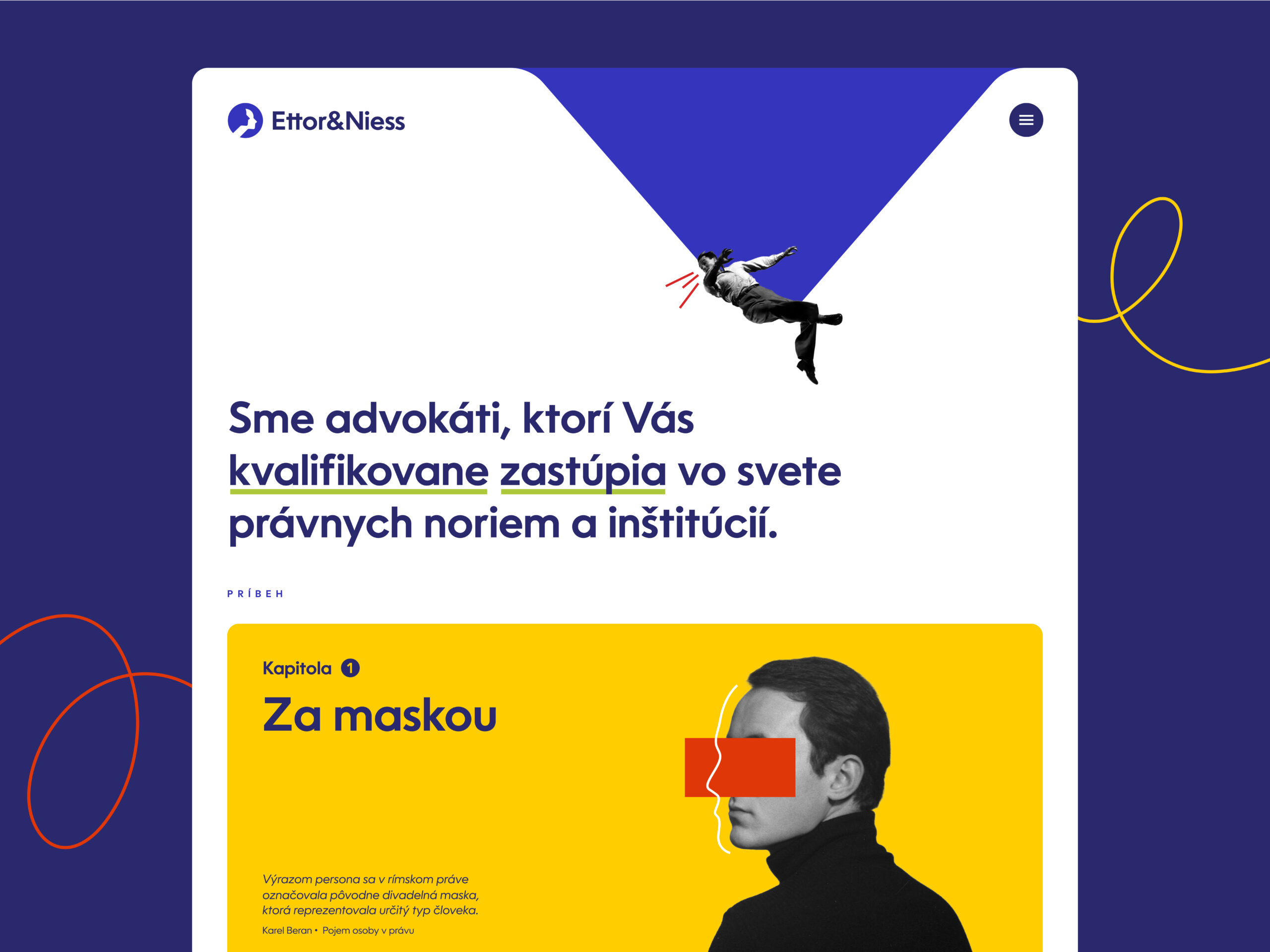 Pre obsahovú stránku webu je kľúčový storytelling, ktorý zrozumiteľne vysvetľuje dôležitosť úlohy advokáta pri riešení rôznych životných situácií. Na to tematicky nadväzujú autorské kolážové ilustrácie, ktorých primárnym cieľom je budovanie dôvery s klientom. Dizajn webu je postavený na spojení farebne výrazných plôch s čiernobielymi postavami odkazujúcimi na zastupovanie reálnych ľudí v právnom prostredí. Vďaka animáciám je celkový dojem z prechádzania webu veľmi plynulý.