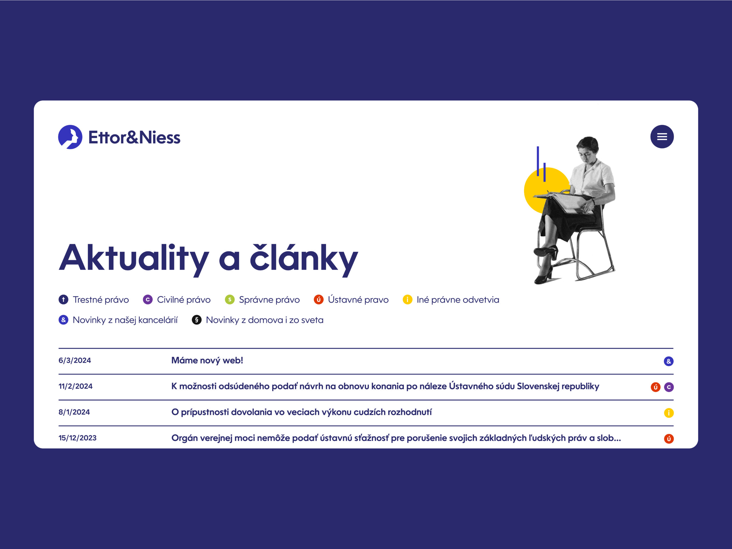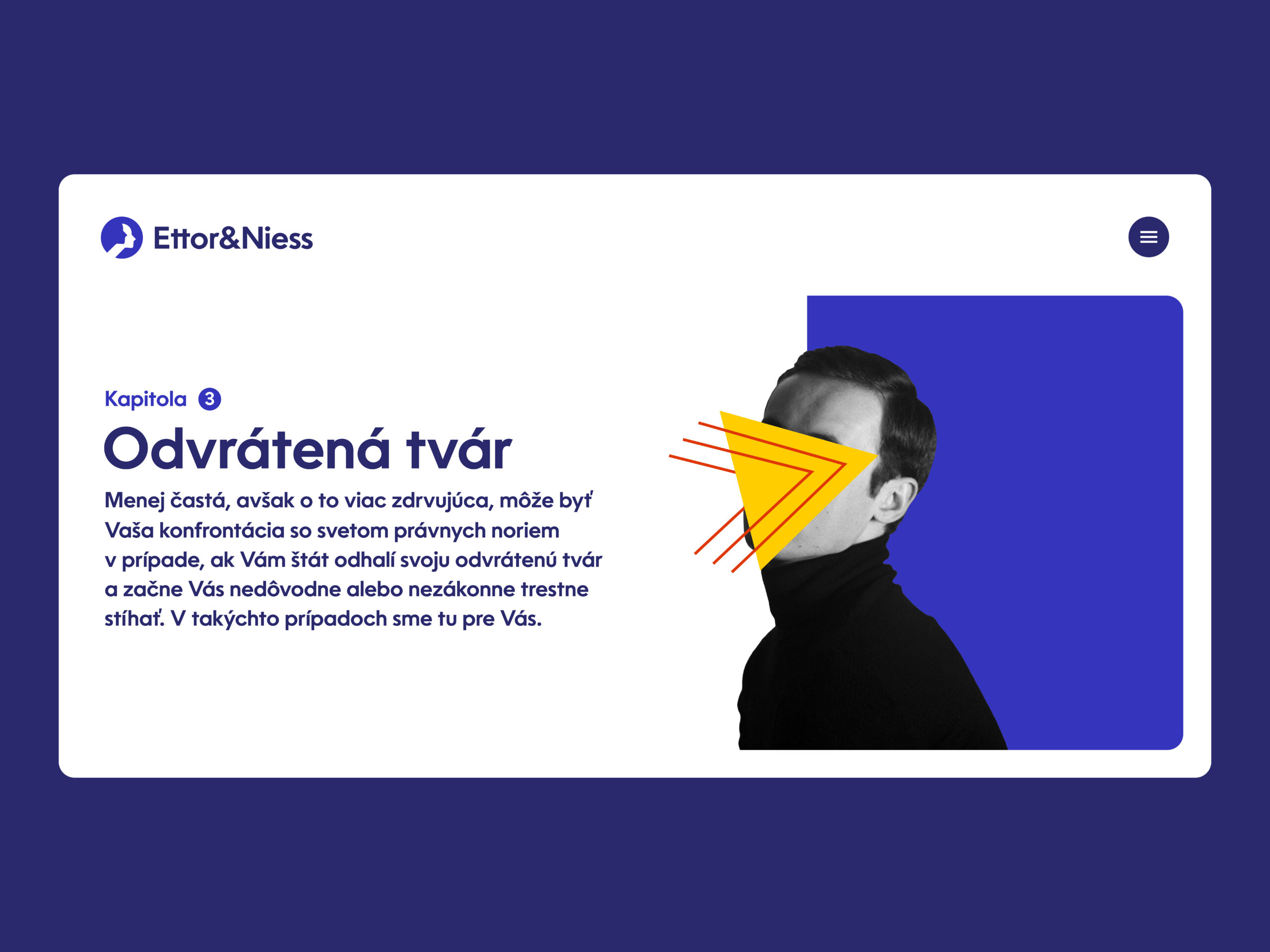 Kľúčovým aspektom pri tvorbe webovej stránky spoločnosti Ettor & Niess bola potreba odlíšiť sa od bežnej konzervatívnej prezentácie advokátskych kancelárií, ktorým chýba nápad a odvaha. Vďaka tomu vznikla inovatívna a výrazná prezentácia, ktorá svojou podobou prekračuje zažité štandardy.
