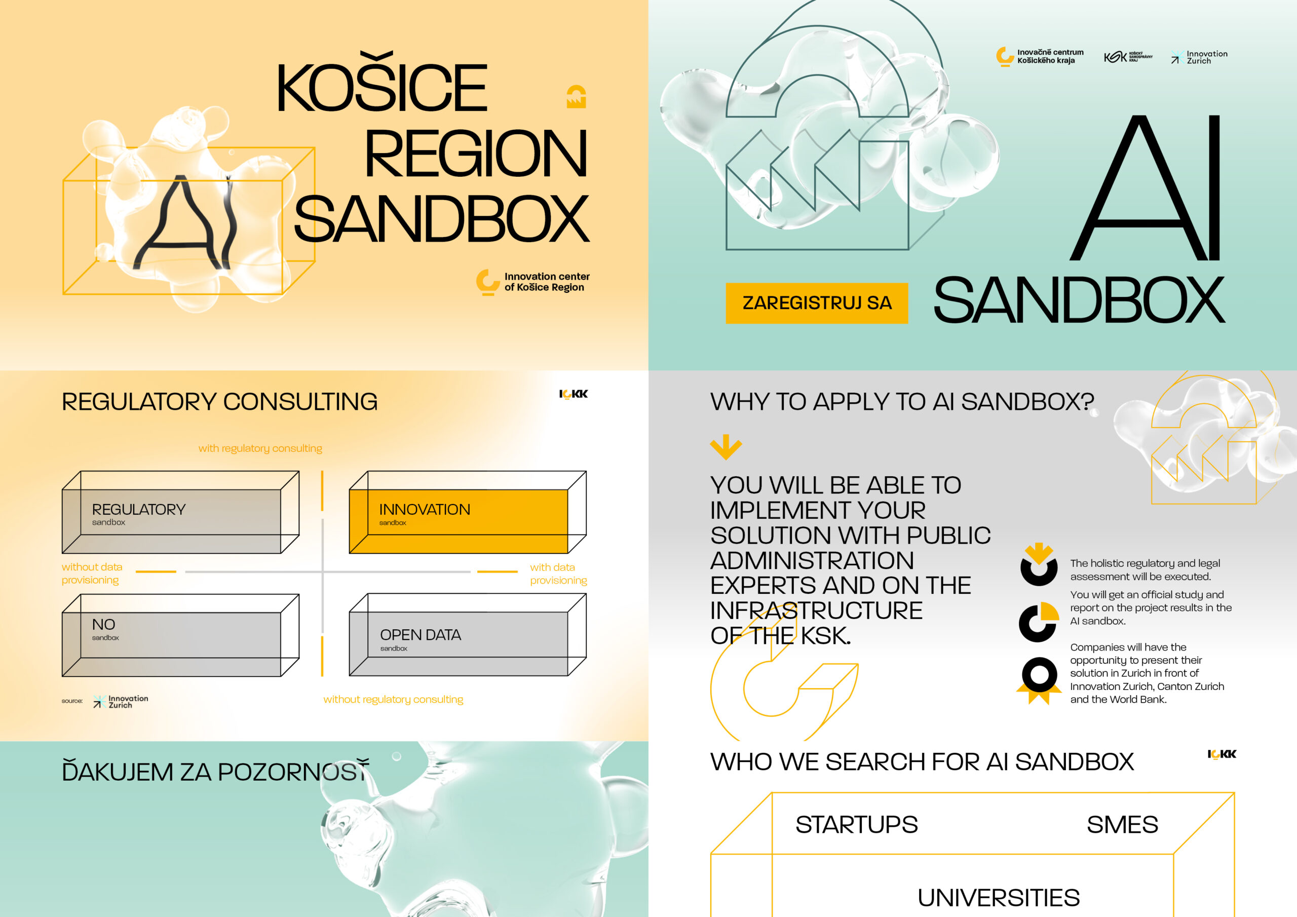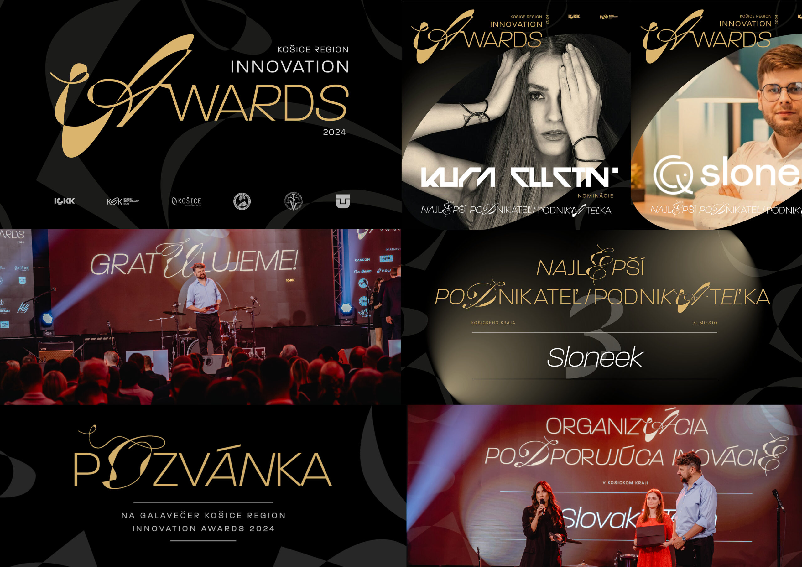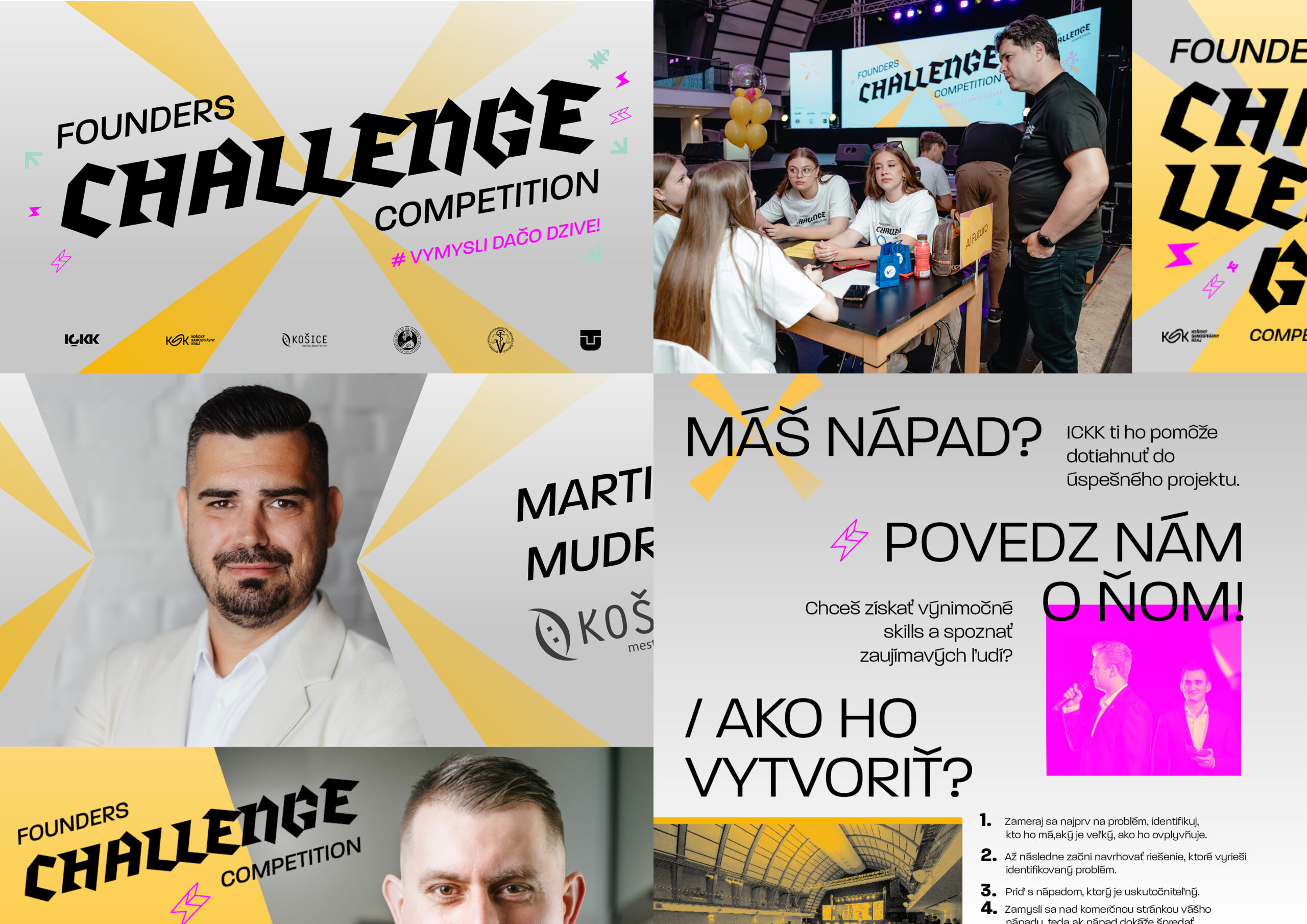 Redizajn Inovačného centra Košického kraja má za cieľ plynule nadviazať na pôvodný dizajn. Pracuje s dovtedajším nosným elementom – geometricky komponovaným C v žlto-čiernej farebnosti. Okrem revitalizácie lôg, pridania tyrkysovej a neónovej ružovej, či zmodernizovania typografie – pribúdajú aj vizuály pre rôznorodé projekty centra. Sú pripravené tak, aby každý mal svoju vlastnú nezávislú identitu, ktorá sa vyvíja v čase. Vzájomne ich všetky prepája jednotná typografia, plošné tvaroslovie, knižnica symbolov a značka ICKK. Doteraz sme realizovali podujatia Founders Challenge – stredoškolskú súťaž, Innovation Awards – slávnostný galavečer odovzdávania cien či AI Sandbox, kde sme hľadali odpoveď na vizualizáciu AI ako elementu z neznámej budúcnosti, vyvarujúc sa použitiu neónových androidov.
