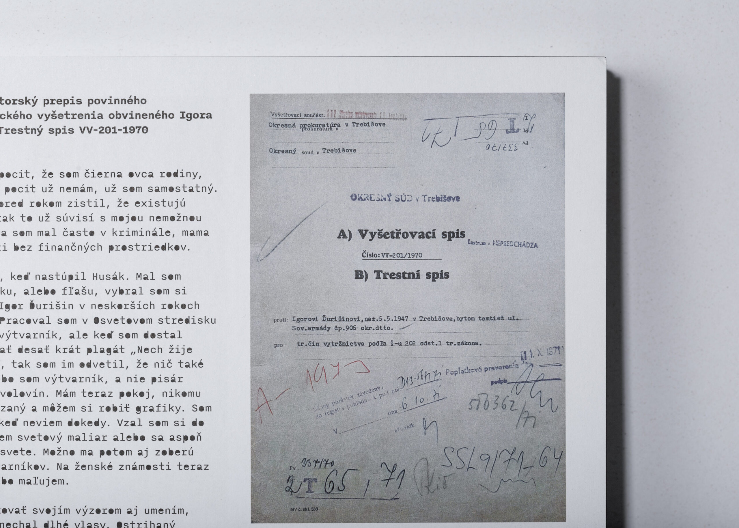 Dizajn monografie umelca Igora Ďurišina (formát, väzba, layout, typografia) s bohatým obrazovým a fotografickým materiálom, osobnými a odbornými textami, rozhovormi a súpisom diel má evokovať archívny materiál. Kolážový spôsob (typický pre autorovu tvorbu) využitý v grafickej úprave prostredníctvom recyklácie autentických fragmentov z autorovho diela konzistentne prepája Ďurišinov výtvarný prejav s dizajnom publikácie. Znovuobjavenie košického undergroundového umelca Igora Ďurišina, ktorý v 80. rokoch emigroval do Nemecka a nadlho ostal doma v zabudnutí, sa udialo vďaka bádateľskému úsiliu zberateľa umenia Martina Ftáčnika.