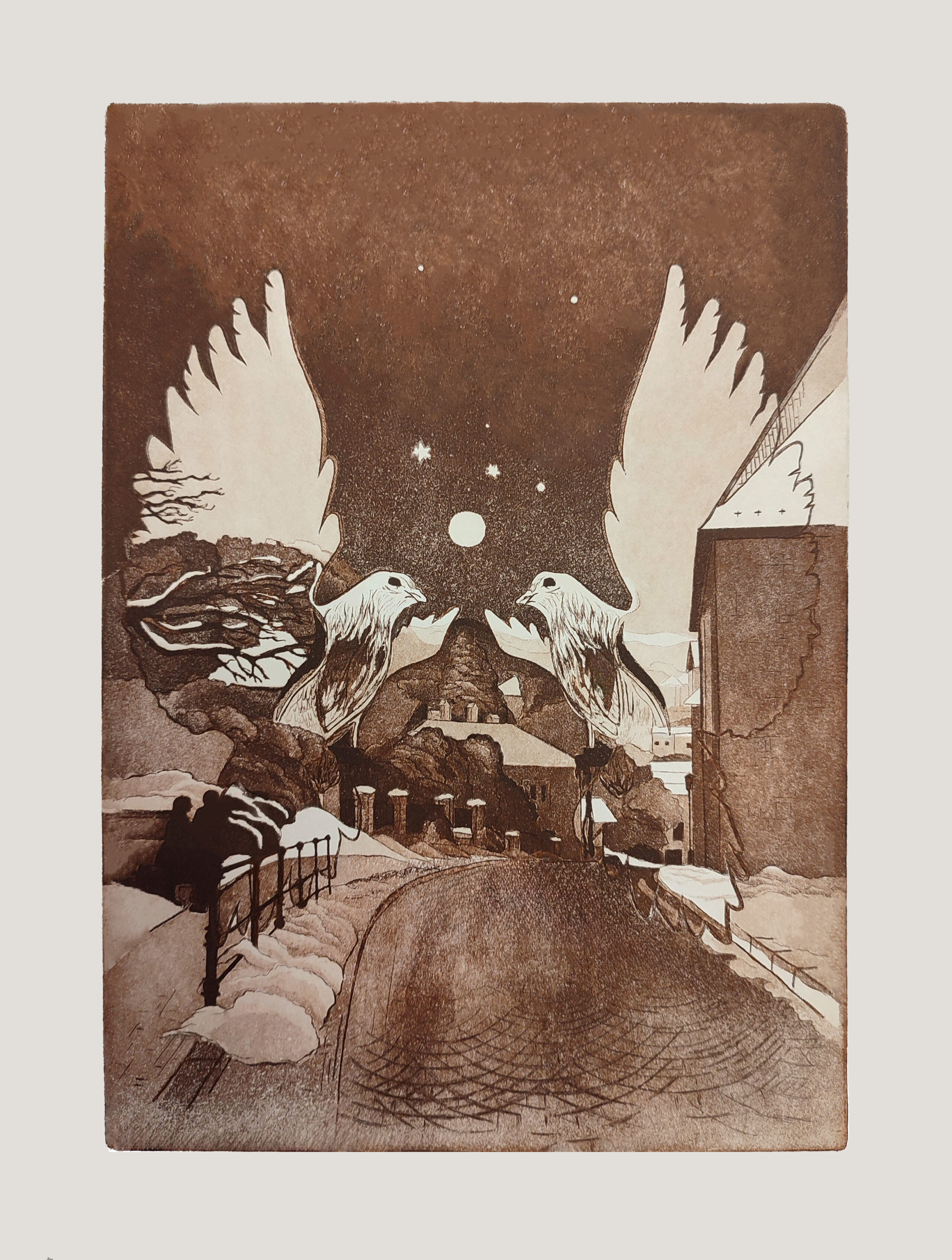 Zámerom práce bolo prepojiť symbol oblasti citov lásky, mieru, ľahkosti prinášajúca nádej dve biele holubice, ktoré podporujú ideu idylického vzťahu a harmónie medzi dňom a nocou. Celá kompozícia zachytáva dualitu dňa a noci, svetla a temnoty, kontrasty, ale zároveň prirodzené cykly, kde jeden nemôže existovať bez druhého. Celá myšlienka je zachytená na zrkadlovo prevrátenom pohľade na Akademickú ulicu v Banskej Štiavnici, kde sídli moja škola. Zrkadlový pohľad v spojení dvoch holubíc má symbolizovať nádej a vieru v lepšie zajtrajšky.