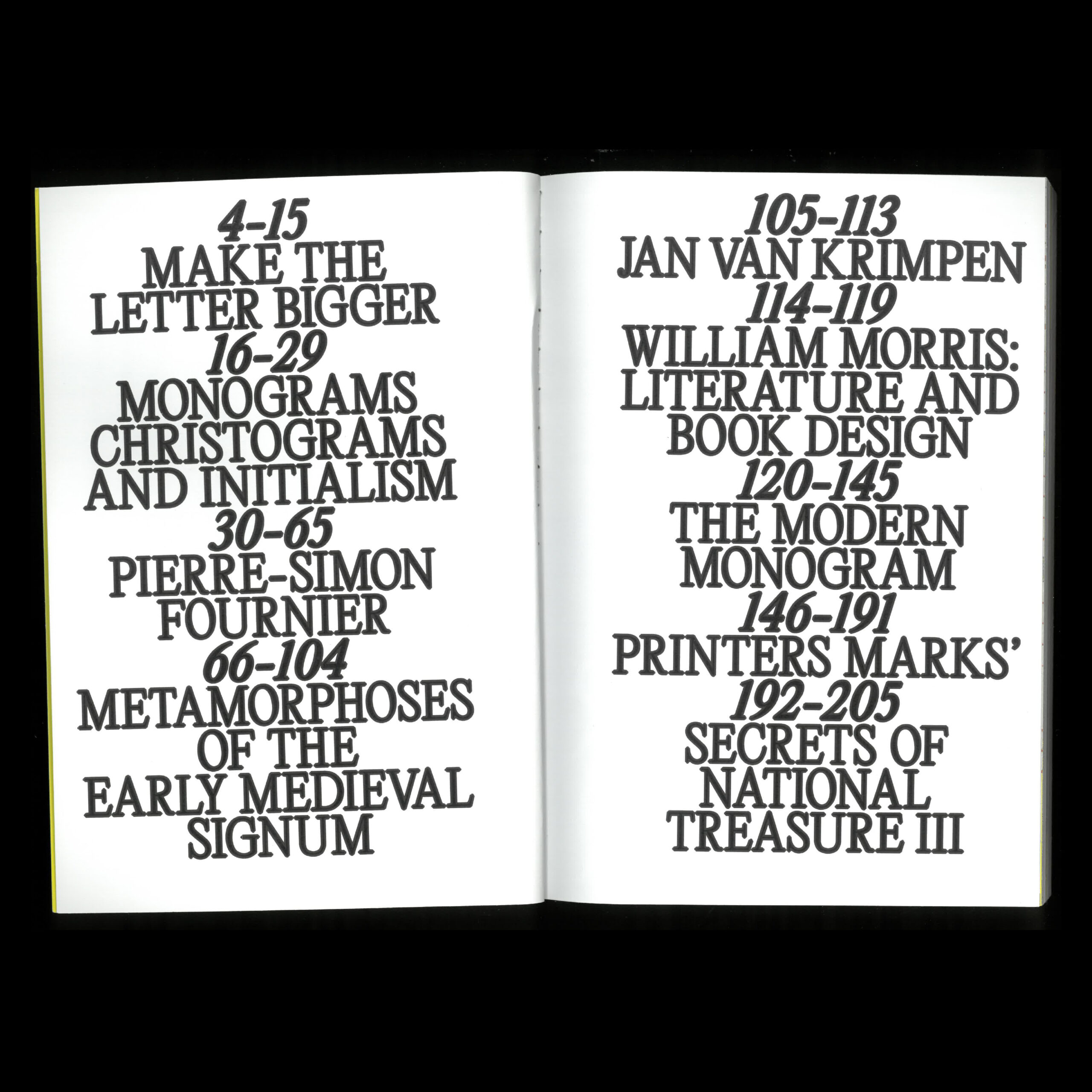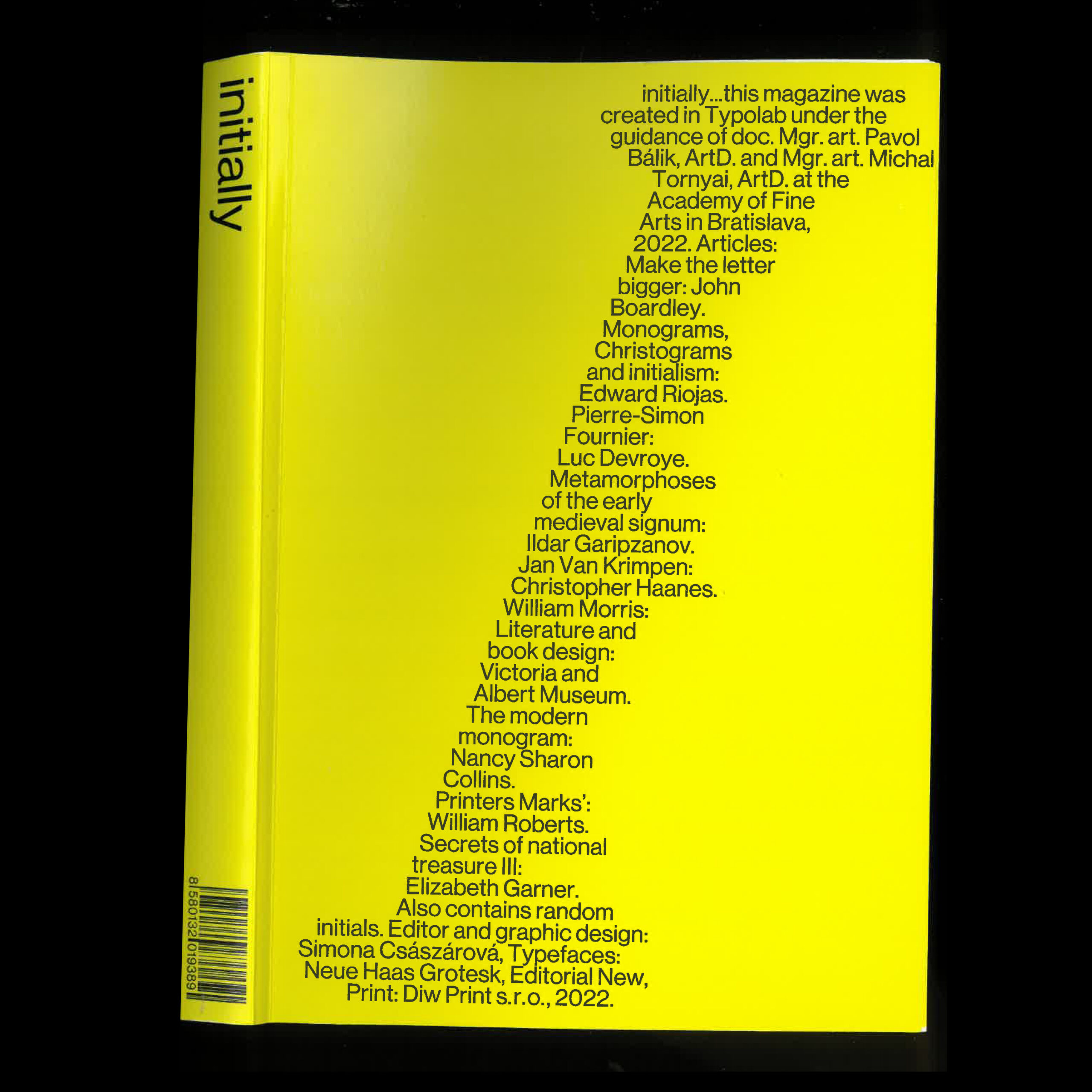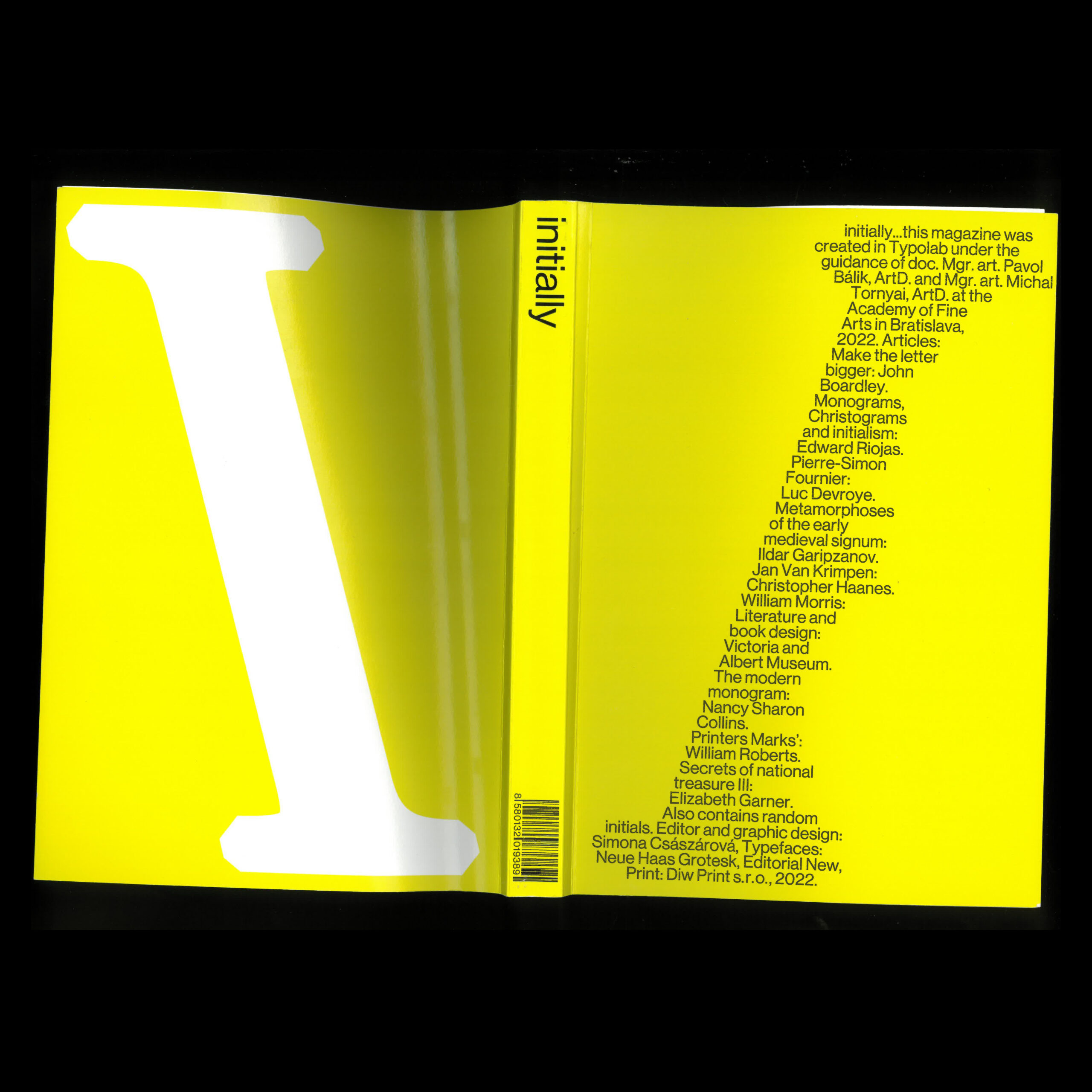 Initially je fenomenologický magazín, ktorý sa zaoberá témou iniciál od histórie až po súčasnosť. Obsahuje 9 článkov ako napríklad pôvod ranostredovekých znakov či účel iniciál v histórii až po moderné monogramy, alebo iniciály známych osobností ako boli William Morris či Pierre-Simon Fournier. Každý článok využíva iný typ sadzby. Čo bolo pred začiatkom? Pravdepodobne koniec, tak ako je aj tiráž na obálke.