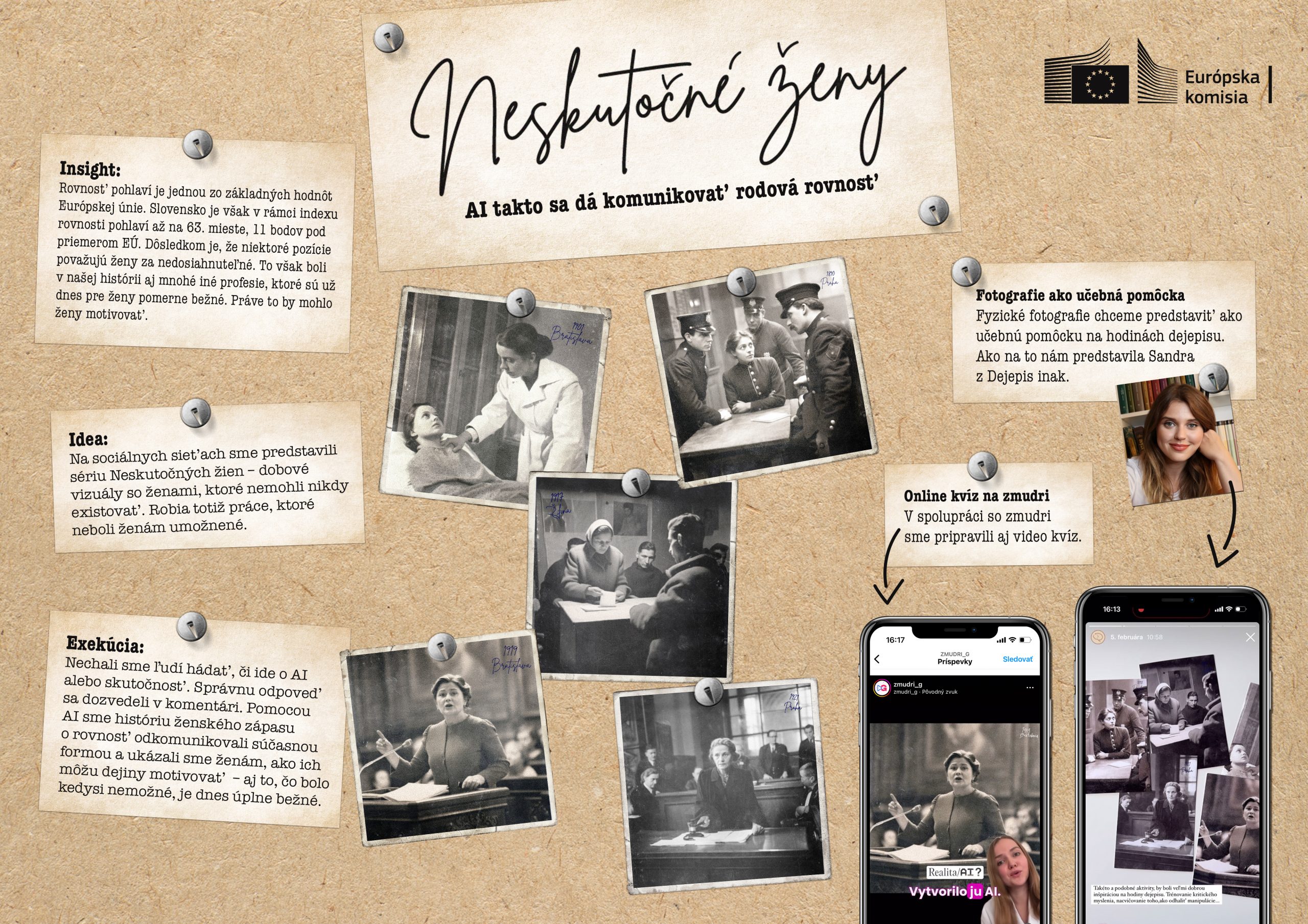 Rovnosť pohlaví je jednou zo základných hodnôt Európskej únie. Slovensko je však v rámci indexu rovnosti 11 bodov pod priemerom EÚ. Dôsledkom je, že niektoré pozície považujú ženy za nedosiahnuteľné. To však boli v našej histórii aj mnohé iné profesie, ktoré sú už dnes pre ženy pomerne bežné. Aby sme ženy oboznámili s touto históriou a zároveň ich motivovali, predstavili sme im sériu Neskutočných žien – dobové vizuály so ženami, ktoré nemohli nikdy existovať. Robia totiž práce, ktoré neboli ženám umožnené. Nechali sme ľudí hádať, či ide o AI alebo skutočnosť. Správnu odpoveď sa dozvedeli v komentári. Pomocou AI sme históriu ženského zápasu o rovnosť odkomunikovali súčasnou formou a ukázali sme ženám, ako ich môžu dejiny motivovať – aj to, čo bolo kedysi nemožné, je dnes bežn