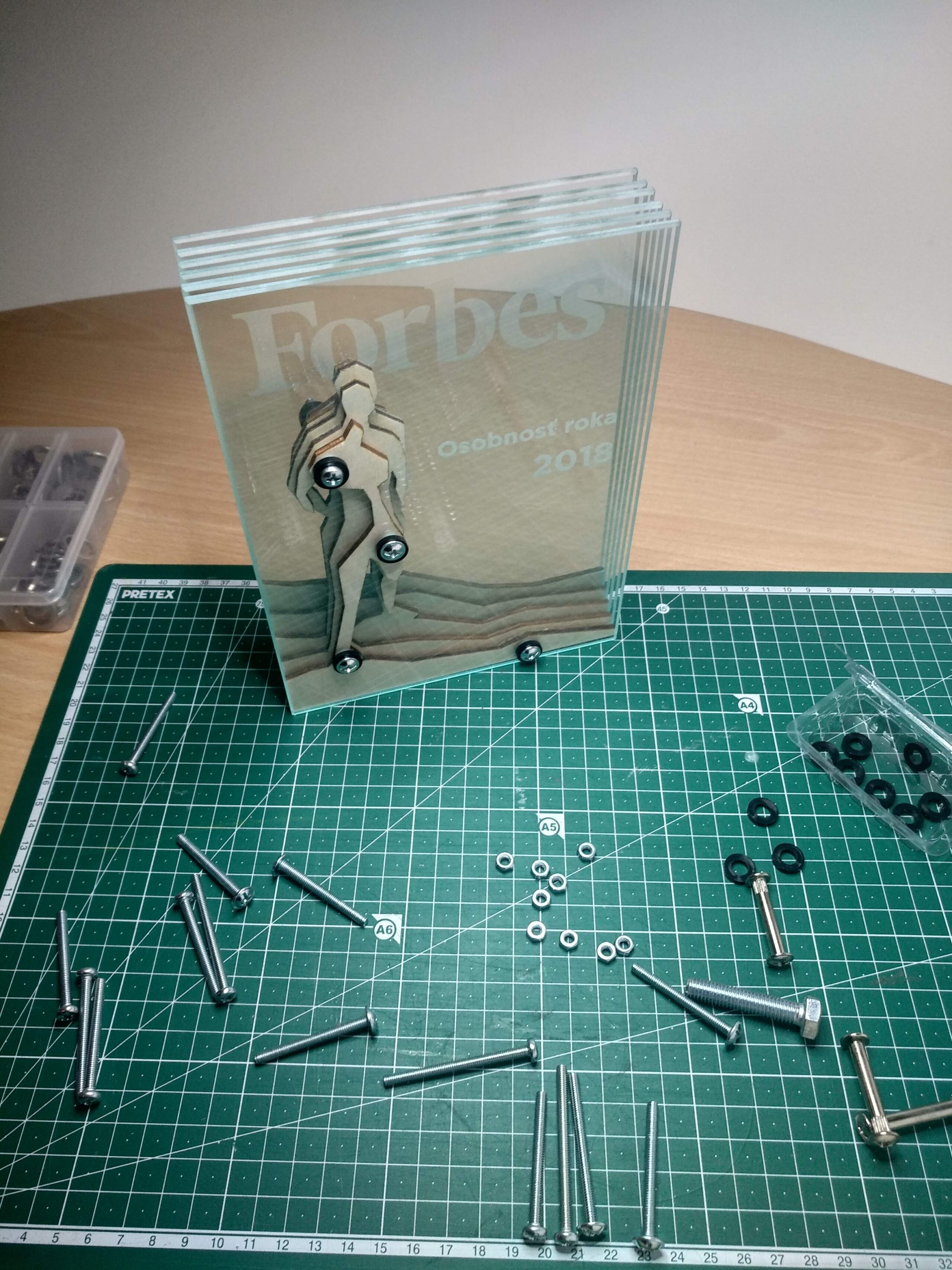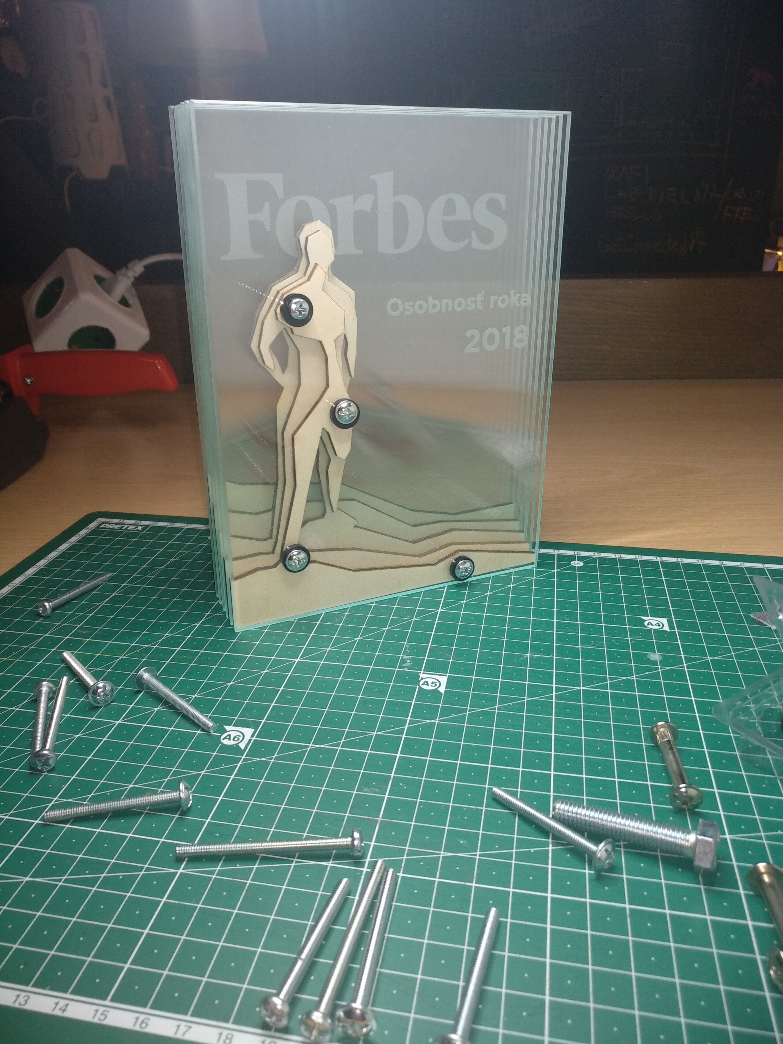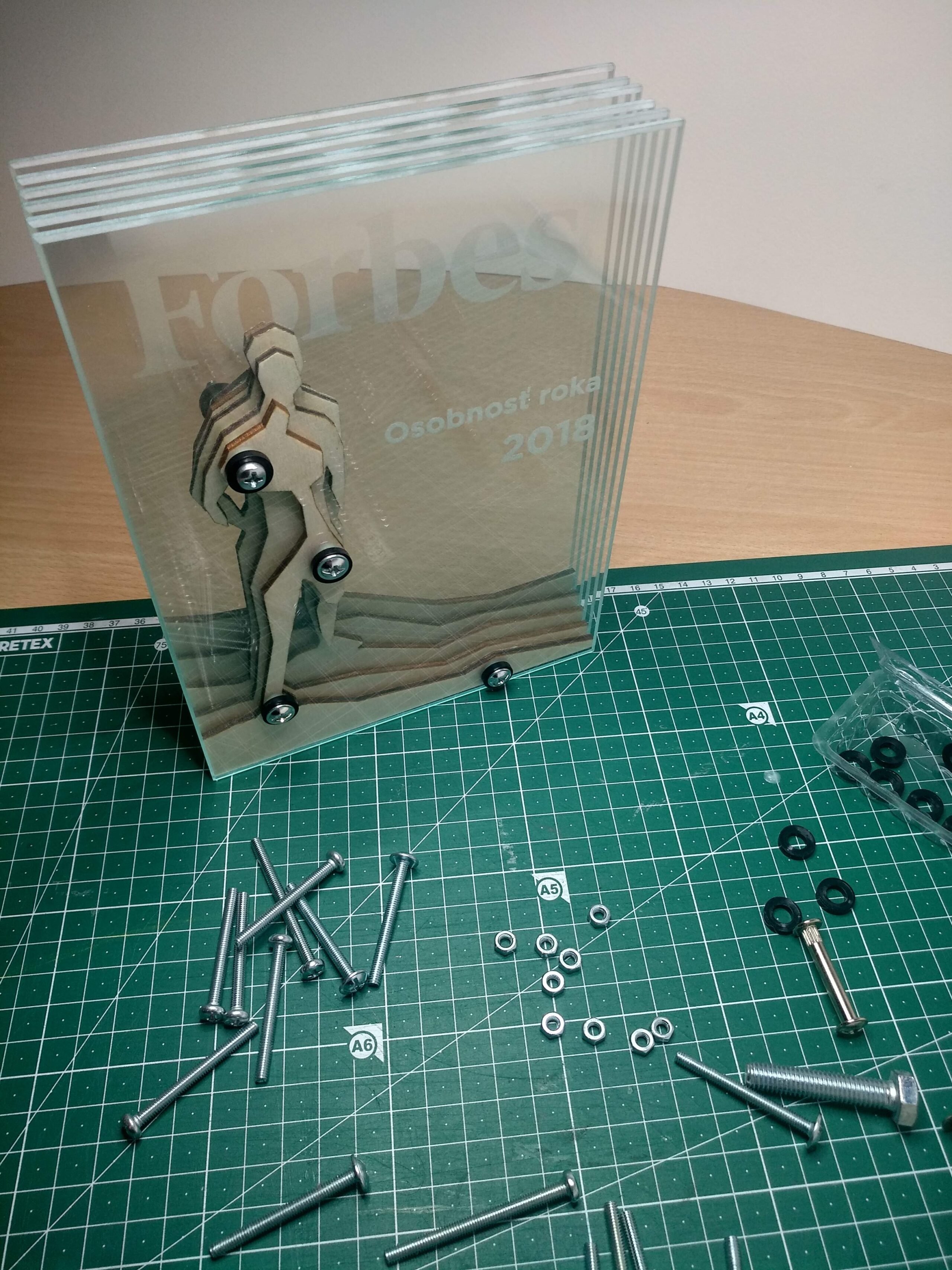 Toto unikátne ocenenie je navrhnuté tak, aby oslávilo významné úspechy a osobnosť roka. Vyrobené z precízne vrstveného skla a bukovej preglejky, ktoré spolu tvoria nápadnú siluetu osobnosti pri pohľade z predu. Vnútorné vrstvy bukovej preglejky sú starostlivo umiestnené medzi vrstvami číreho skla, čím vytvárajú fascinujúci vizuálny efekt hĺbky a dimenzie. Tento dizajn nie len vizuálne zaujme, ale aj symbolicky odráža hĺbku a komplexnosť oceneného jedinca. Rozmery ocenenia pripomínajú magazín Forbes, čo dodáva štýlový a moderný kontext, ideálny pre prezentáciu v prestížnych a významných priestoroch. Toto ocenenie je dokonalým uznáním pre tých, ktorí formujú a inšpirujú našu spoločnosť.