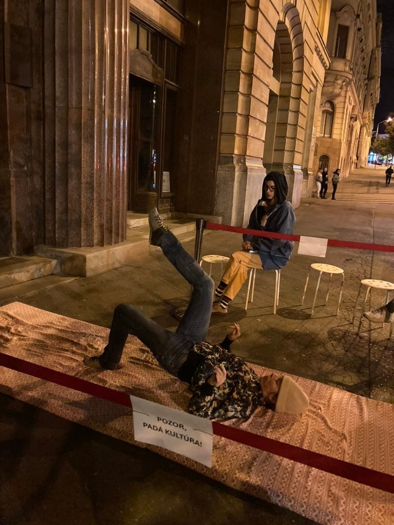 Dizajn ako umelecký aktivizmus. Textilné dielo reaguje na stav kultúry na Slovensku. Látka s vytkanými štylizovanými štátnymi znakmi bola pôvodne vystavená ako „Červený koberec“ počas BDW 2018. Inštalácia vtedy ponúkala možnosť našliapnuť na otázky národnej identity a hodnoty dizajnérskeho diela. Látka z pôvodného diela sa tento rok stala súčasťou 24 h. performancie „Pozor, padá kultúra!“, kde sa transformovala na mäkký záchranný objekt pre fyzické pády performerov, odohrávajúce sa pred MKSR. Opotrebovanie a proces ničenia kedysi honosného diela naznačujú stav, v akom sa kultúra nachádza. Počas performancie boli organizátori donútení odstrániť artefakty a padalo sa ďalej v daždi na tvrdý asfalt. Dielo sa zarámovaním a vystavením stáva mementom doby a skazy, ktorú zanecháva arogancia moci.
