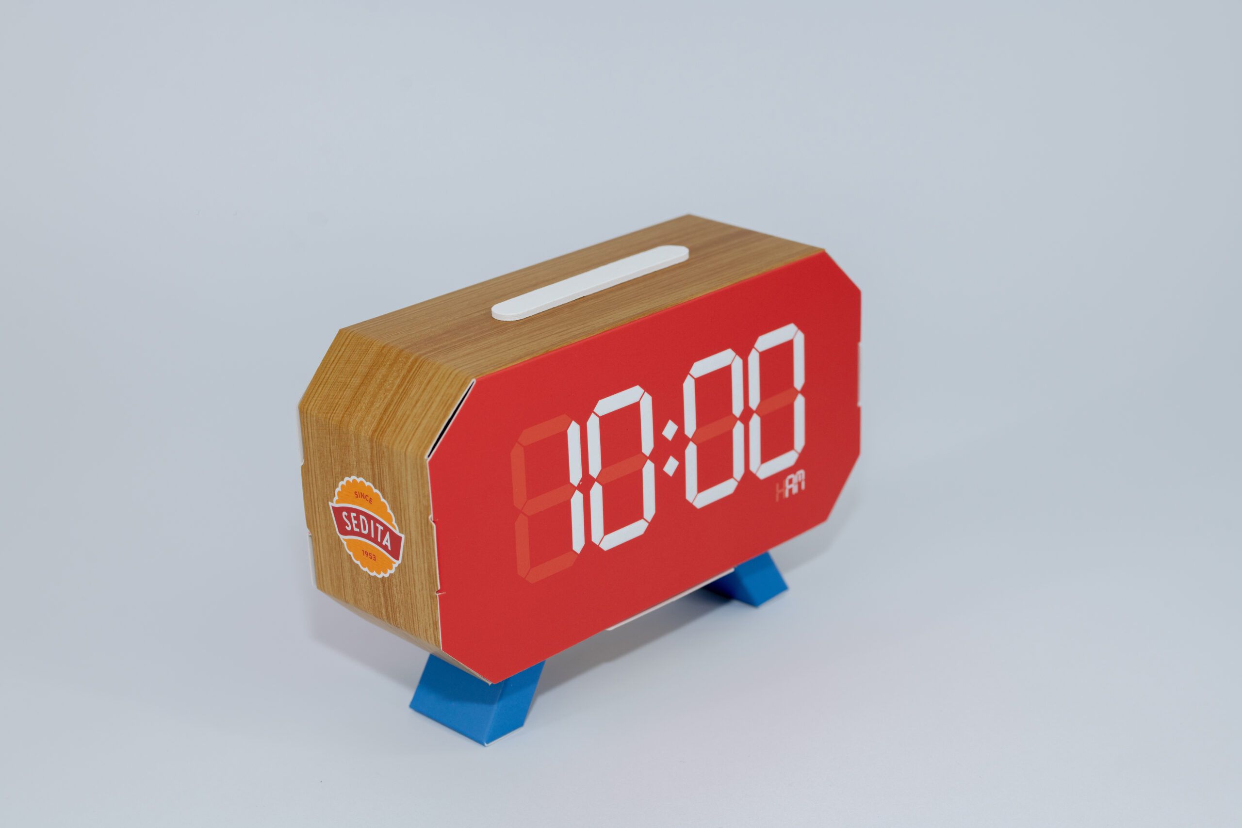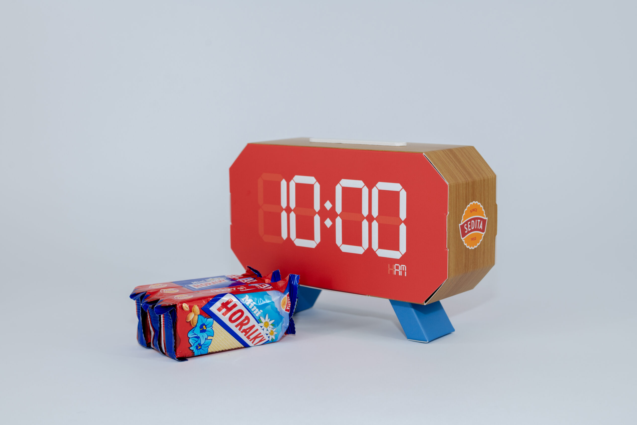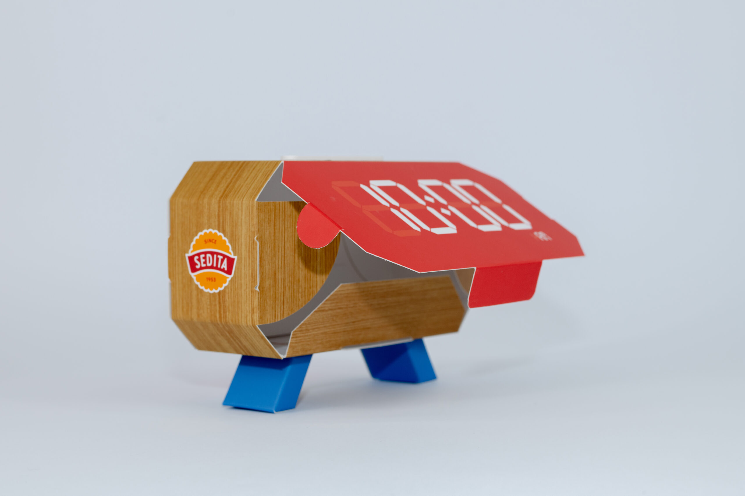 Retro budík je kompletne vyrobený z papiera, vrátane nožičiek, ktoré boli starostlivo navrhnuté a konštrukčne prispôsobené tak, aby ich bolo možné jednoducho vyrobiť z papiera. Tento papierový obal realisticky napodobňuje vzhľad tradičného budíka s elegantným otváraním a slúži ako sekundárny obal pre obľúbené slovenské keksíky. Nožičky sú pevné a stabilné, vďaka špeciálnemu dizajnu a konštrukcii, ktoré zabezpečujú ich odolnosť a funkčnosť. Tento obal bol vytvorený s cieľom dosiahnuť maximálnu podobnosť s retro budíkom, čo sa podarilo vďaka precíznemu spracovaniu a premysleným detailom. Papierový materiál je ekologický a estetický. Dizajn obalu evokuje nostalgiu a pôsobí autenticky, čo ho robí atraktívnym pre milovníkov retro štýlu aj pre fanúšikov kreatívneho a inovatívneho balenia.
