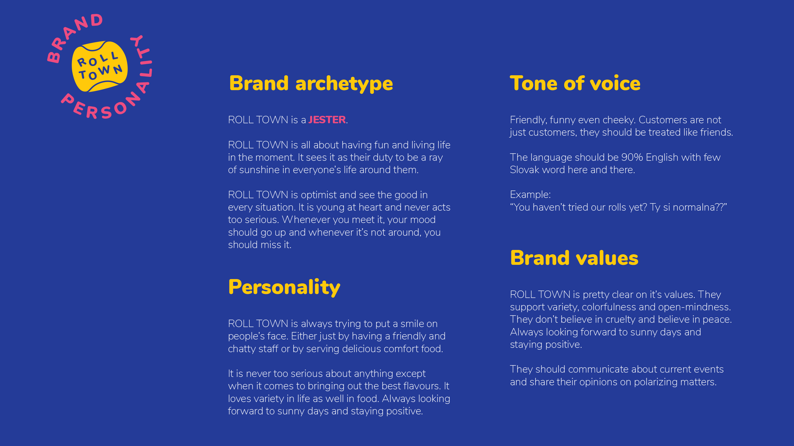 Roll Town je streetfood ponúkajúci fusion tureckej a indickej kuchyne. Našou úlohou bolo vytvoriť logo a identitu značky vrátane jej osobnosti a tone of voice tak, aby odrážala priateľskú povahu jej zakladateľov. V rámci tohto návrhu sme navrhli logo, prvky vizuálnej identity, polep samotného food trucku a podporné tlačoviny. Vďaka hravému a pestrofarebnému návrhu, ktorý spája farebnosť a pestrosť oboch krajín, je Roll Town jednoducho rozoznateľný a stal sa už populárny aj na najväčších hudobných festivaloch na Slovensku. V komunikácii sme použili lámanú slovenčinu Puneeta – zakladateľa – a premenili tak jeho nevýhodu zahraničného pôvodu na súčasť značky, ktorá naopak pôsobí v rámci budovania brandu pozitívne.