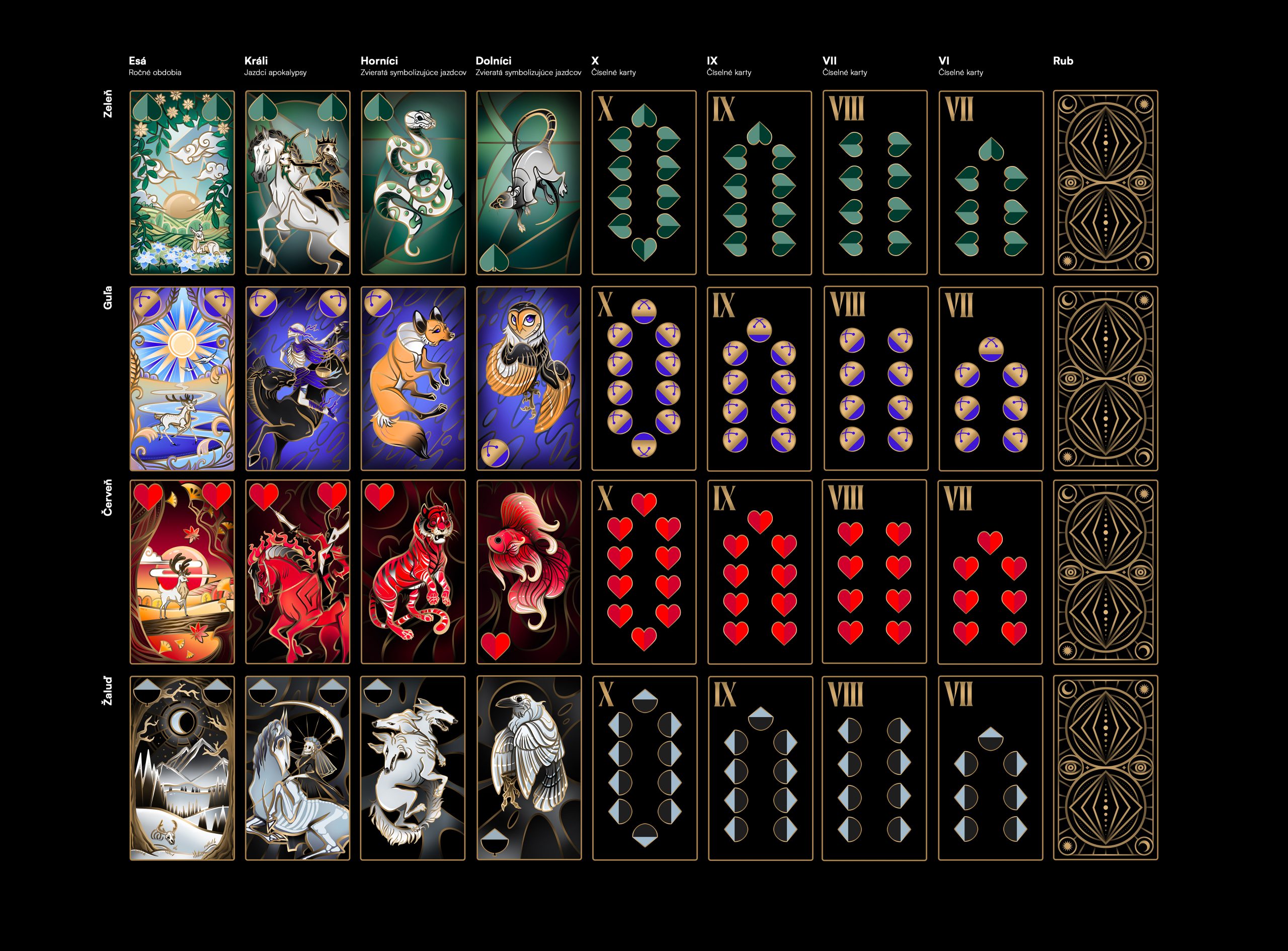 Toto dielo je praktickou časťou bakalárskej práce s názvom Dizajn sady hracích kariet — história a súčasnosť. Témou praktickej časti tejto práce bolo zhotoviť sadu sedmových kariet. Karty sú zhotovené digitálne. Autorský návrh štylizovaných ilustrácií na hracích kartách je inšpirovaný hlavne vitrážou a umenením vyrezávania z papiera.