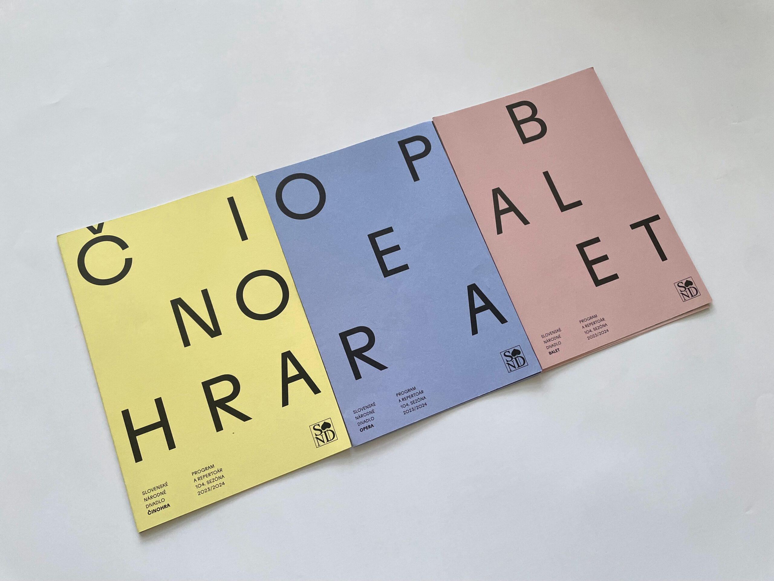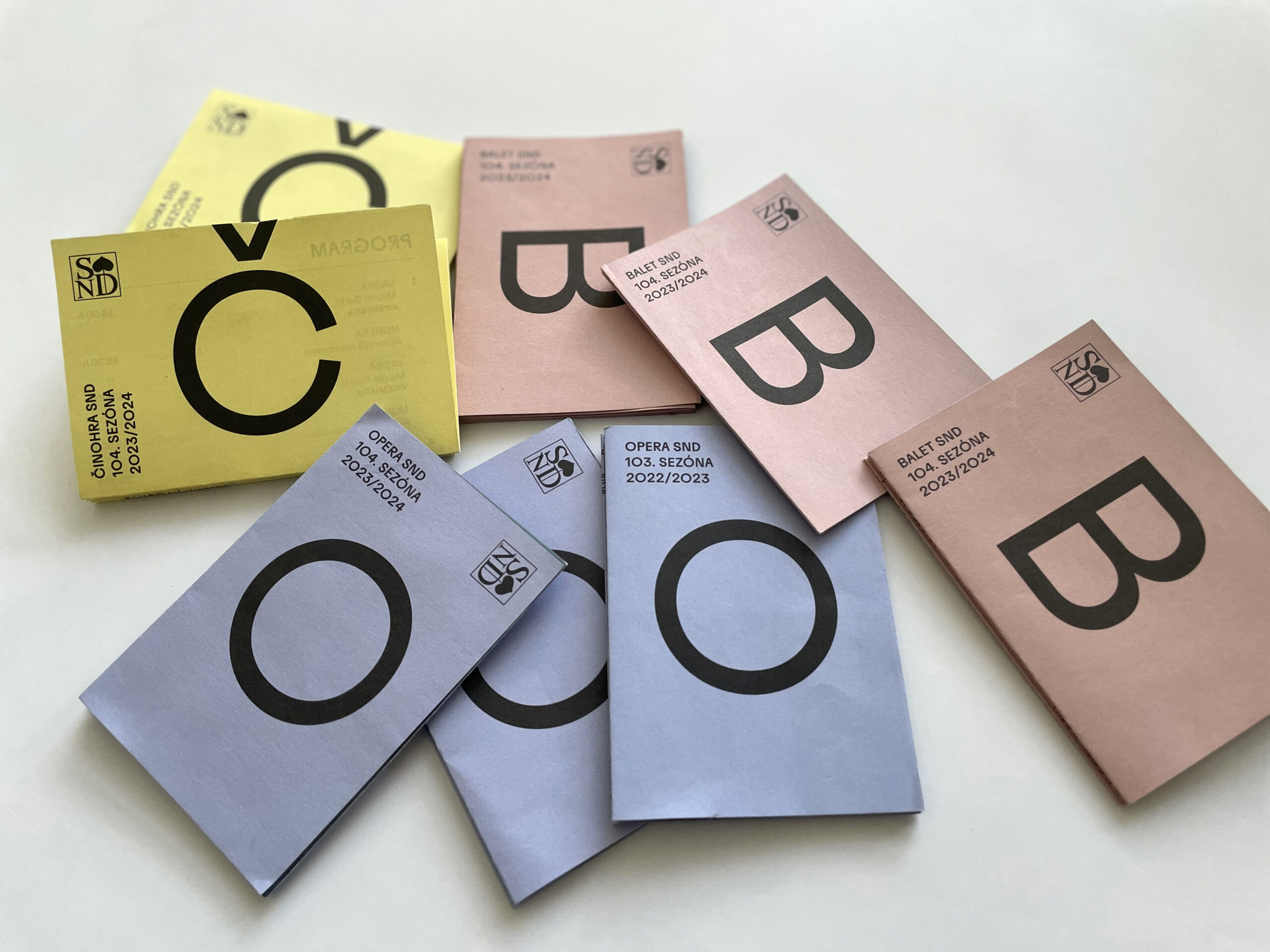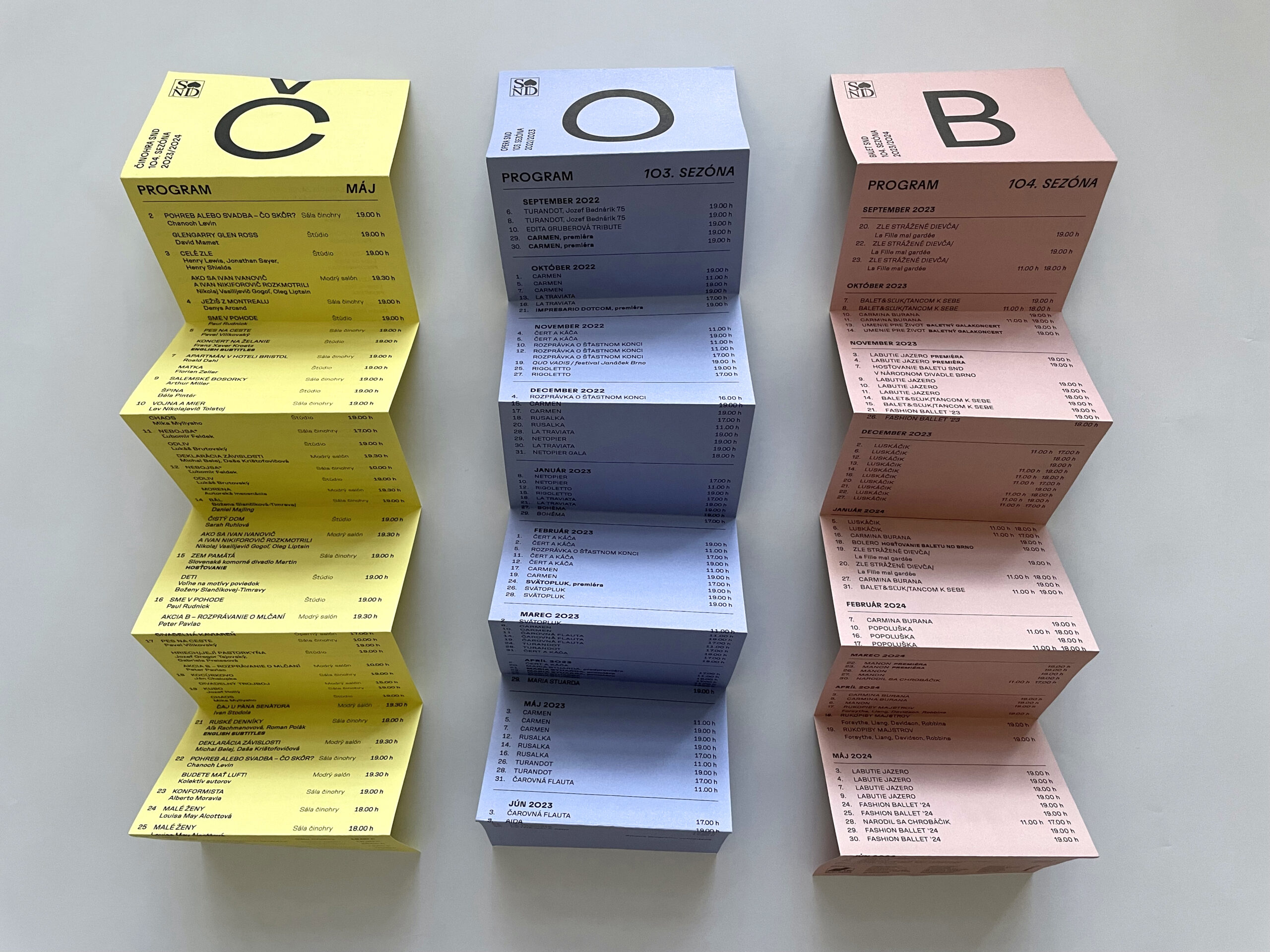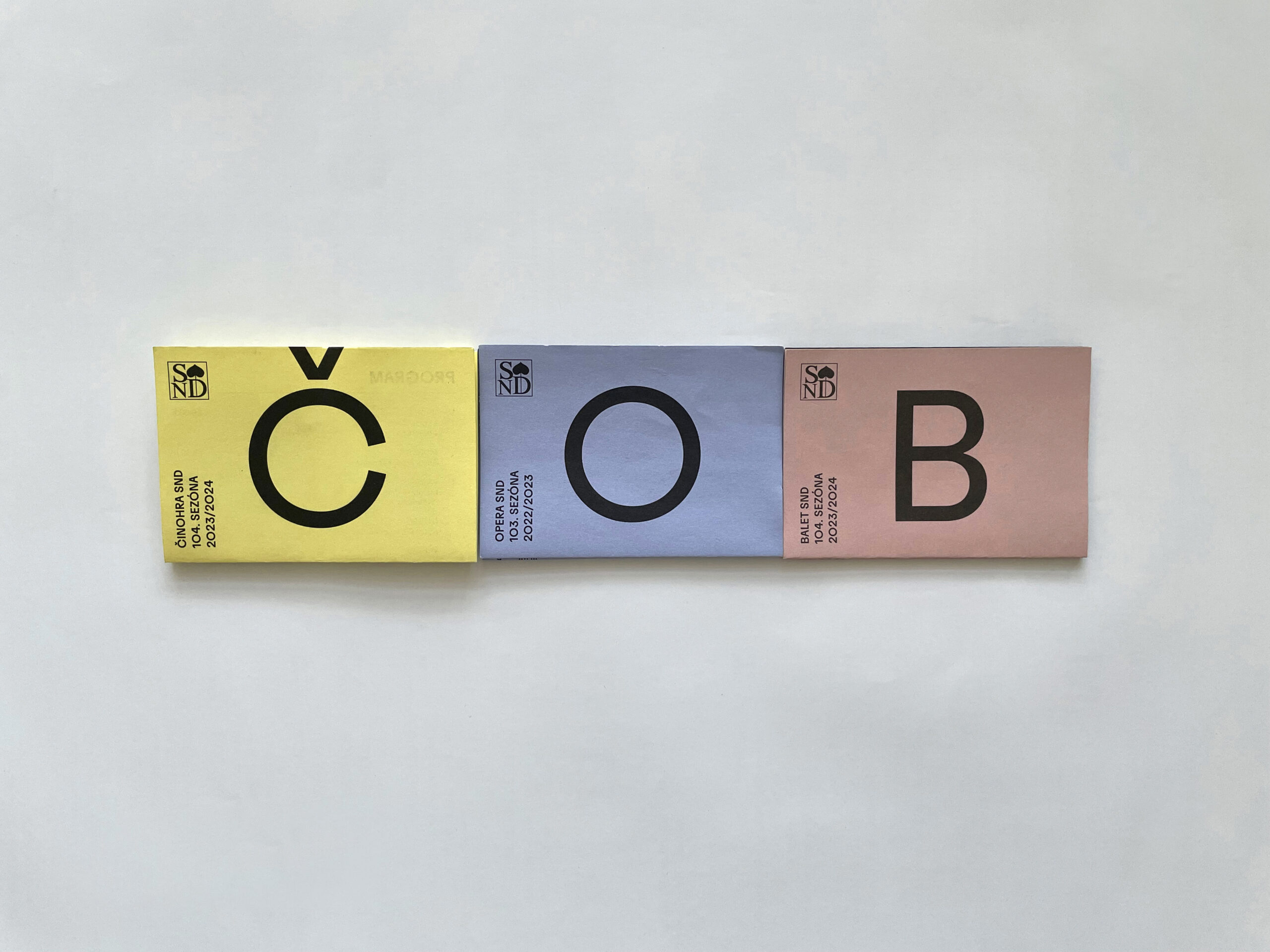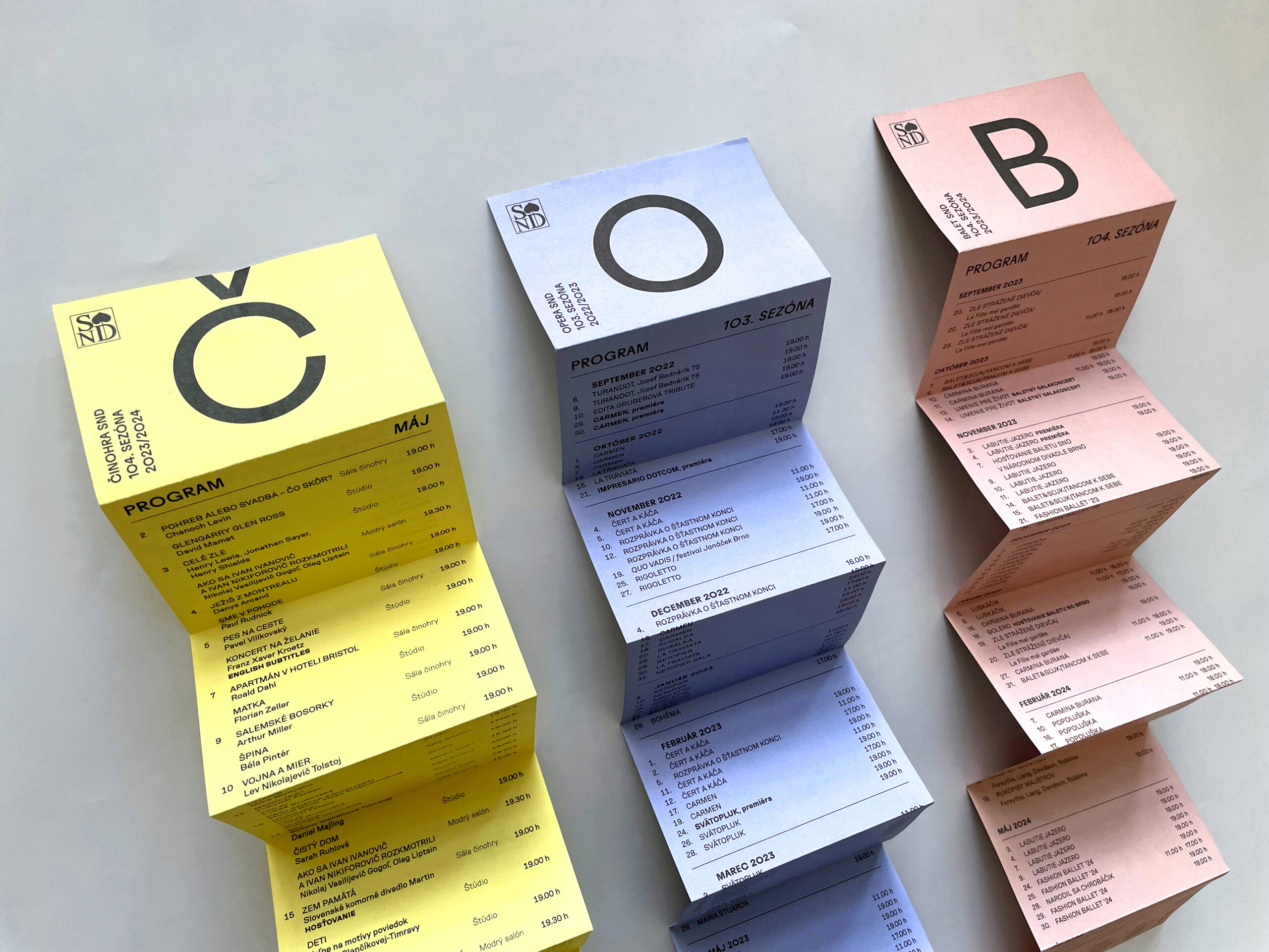 Už dve sezóny Slovenské národné divadlo komunikuje premiéry, repertoár a špeciálne projekty svojich troch súborov jednotne – pomocou väčších aj menších skladačiek v troch farbách – žltej, modrej a ružovej. Činohra sa dlhodobo stotožňovala so žltou farbou, modrá farba sa stala farbou pre verejnosť vážnym žánrom Opery SND a ružová farba baletných cvičiek, jemnosti a ladnosti sa stala farbou Baletu SND. Farby súborov a skladačiek sa stali určujúce aj pri iných komuniáciách, napr. na sociálnych sieťach. Väčšie skladačky boli navrhnuté v rovnakom formáte ako ročenka SND, menšie vo formáte A7 zase slúžia ako praktický mini-kalendár podujatí vreckového formátu. Typografické riešenie týchto materiálov je vizuálne prepojené s dizajnom ročenky SND, súbory identifikujeme často písmenami Č, O a B.