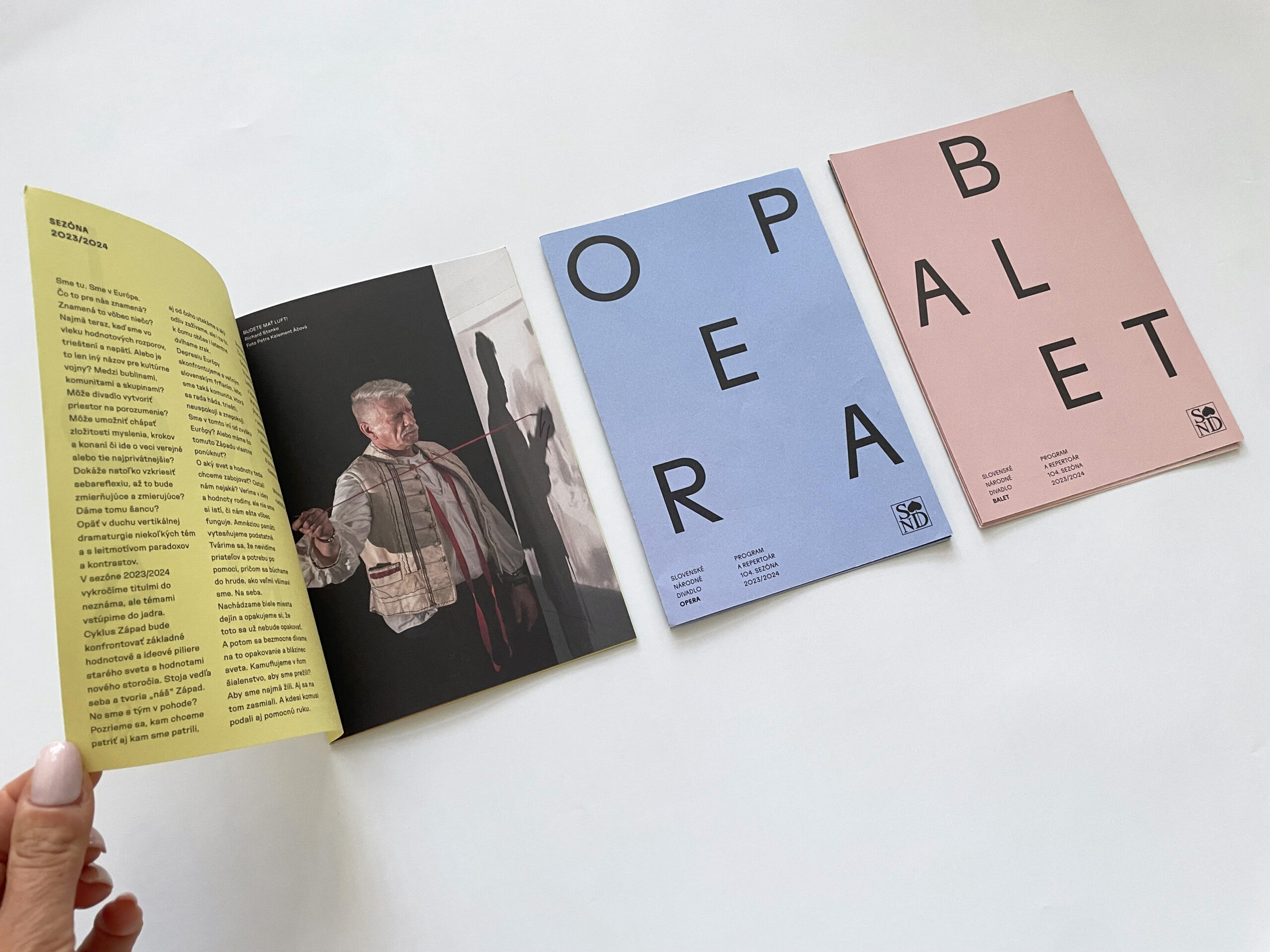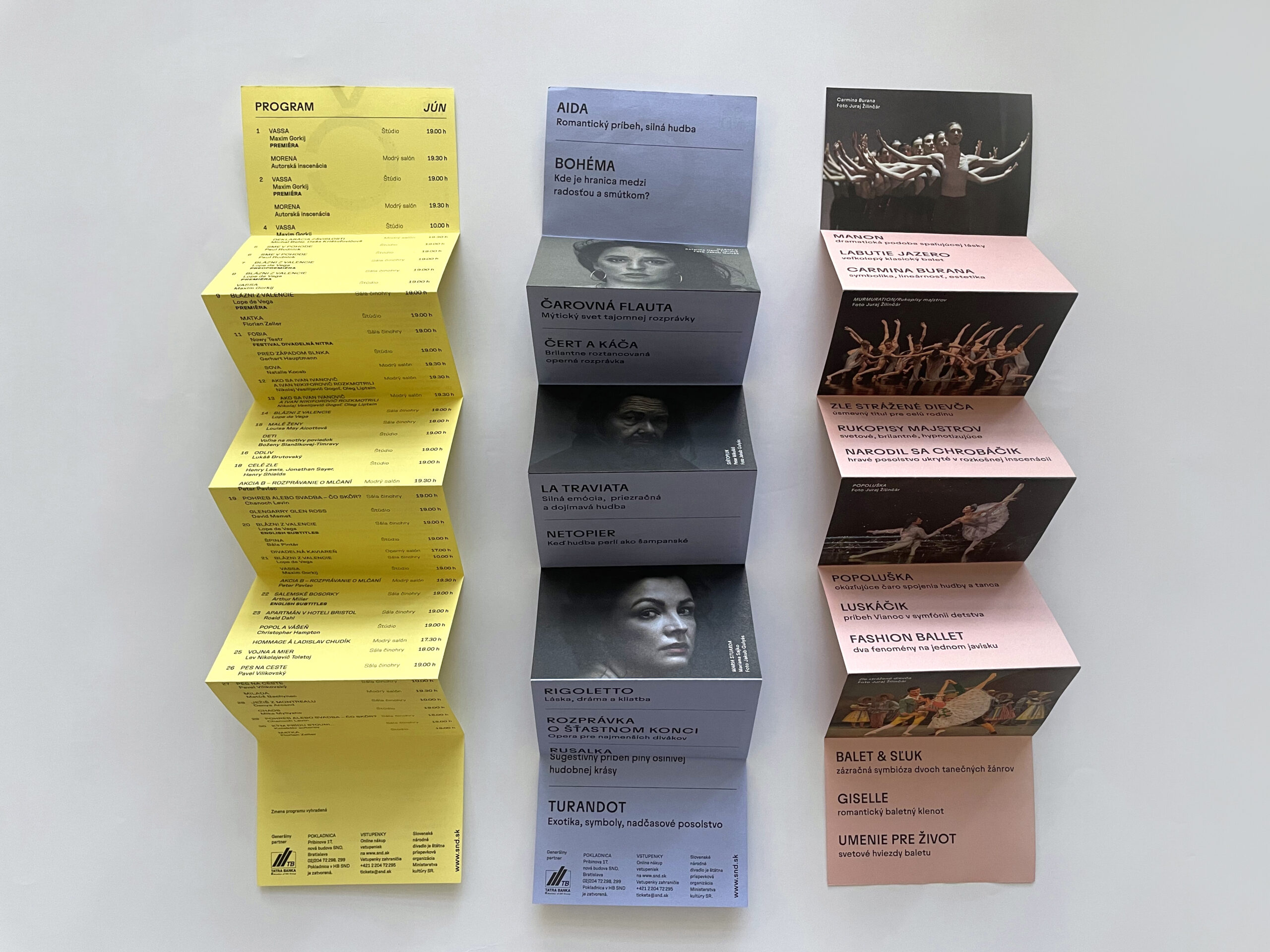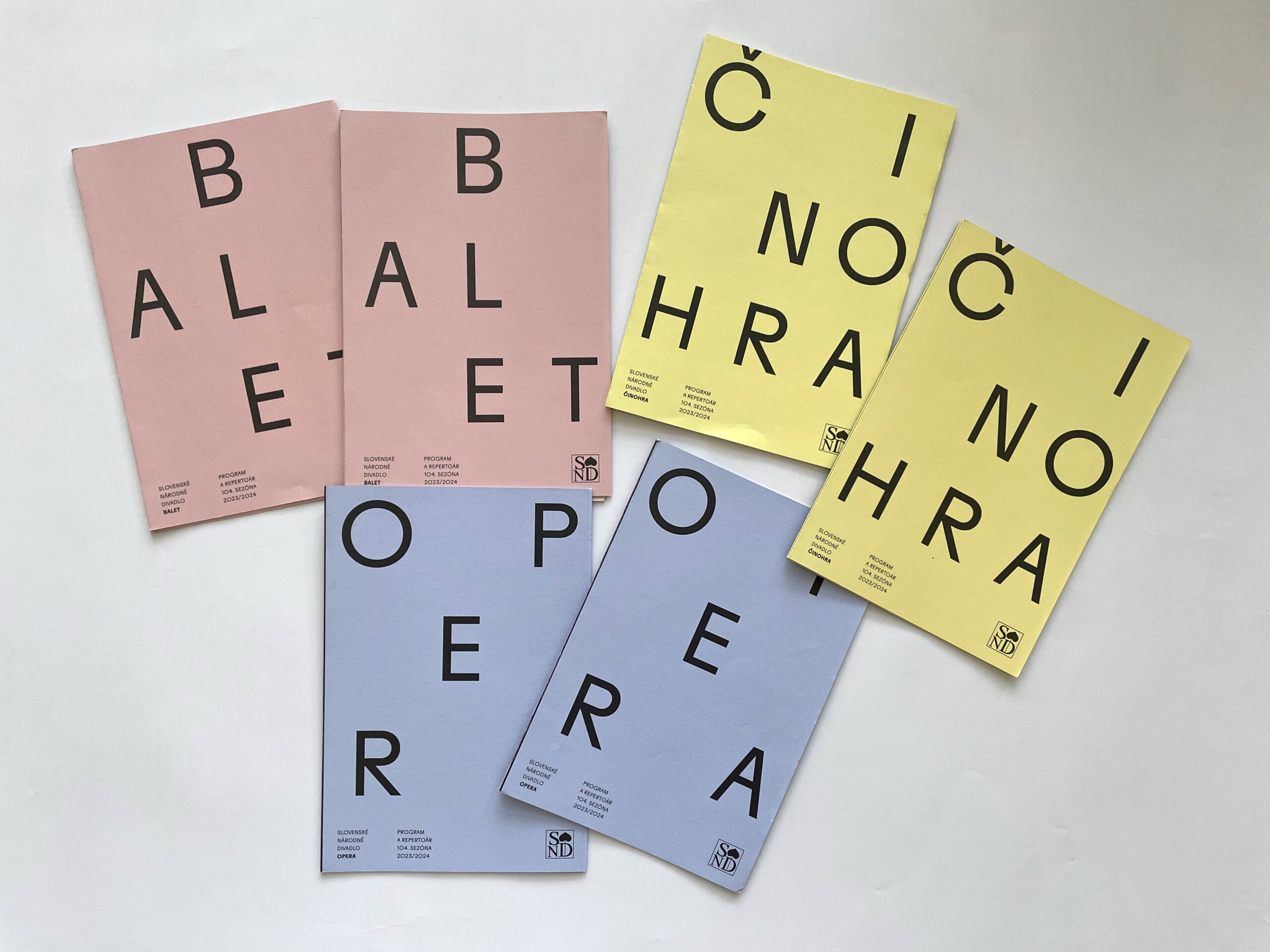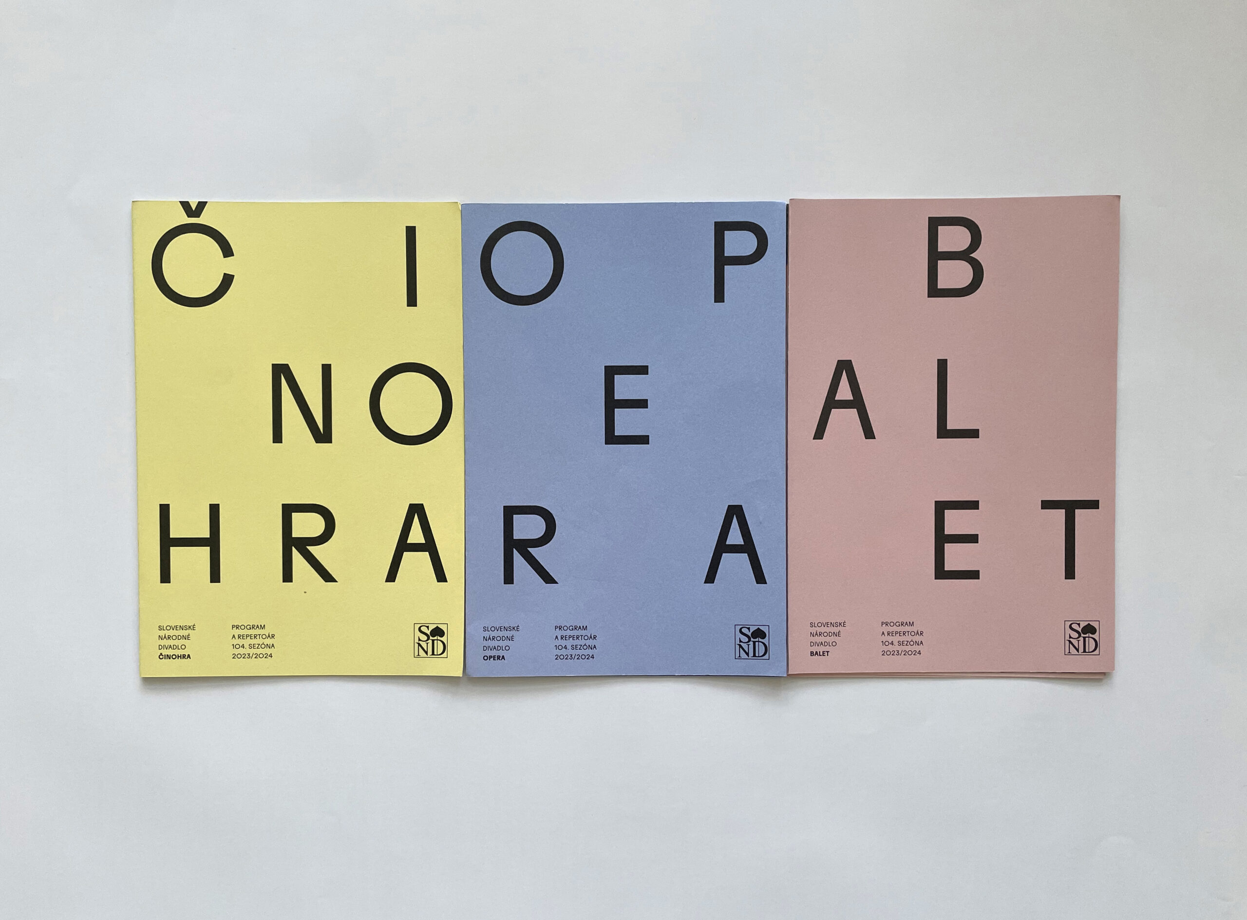 Už dve sezóny Slovenské národné divadlo komunikuje premiéry, repertoár a špeciálne projekty svojich troch súborov jednotne – pomocou väčších aj menších skladačiek v troch farbách – žltej, modrej a ružovej. Činohra sa dlhodobo stotožňovala so žltou farbou, modrá farba sa stala farbou pre verejnosť vážnym žánrom Opery SND a ružová farba baletných cvičiek, jemnosti a ladnosti sa stala farbou Baletu SND. Farby súborov a skladačiek sa stali určujúce aj pri iných komuniáciách, napr. na sociálnych sieťach. Väčšie skladačky boli navrhnuté v rovnakom formáte ako ročenka SND, menšie vo formáte A7 zase slúžia ako praktický mini-kalendár podujatí vreckového formátu. Typografické riešenie týchto materiálov je vizuálne prepojené s dizajnom ročenky SND, súbory identifikujeme často písmenami Č, O a B.