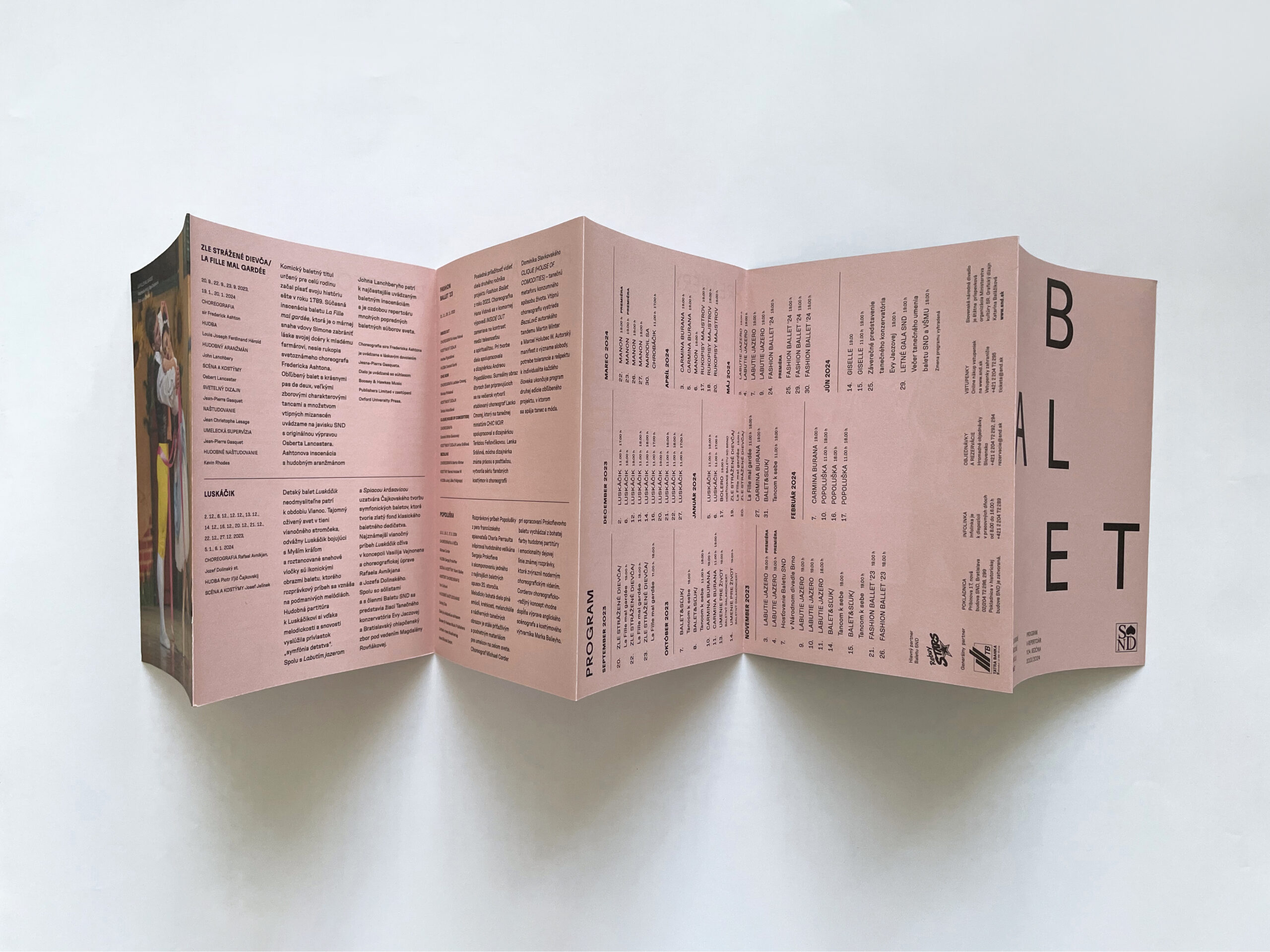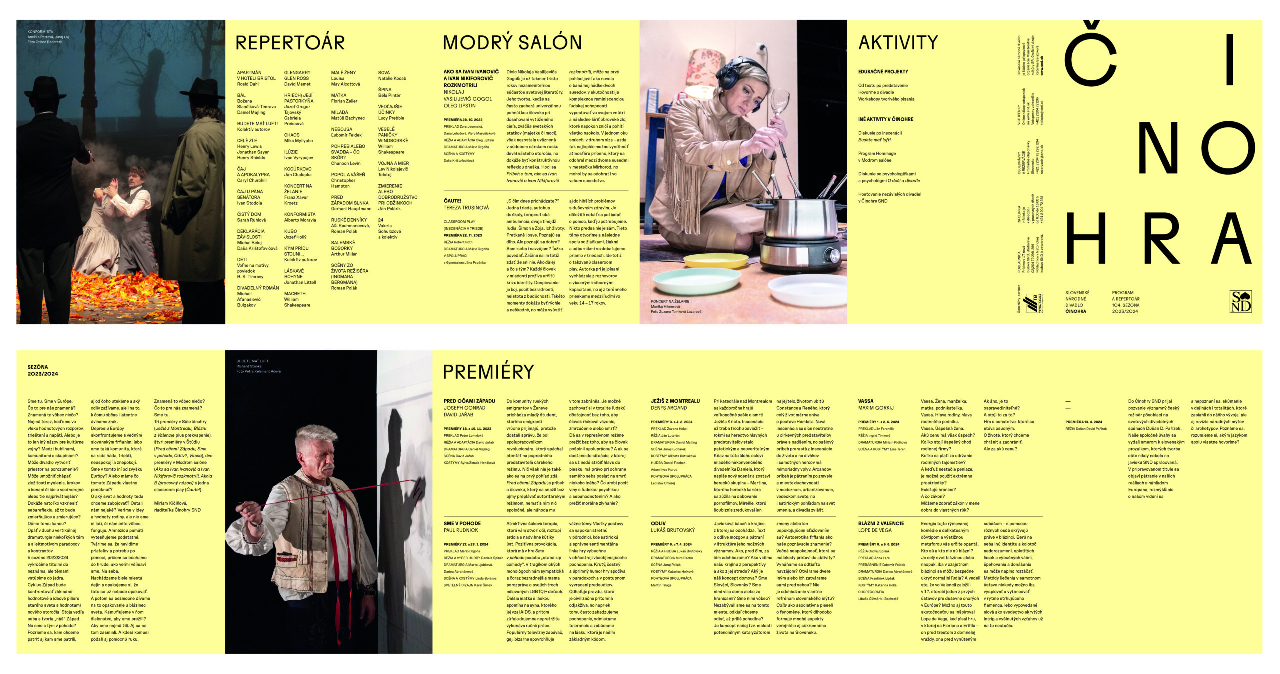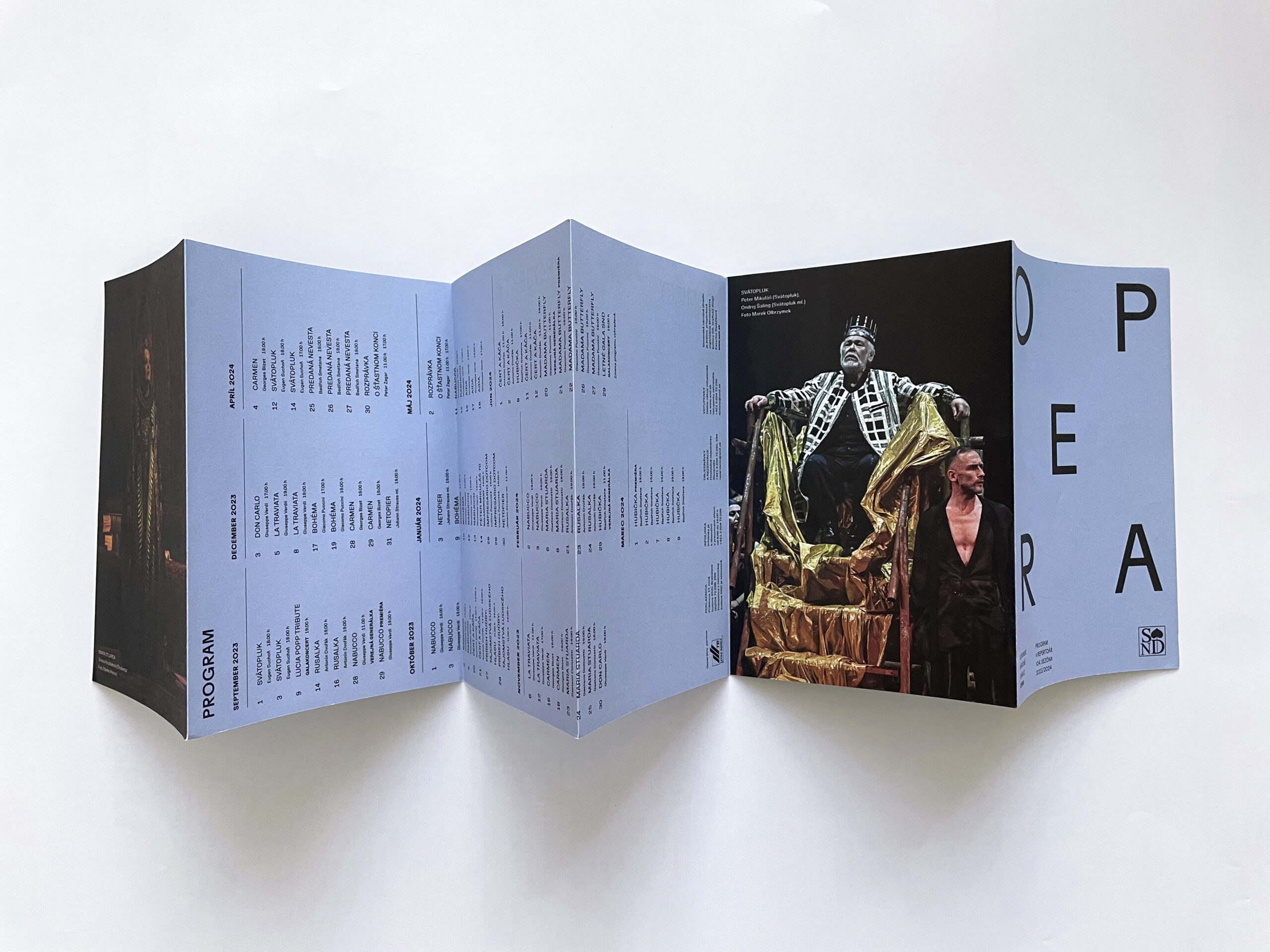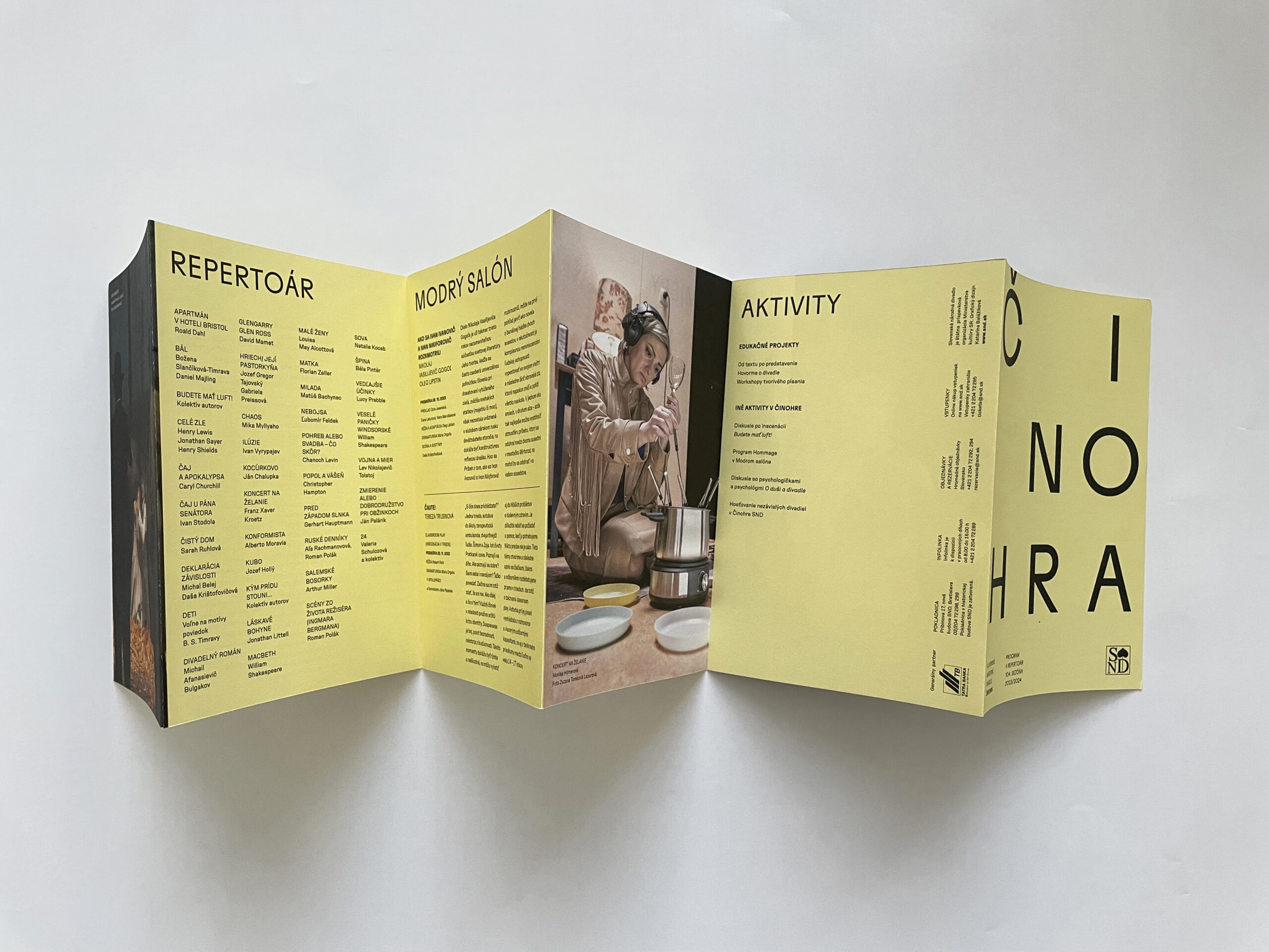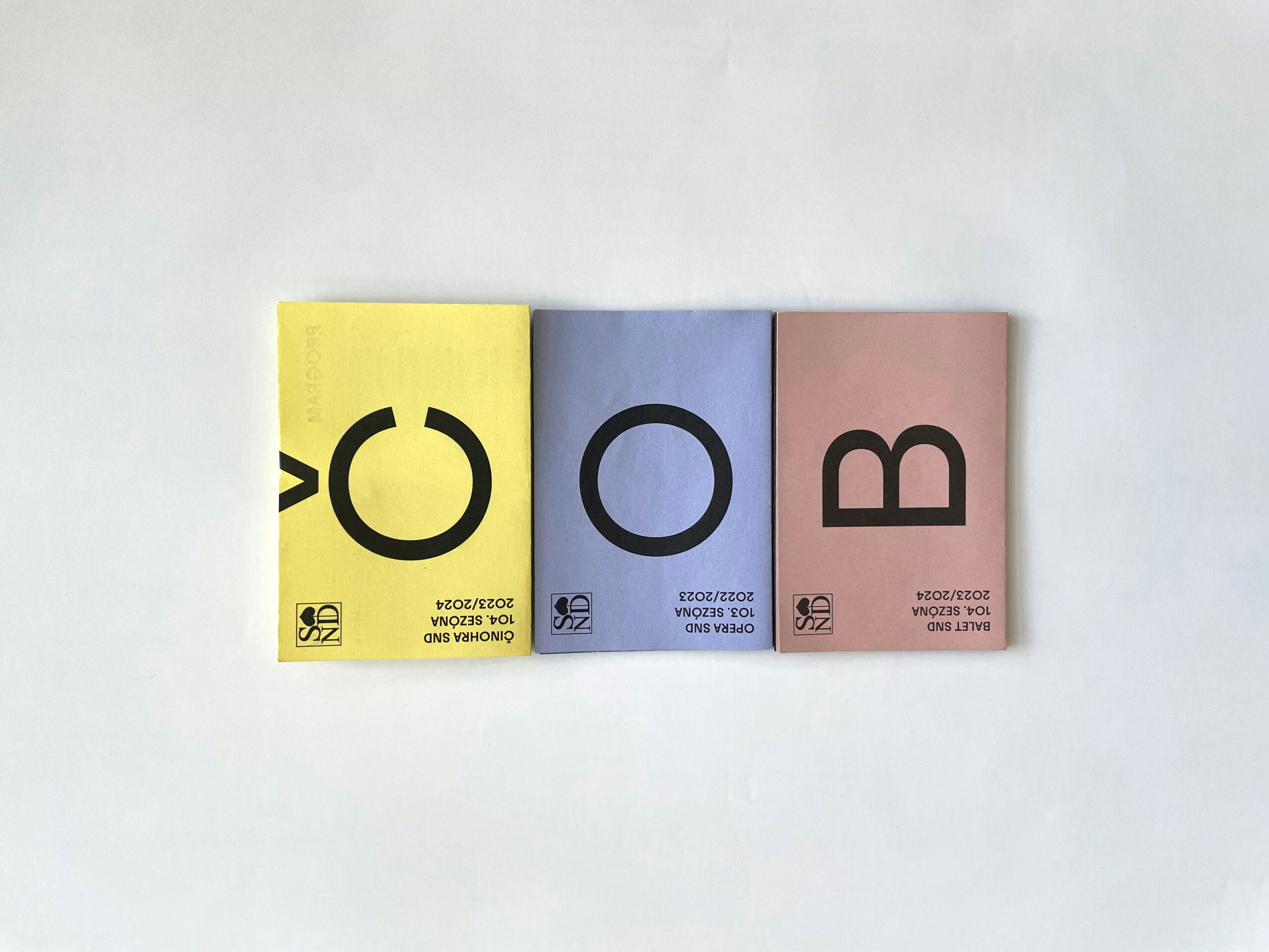 Už dve sezóny Slovenské národné divadlo komunikuje premiéry, repertoár a špeciálne projekty svojich troch súborov jednotne – pomocou väčších aj menších skladačiek v troch farbách – žltej, modrej a ružovej. Činohra sa dlhodobo stotožňovala so žltou farbou, modrá farba sa stala farbou pre verejnosť vážnym žánrom Opery SND a ružová farba baletných cvičiek, jemnosti a ladnosti sa stala farbou Baletu SND. Farby súborov a skladačiek sa stali určujúce aj pri iných komuniáciách, napr. na sociálnych sieťach. Väčšie skladačky boli navrhnuté v rovnakom formáte ako ročenka SND, menšie vo formáte A7 zase slúžia ako praktický mini-kalendár podujatí vreckového formátu. Typografické riešenie týchto materiálov je vizuálne prepojené s dizajnom ročenky SND, súbory identifikujeme často písmenami Č, O a B.