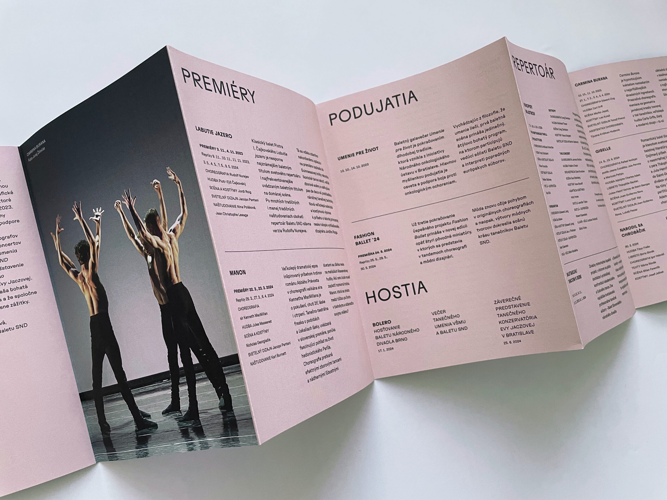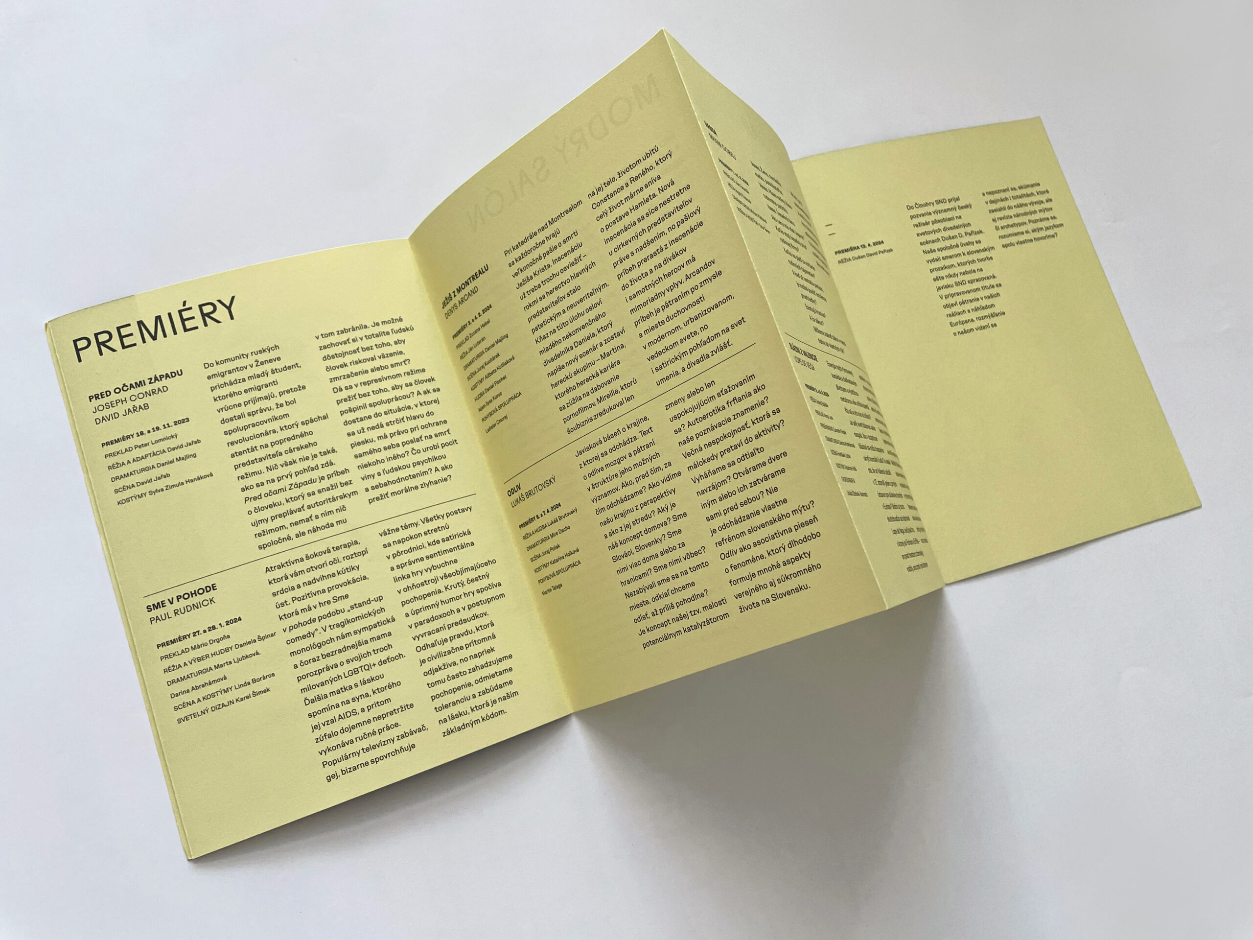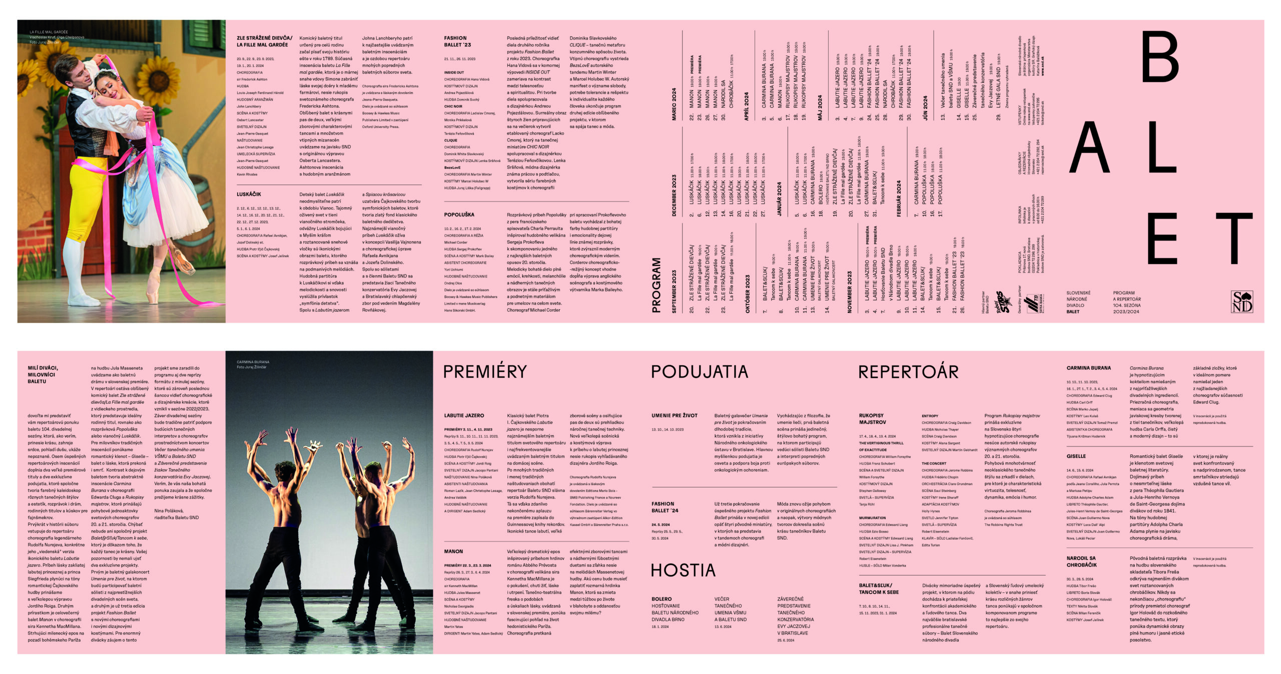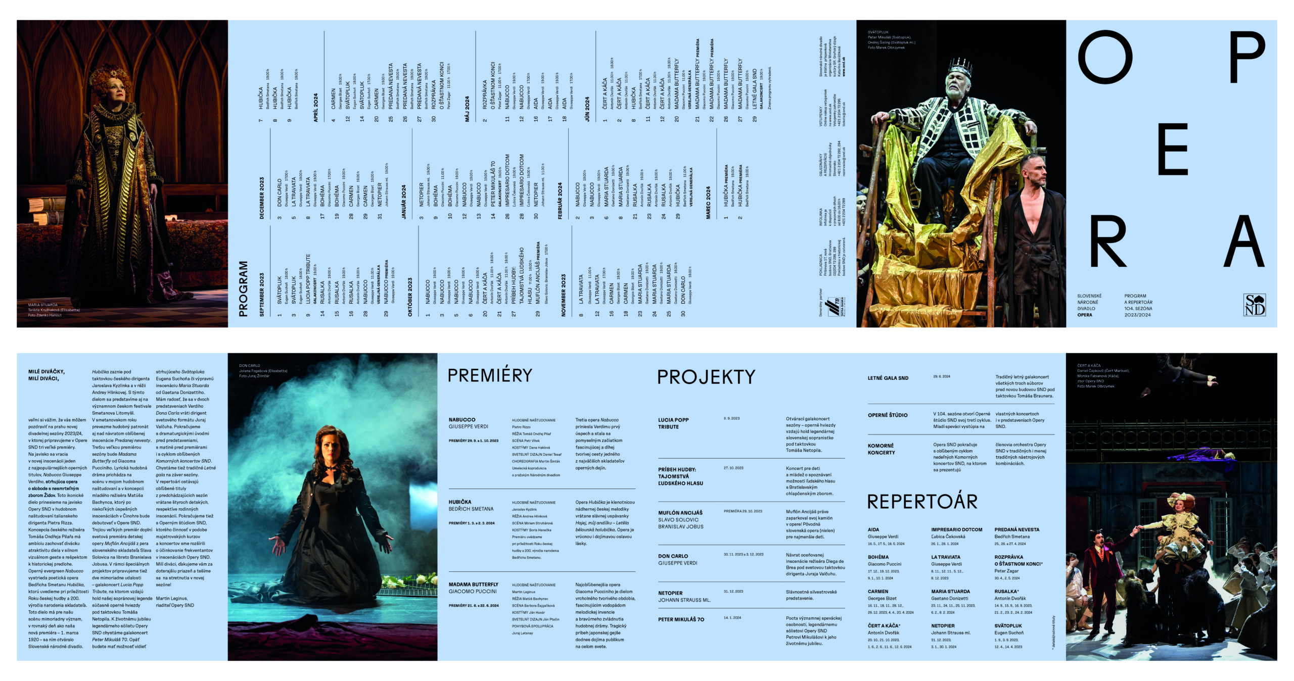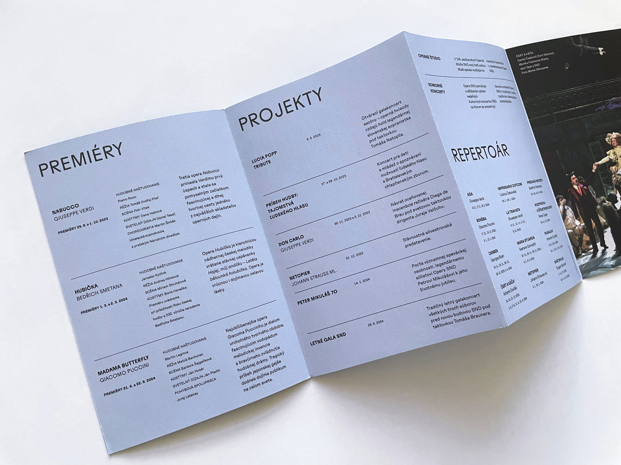 Už dve sezóny Slovenské národné divadlo komunikuje premiéry, repertoár a špeciálne projekty svojich troch súborov jednotne – pomocou väčších aj menších skladačiek v troch farbách – žltej, modrej a ružovej. Činohra sa dlhodobo stotožňovala so žltou farbou, modrá farba sa stala farbou pre verejnosť vážnym žánrom Opery SND a ružová farba baletných cvičiek, jemnosti a ladnosti sa stala farbou Baletu SND. Farby súborov a skladačiek sa stali určujúce aj pri iných komuniáciách, napr. na sociálnych sieťach. Väčšie skladačky boli navrhnuté v rovnakom formáte ako ročenka SND, menšie vo formáte A7 zase slúžia ako praktický mini-kalendár podujatí vreckového formátu. Typografické riešenie týchto materiálov je vizuálne prepojené s dizajnom ročenky SND, súbory identifikujeme často písmenami Č, O a B.