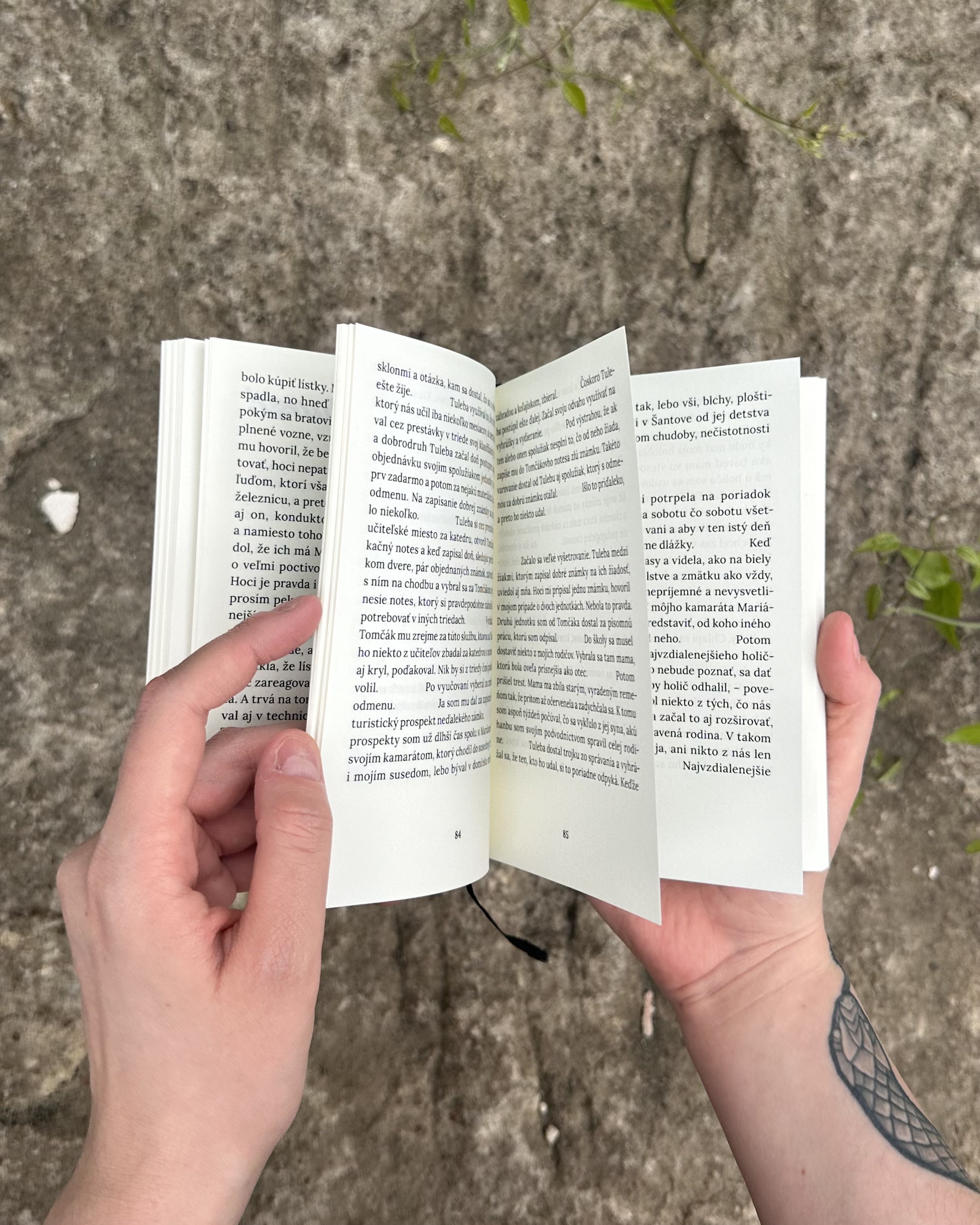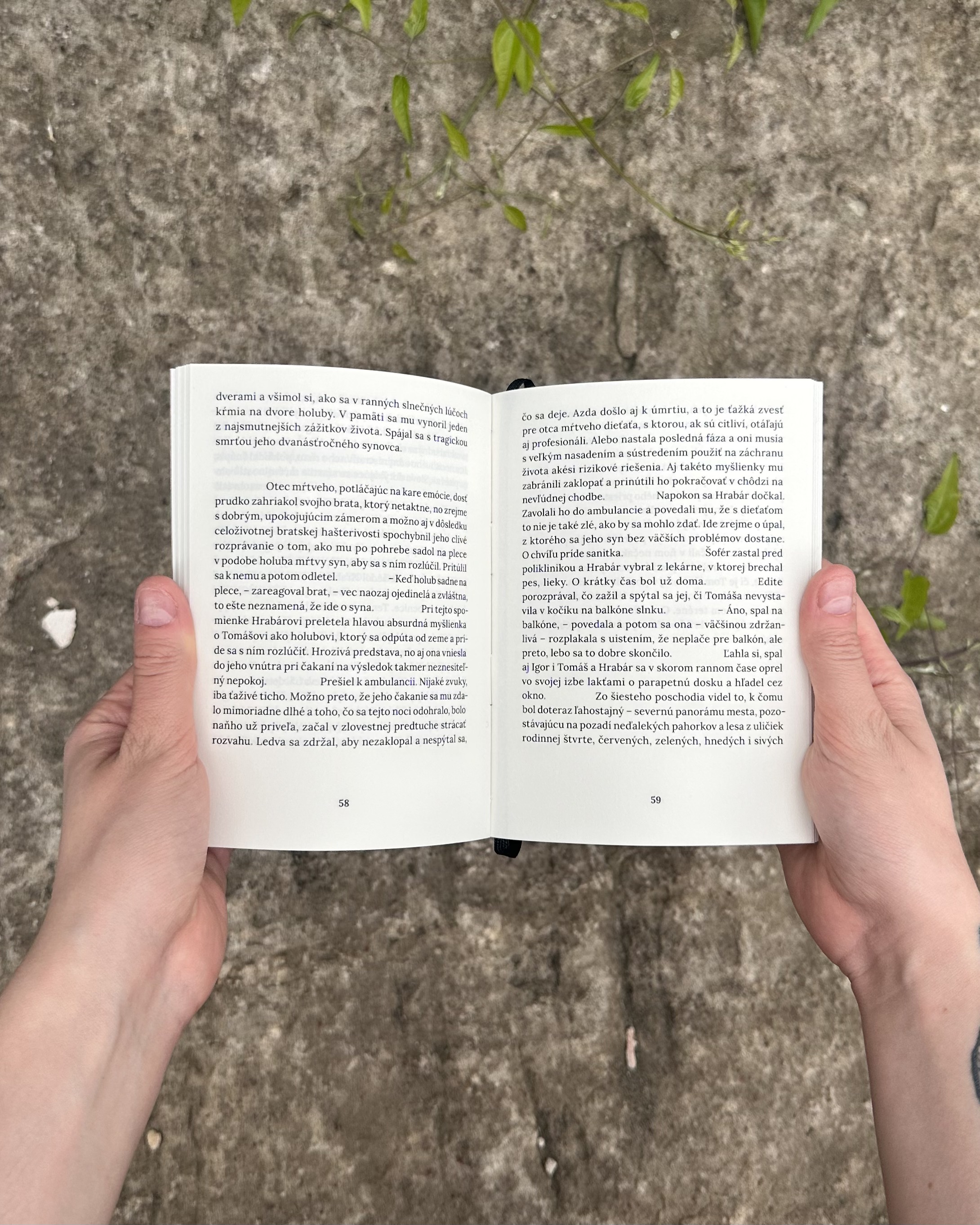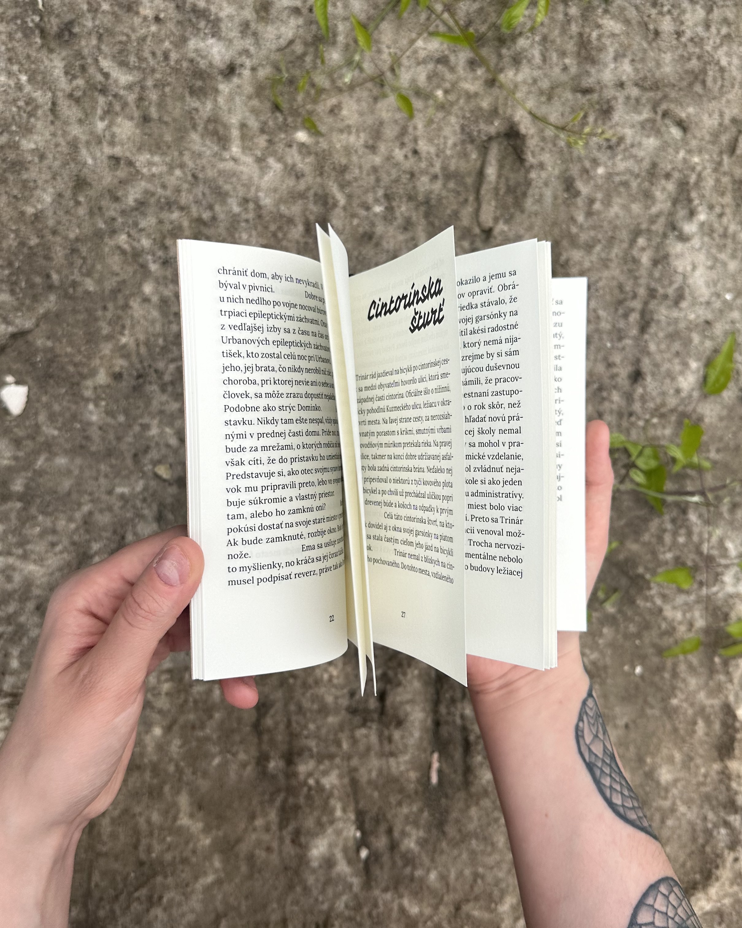 Kniha je redizajn podľa mojej osobnej interpretácie. Väzba a riešenie obálky navodzuje denníkový charakter, skriptové autorské písmo zapadá do doby, v ktorej sa pravdepodobne pohybuje dej poviedok. Knižka je malá a ľahká, akurát do vrecka a príjemná na cestovanie. Do textu som vstúpila rôznymi odsadeniami a pauzami, podľa vlastného pocitu a uváženia. V istých momentoch sa mi žiadala vizuálna pauza na spracovanie práve prečítaného textu. Deravý layout reflektuje lineárnosť príbehov, v ktorých sa odohrávajú nečakané zvraty.