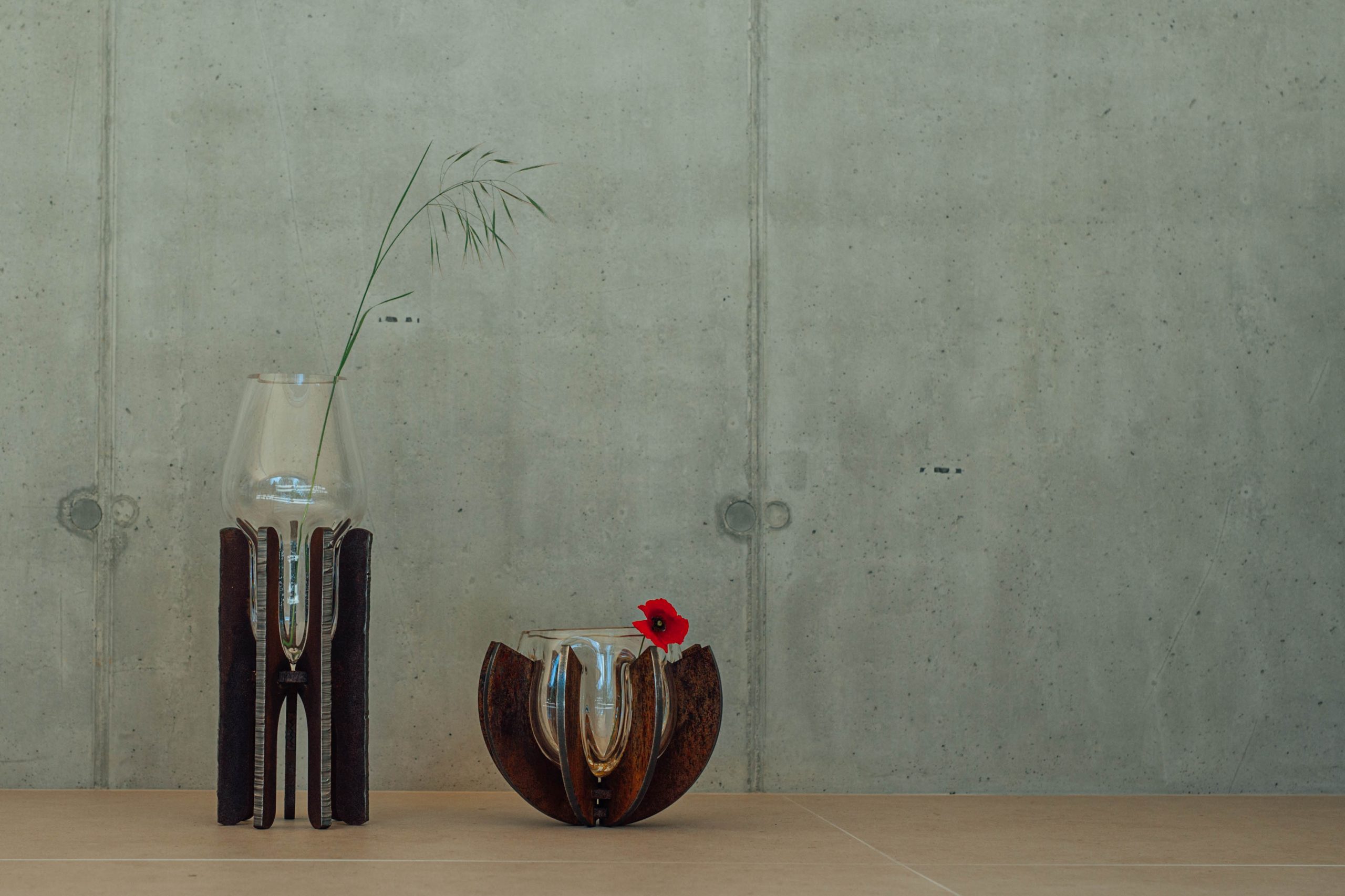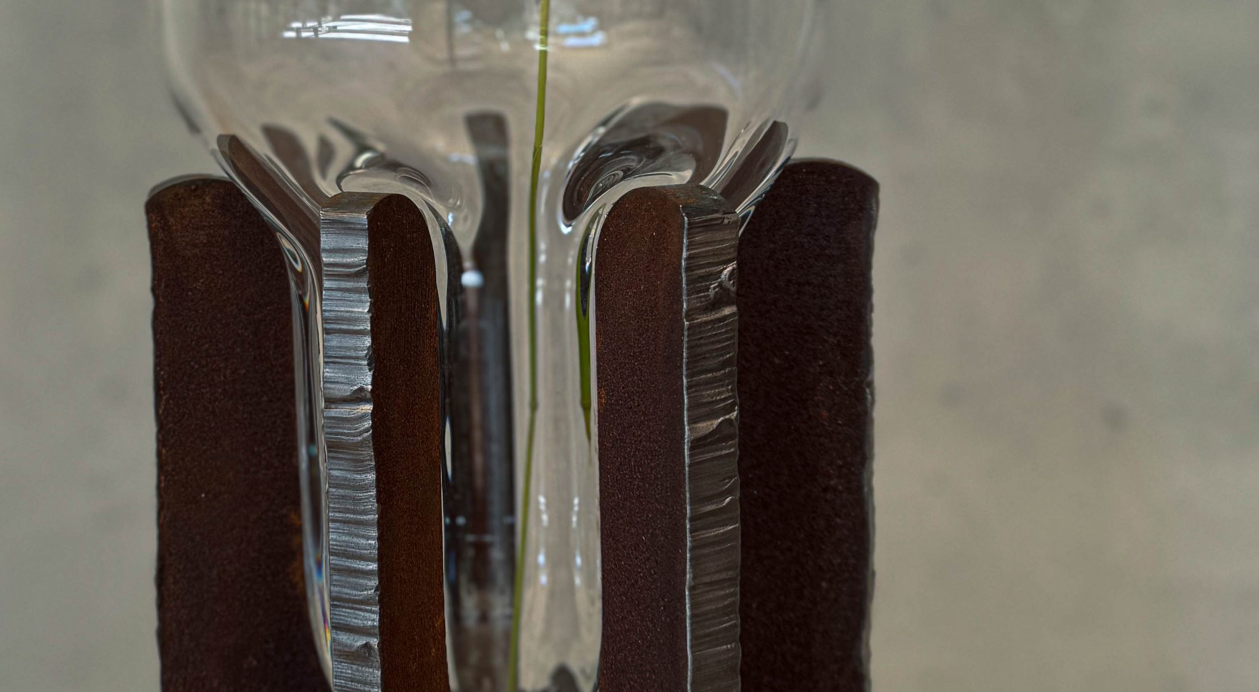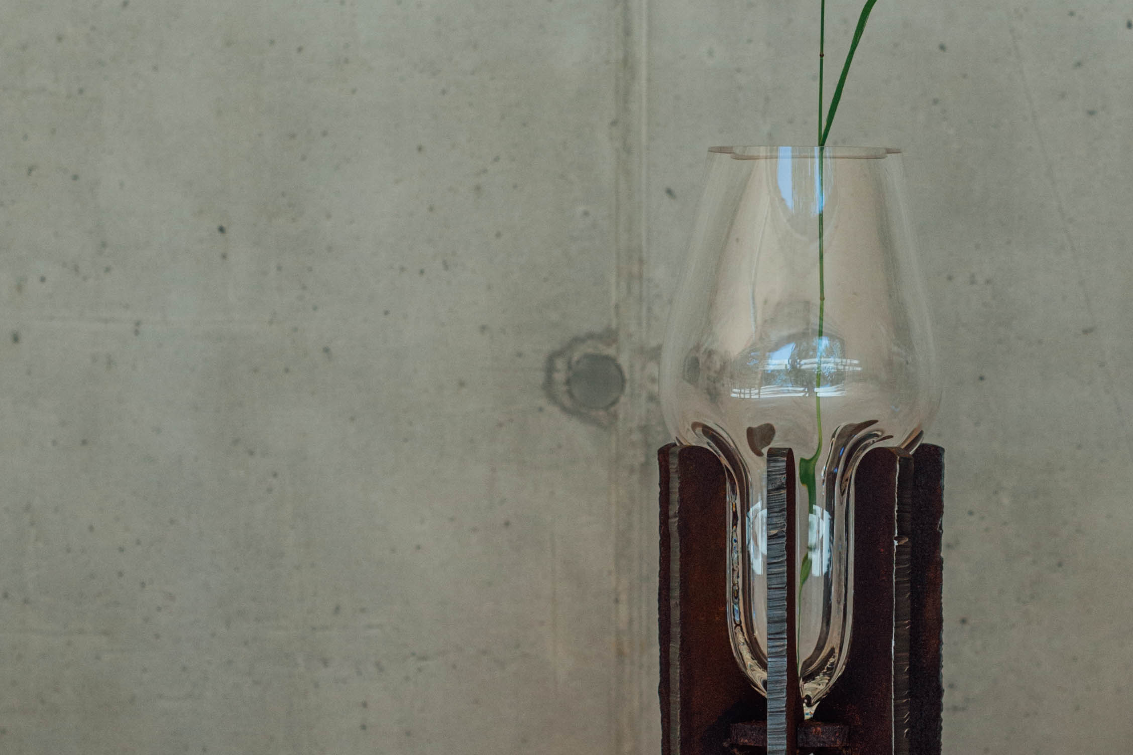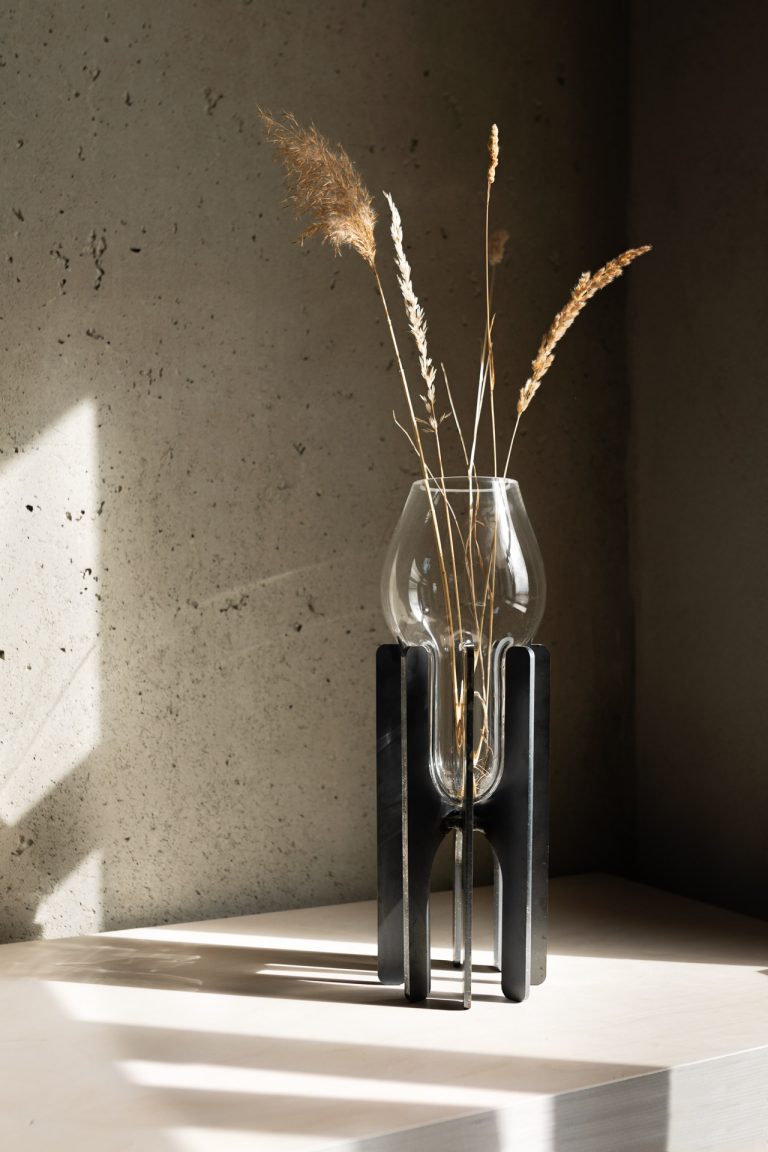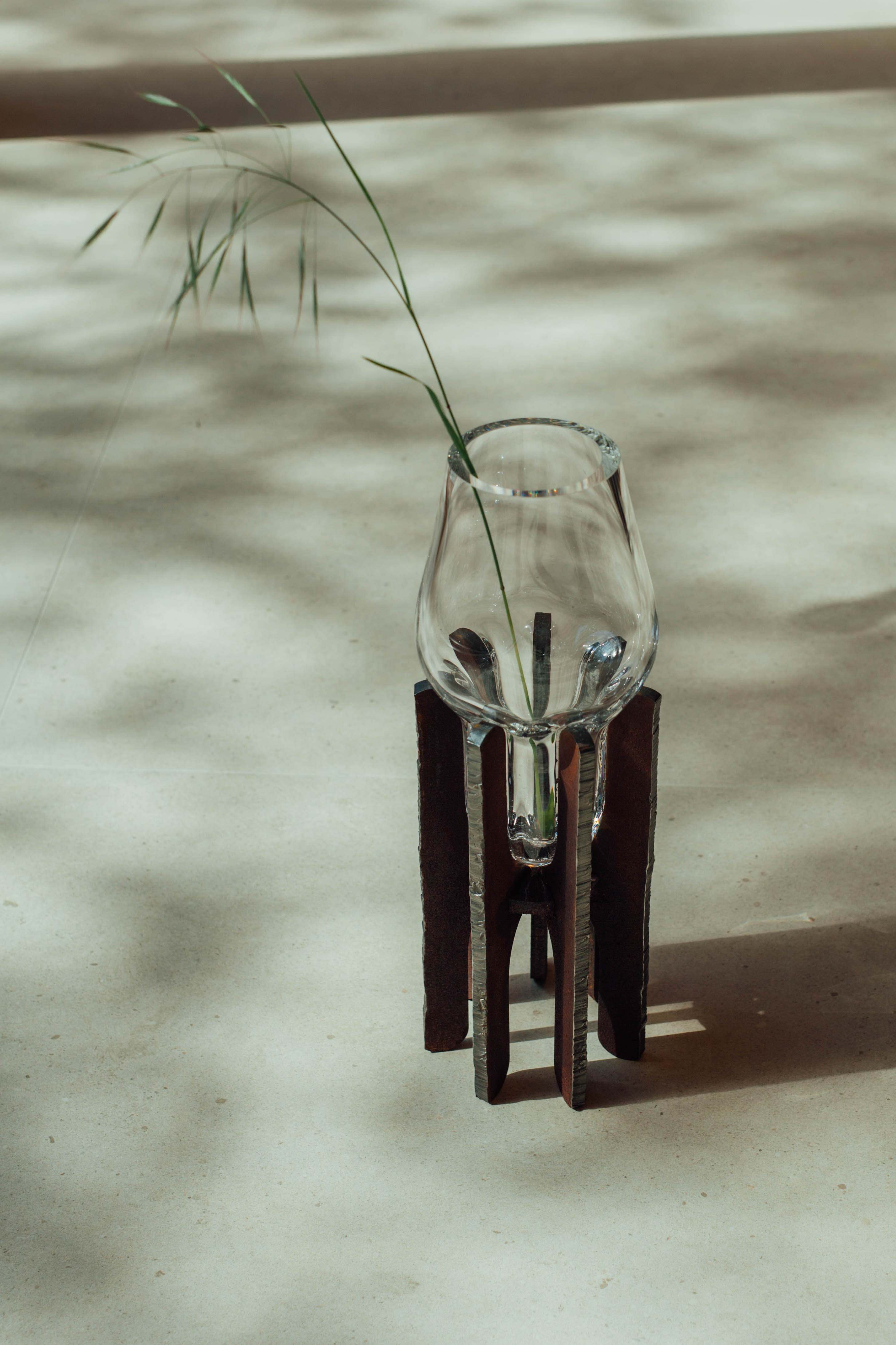 Kooperácia a kontinuita sú kľúčovými aspektmi vázy vytvorenej súznením tradičného i súčasného. Masívna, no krehká bublina fúkaného skla zasadená v pevnej oceľovej konštrukcii zvarenej z robustných kusov rezaných laserom a plazmou. Objekt vyjadruje koexistenciu zdanlivo nesúrodých materiálov reprezentujúcich citlivé remeslo českých sklárskych hút a presnú technológiu slovenského ťažkého priemyslu. Objekt je pokračovaním experimentálneho prístupu študentských čias autora.