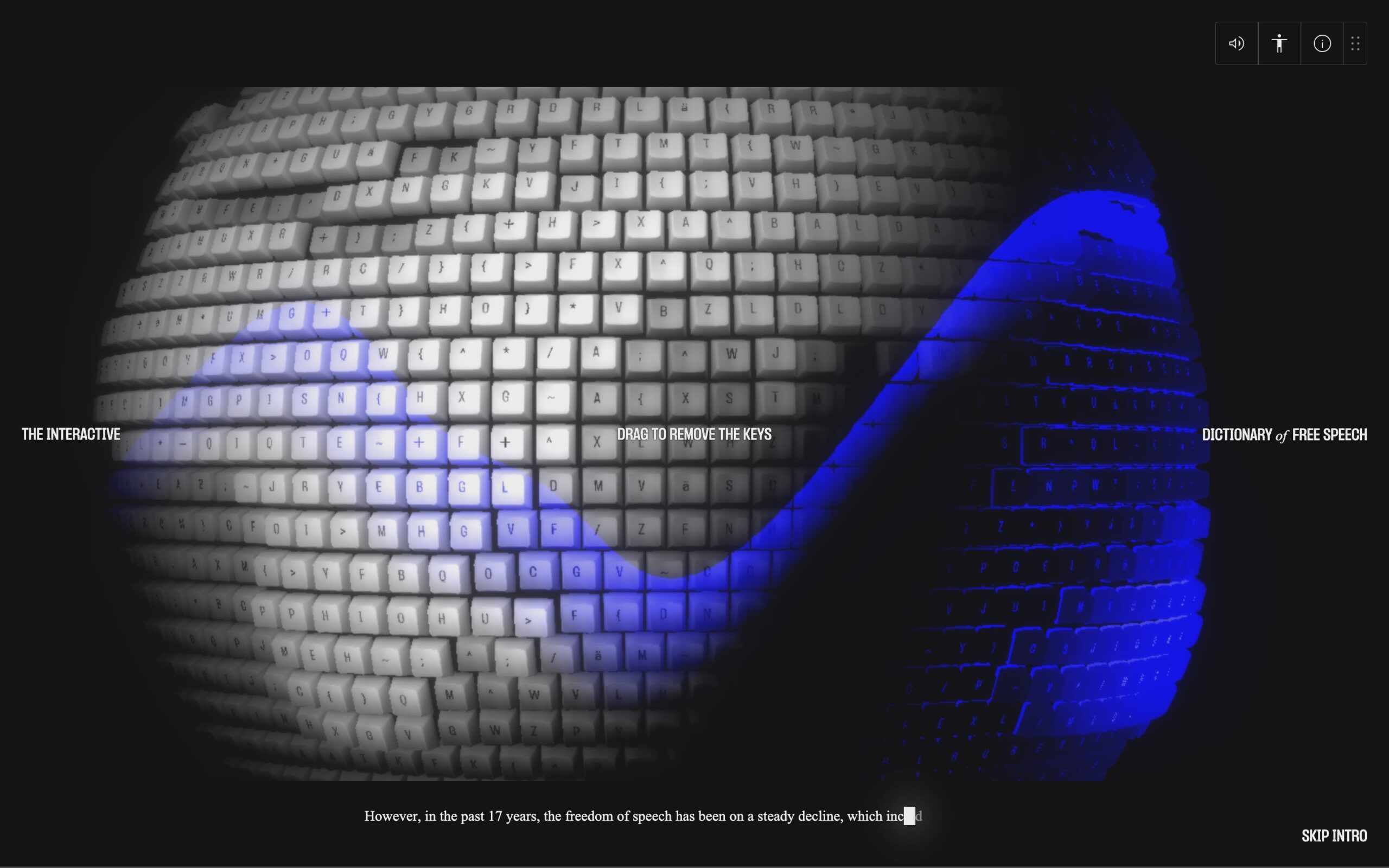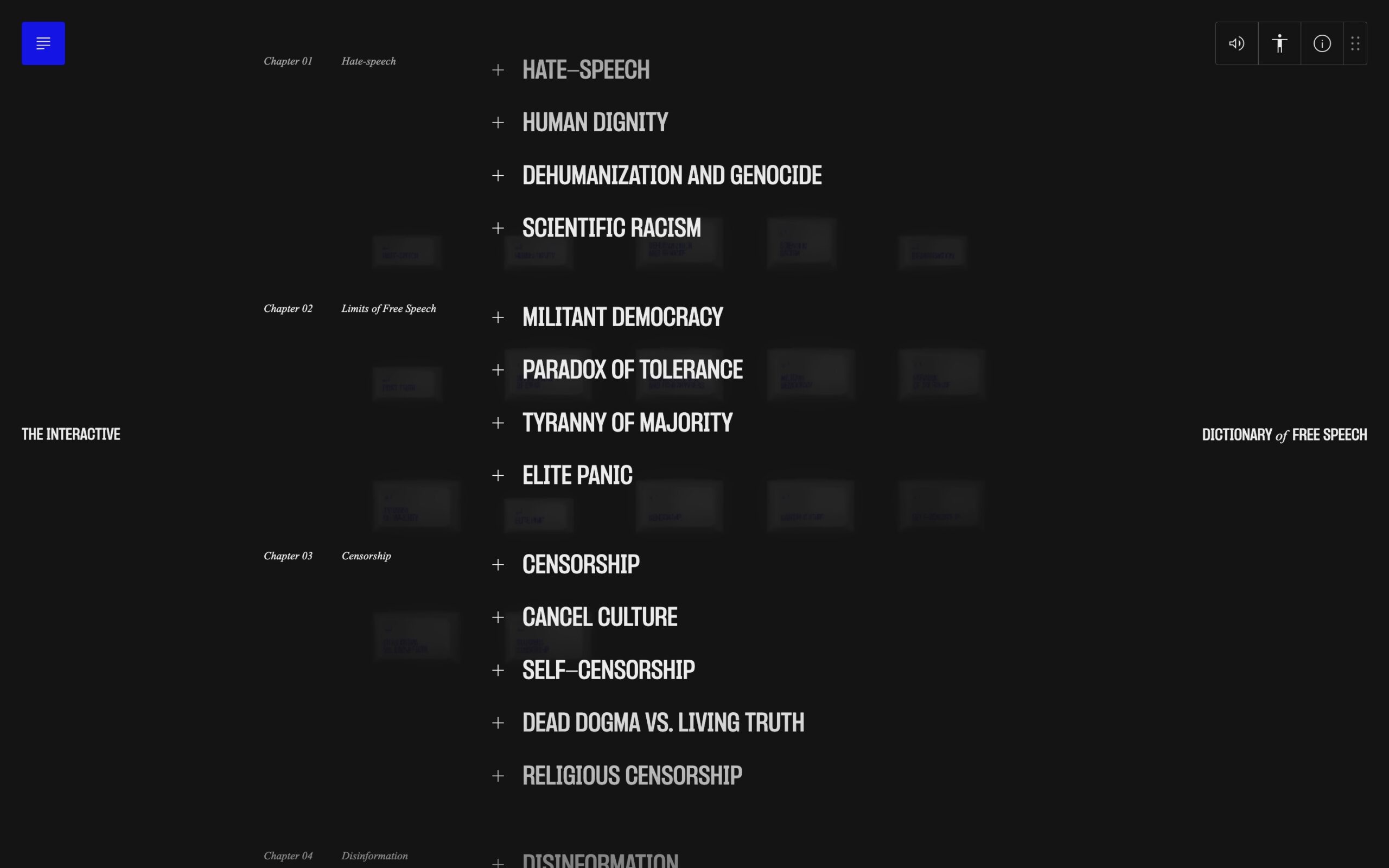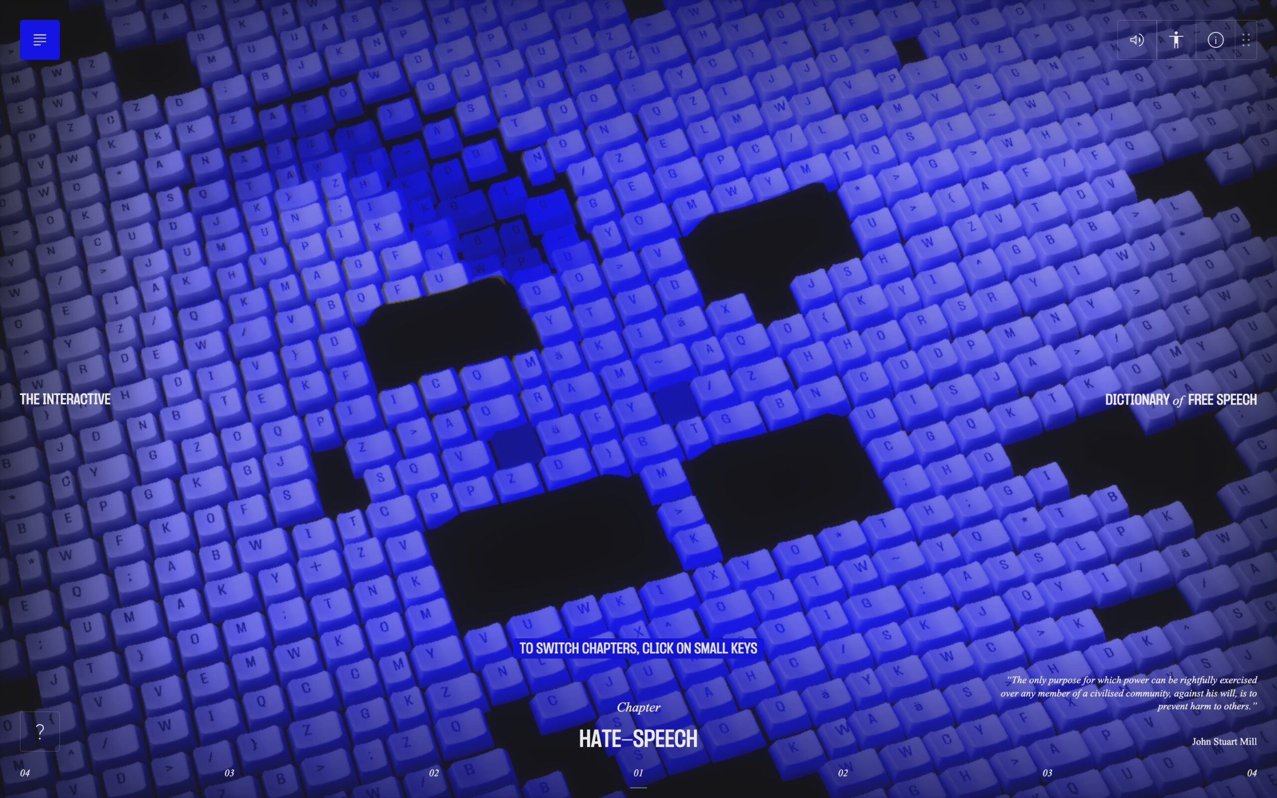 Sloboda slova, ako hlavný indikátor demokracie vo svete, má posledných 17 rokov klesajúcu tendenciu naprieč všetkými krajinami (Freedom House, 2023). Napriek jej dôležitosti, a jej častému skloňovaniu v rôznych diskusiách, je však jej skutočný obsah málo známy. The Interactive Dictionary of Free Speech je experimentálna autorská webová skúsenosť s cieľom popularizácie témy slobody slova, kde cez jednotlivé pojmy a fenomény dostáva užívateľ možnosť zistiť viac o danej téme a získať tak potrebný prehľad k diskusii.