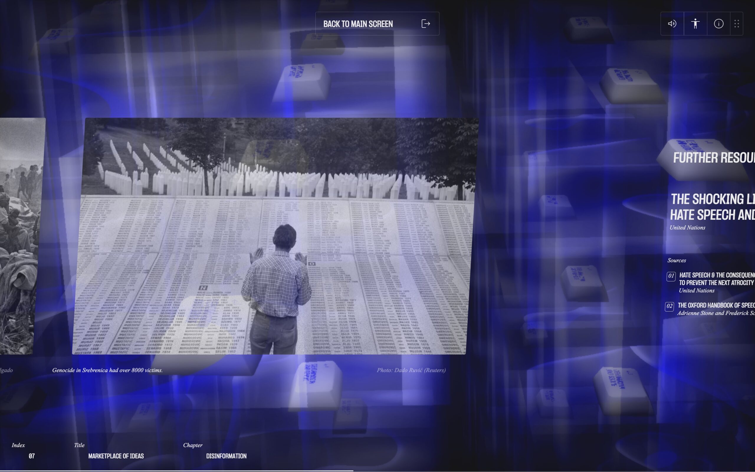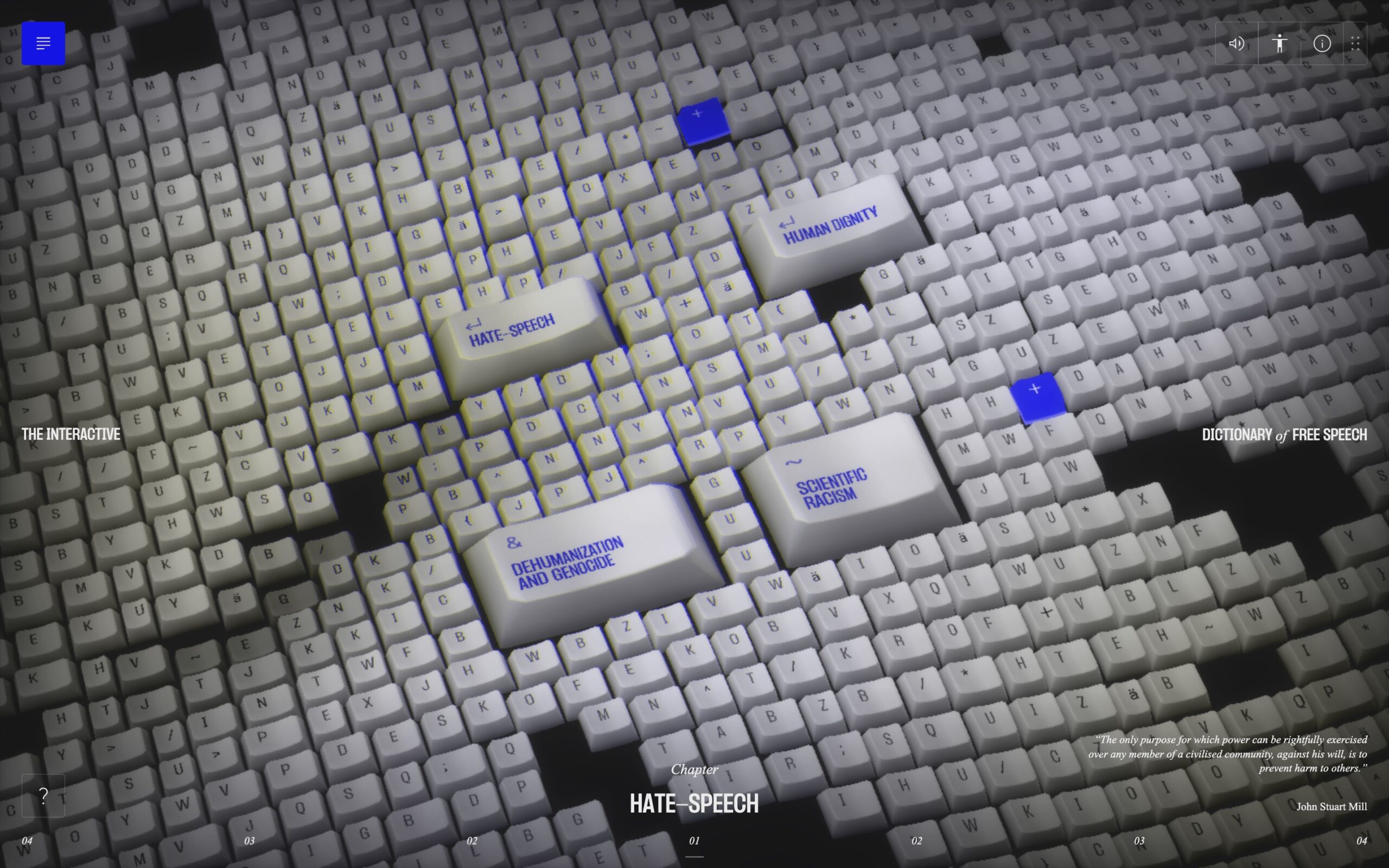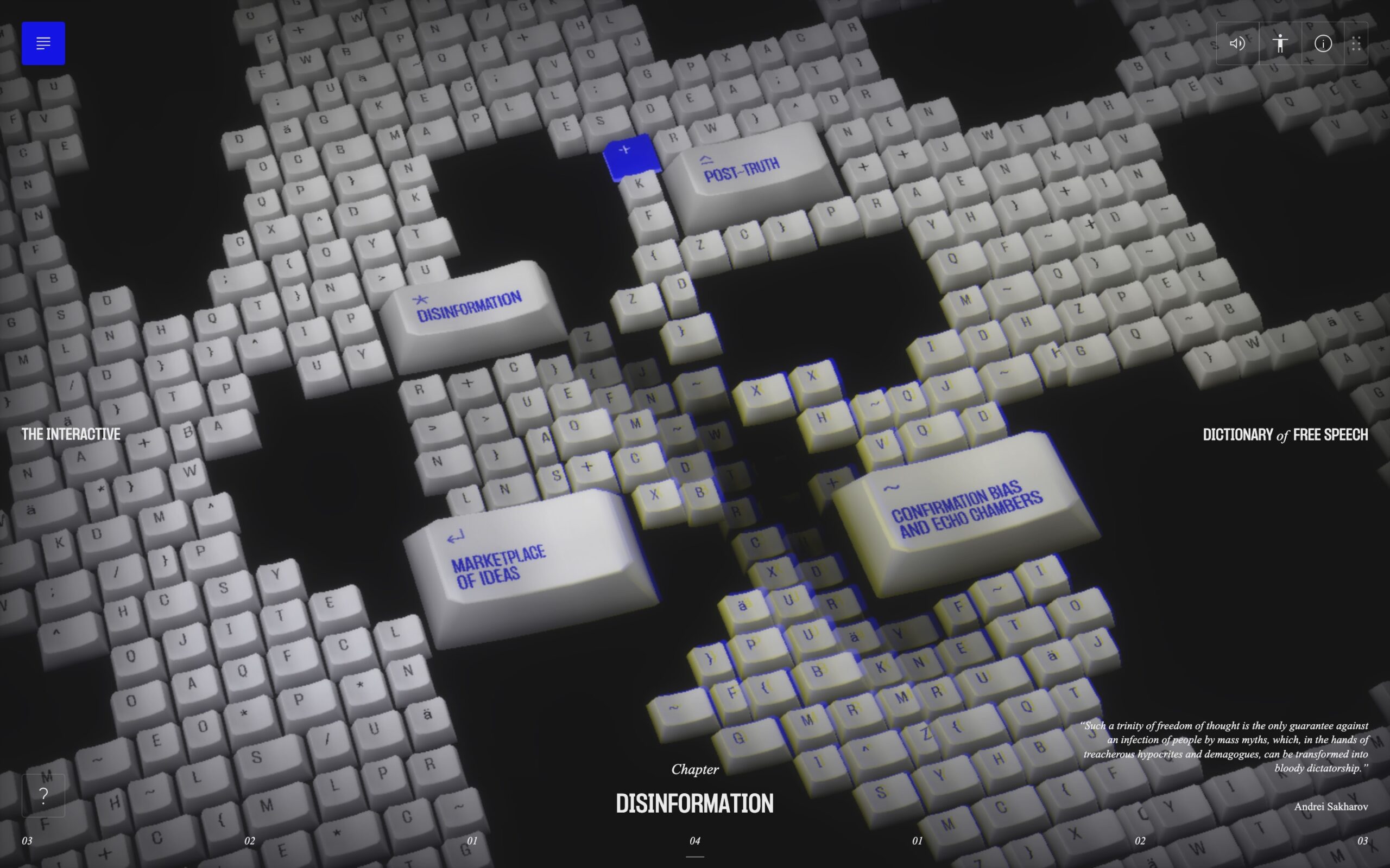 Sloboda slova, ako hlavný indikátor demokracie vo svete, má posledných 17 rokov klesajúcu tendenciu naprieč všetkými krajinami (Freedom House, 2023). Napriek jej dôležitosti, a jej častému skloňovaniu v rôznych diskusiách, je však jej skutočný obsah málo známy. The Interactive Dictionary of Free Speech je experimentálna autorská webová skúsenosť s cieľom popularizácie témy slobody slova, kde cez jednotlivé pojmy a fenomény dostáva užívateľ možnosť zistiť viac o danej téme a získať tak potrebný prehľad k diskusii.