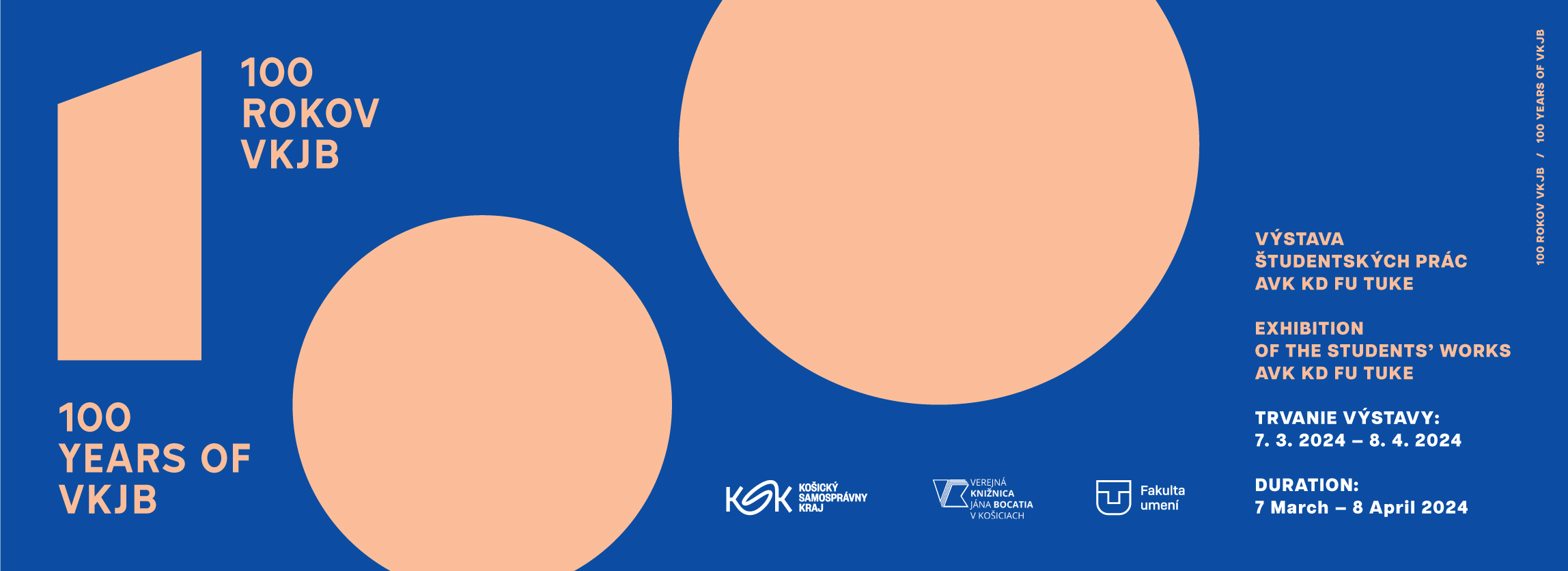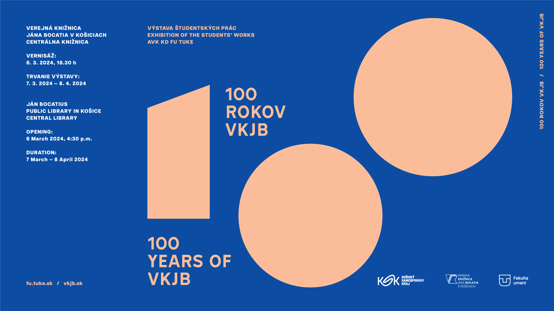 Vizuálna identita pre výstavu študentských prác ateliéru Vizuálna komunikácia, Katedra dizajnu, Fakulta umení TUKE, pod názvom „100 rokov VKJB / 100 Years of VKJB”, ktorá reflektovala sté výročie založenia Verejnej knižnice Jána Bocatia v Košiciach. Výstava sa uskutočnila v priestoroch centrálnej knižnice VKJB na Hviezdoslavovej 5 v Košiciach. Trvanie výstavy: 7. marec 2024 — 8. apríl 2024. Kurátori výstavy: Andrej Haščák, Eva Jenčuráková.