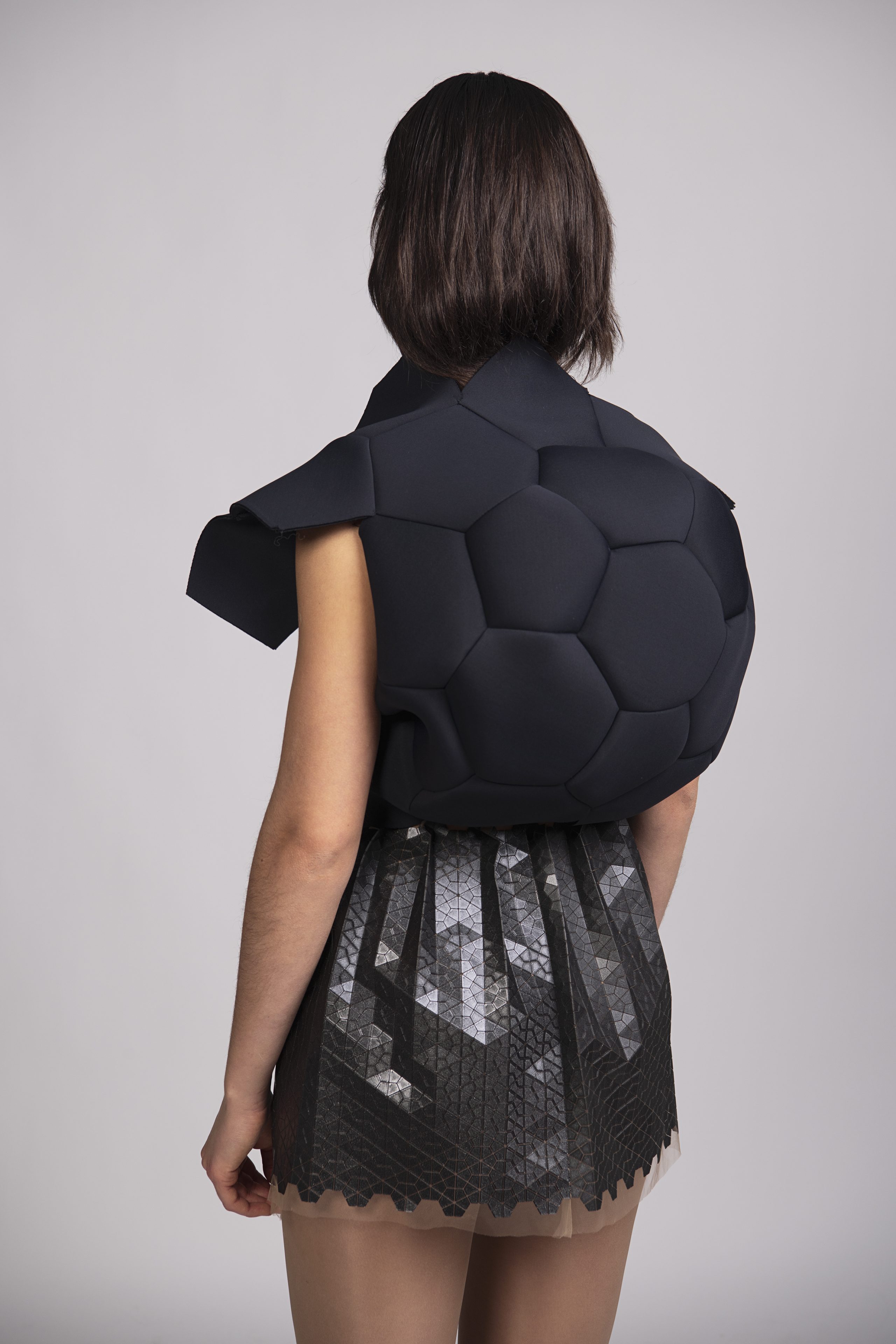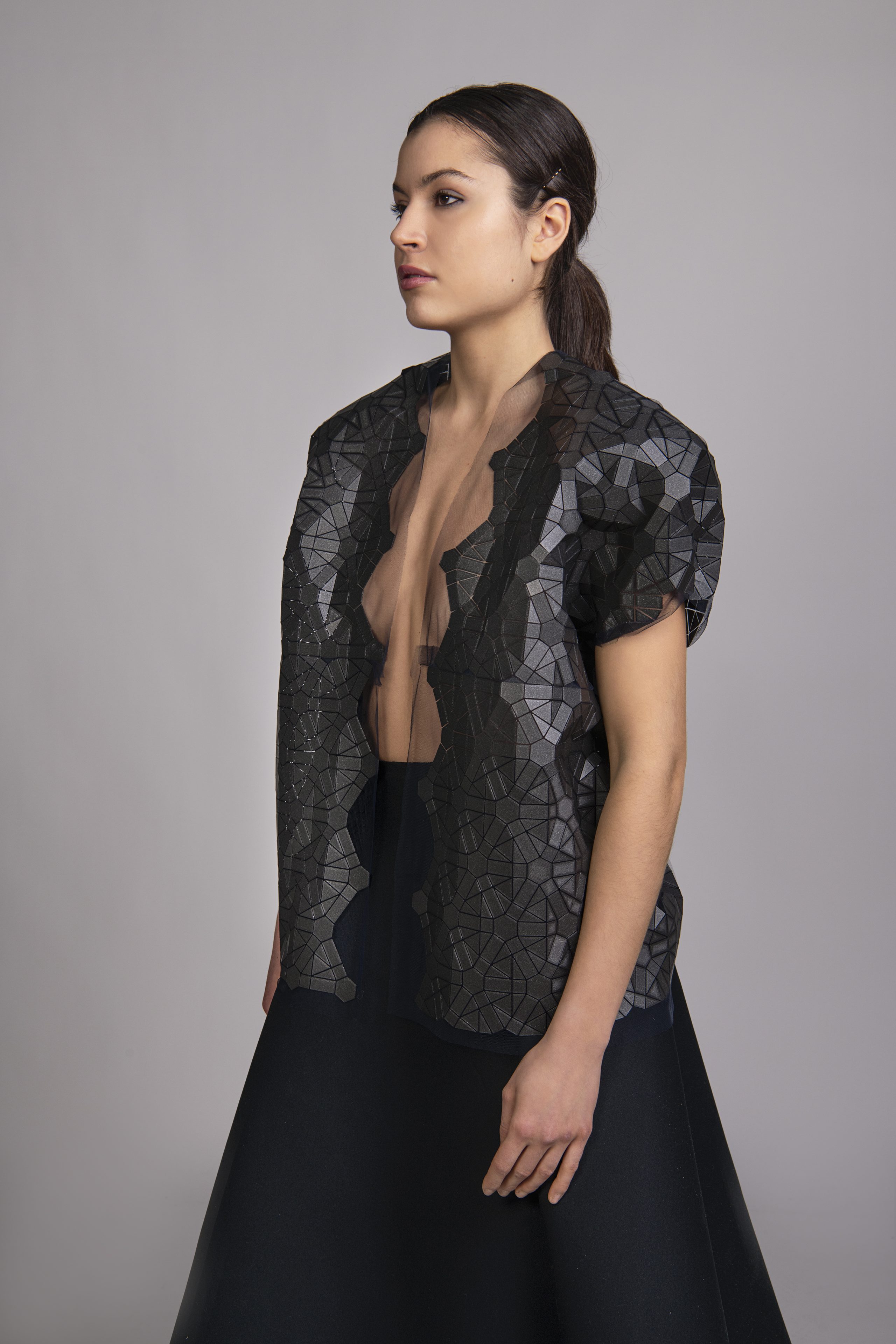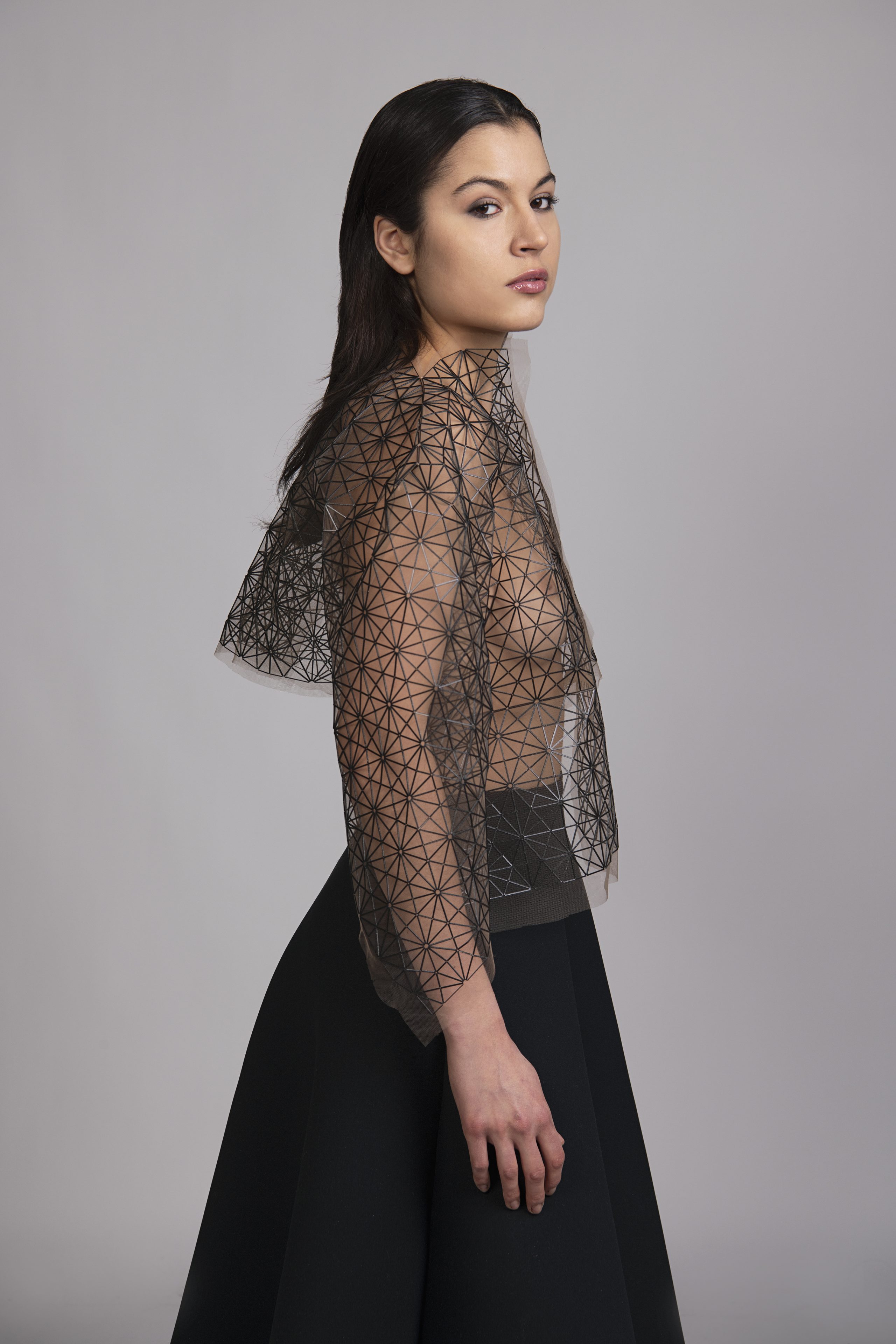 3D tlač je technológia s obrovským potenciálom, ponúka množstvo výhod a očakáva sa, že zmení spôsob výroby. Experimentujem s geometrickými motívmi – raportovanými trojuholníkmi, štvorcami a hviezdicovými útvarmi – ktoré nanášam na tyl pomocou 3D tlačiarne. Spájaním mäkkého transparentného podkladu s pevnými vrstvami tuhého plastu vznikajú organické štruktúry s premenlivým charakterom. V pohybe sa jemne krčia, reagujú na svetlo a tieň, čím formujú novú, telesnú škrupinu. Strihové riešenia sú minimalistické – tvarovanie odevu priamo vychádza z vlastností materiálu. Vďaka 3D tlači vznikajú odevy s čistou siluetou, kde forma prirodzene vyrastá z technológie. Kolekciu dopĺňajú sukne a top z neoprénu tvarované ako lopty z päť- a šesťuholníkov, ktoré dotvárajú celistvý organický výraz.