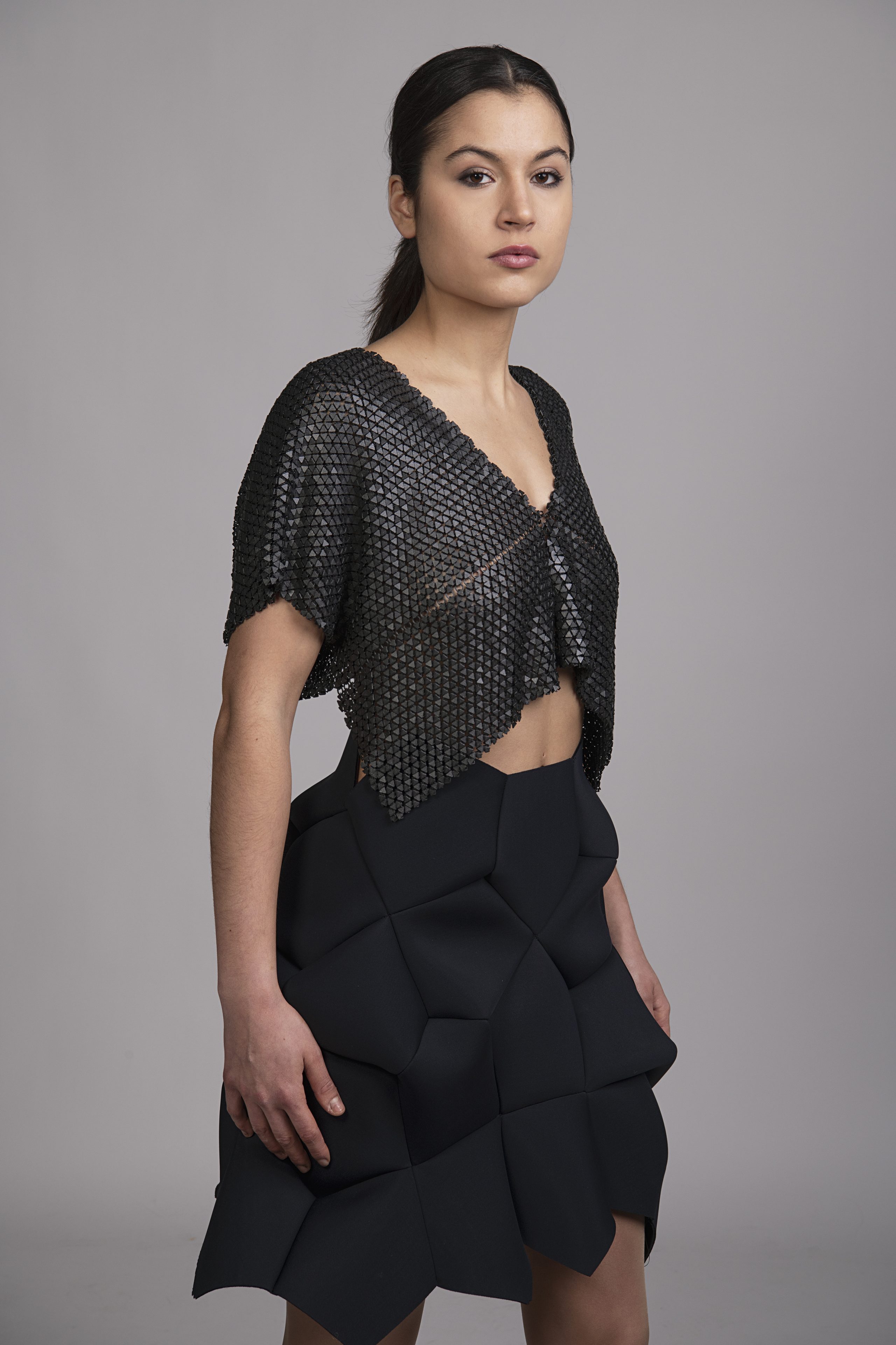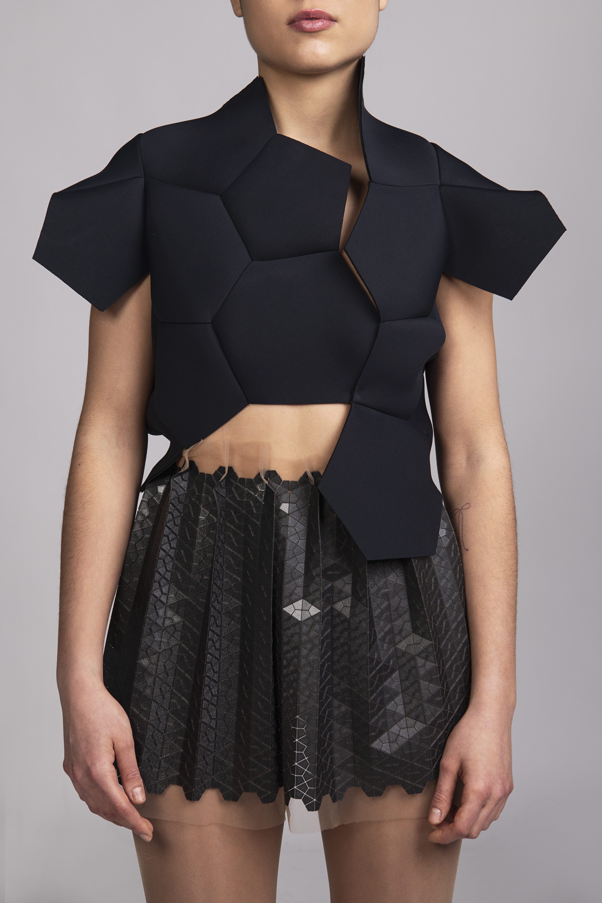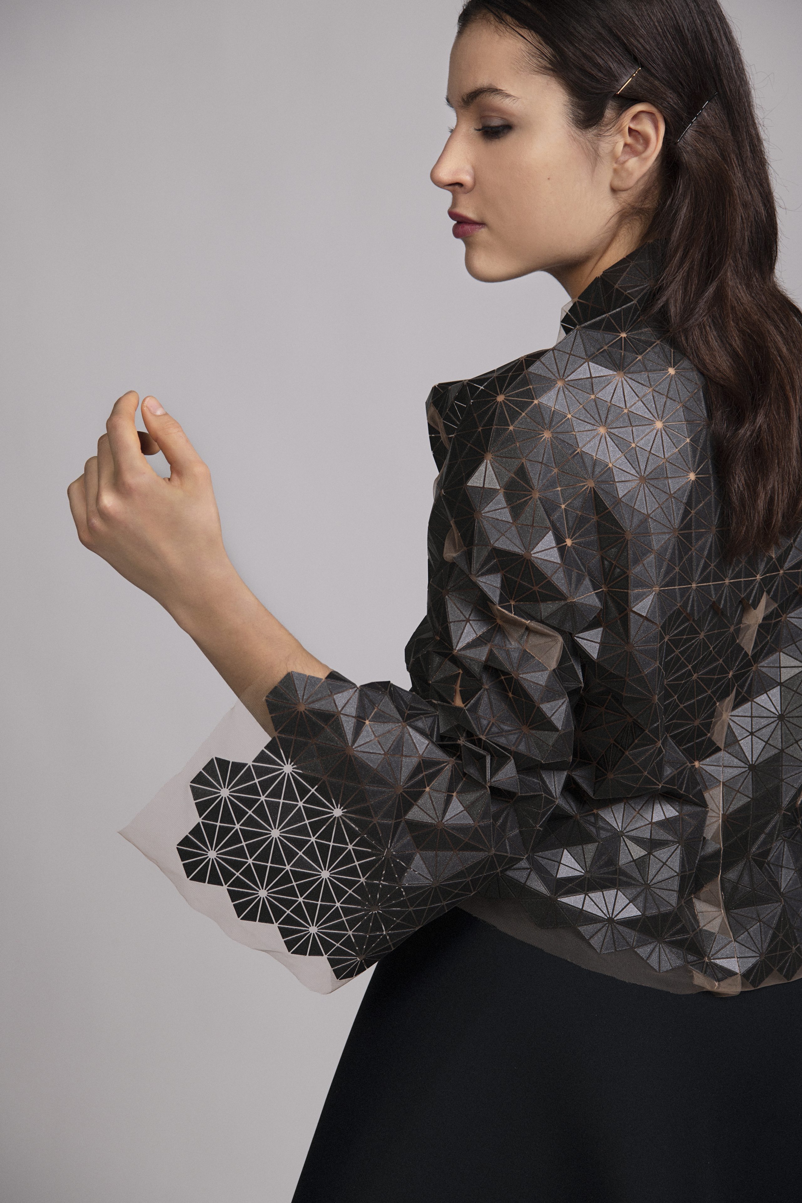 3D tlač je technológia s obrovským potenciálom, ponúka množstvo výhod a očakáva sa, že zmení spôsob výroby. Experimentujem s geometrickými motívmi – raportovanými trojuholníkmi, štvorcami a hviezdicovými útvarmi – ktoré nanášam na tyl pomocou 3D tlačiarne. Spájaním mäkkého transparentného podkladu s pevnými vrstvami tuhého plastu vznikajú organické štruktúry s premenlivým charakterom. V pohybe sa jemne krčia, reagujú na svetlo a tieň, čím formujú novú, telesnú škrupinu. Strihové riešenia sú minimalistické – tvarovanie odevu priamo vychádza z vlastností materiálu. Vďaka 3D tlači vznikajú odevy s čistou siluetou, kde forma prirodzene vyrastá z technológie. Kolekciu dopĺňajú sukne a top z neoprénu tvarované ako lopty z päť- a šesťuholníkov, ktoré dotvárajú celistvý organický výraz.