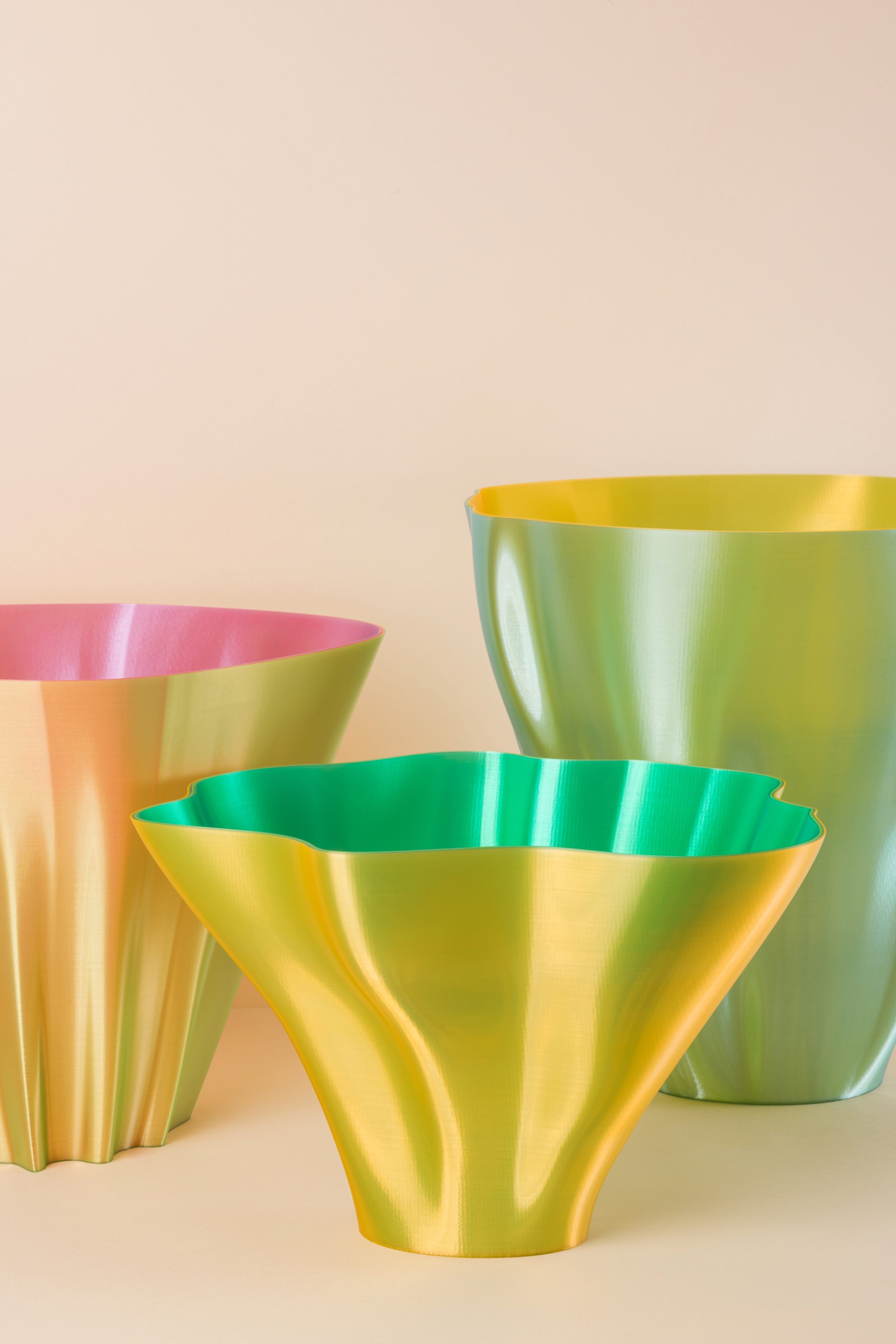 Dizajnérka Silvia Sukopová Lovasová sa vo svojej praxi dlhodobo venujem rozvíjaniu digitálneho remesla prostredníctvom 3D tlače. Zameriava sa na hľadanie novej vizuality a skúmanie inovatívnych výrobných postupov. V kolekcii Rainbow Bowls Limited pracuje s technikou skladania samostatne 3D tlačených translucentných PLA vrstiev do výsledného objektu. Táto metóda prináša nečakaný vizuálny efekt – farebnosť sa plynulo mení v závislosti od uhla pohľadu a svetelných podmienok. Každá misa vzniká na základe ručných kresieb, ktoré sú následne prevedené do 3D modelu, čo zaručuje originalitu objektu. Výrobný proces je jednoduchý, nevyžaduje špeciálne materiály ani profesionálne 3D tlačiarne a vyúsťuje do kolekcie unikátnych dúhových mís, ktoré vytváram ako originálne zberateľské objekty s možnosťou ich využitia aj ako vázy.