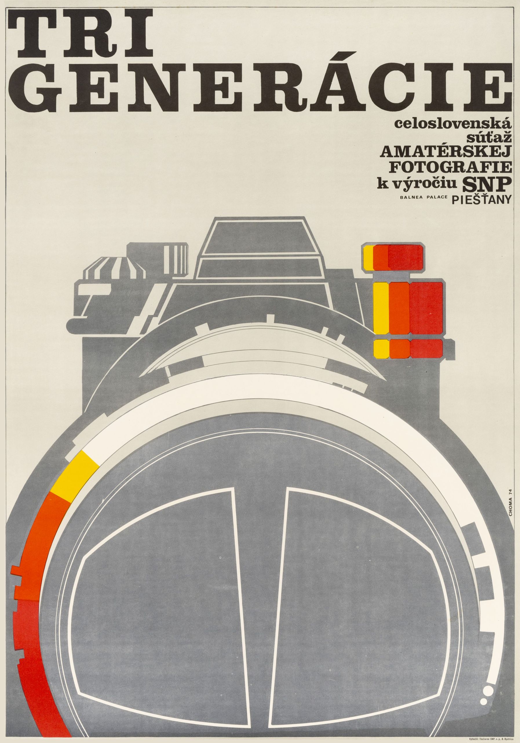 Plagát na výstavu Tri generácie, prezentáciu celoslovenskej súťaže amatérskej fotografie, navrhol dnes už významný grafický dizajnér Pavel Choma ešte ako študent úžitkovej grafiky na Vysokej škole výtvarných umení. Vo vizuáli pracoval s motívom extrémne zväčšeného a technicky presne prekresleného detailu fotoaparátu. Minimalistický plagát je doplnený adekvátnou typografickou zložkou.