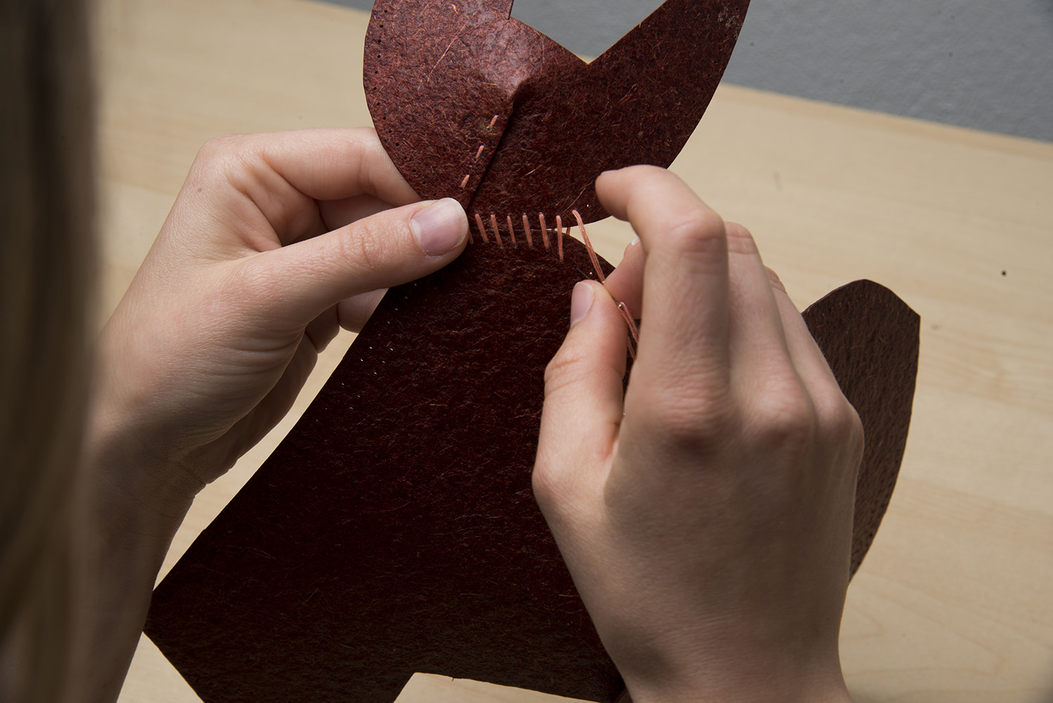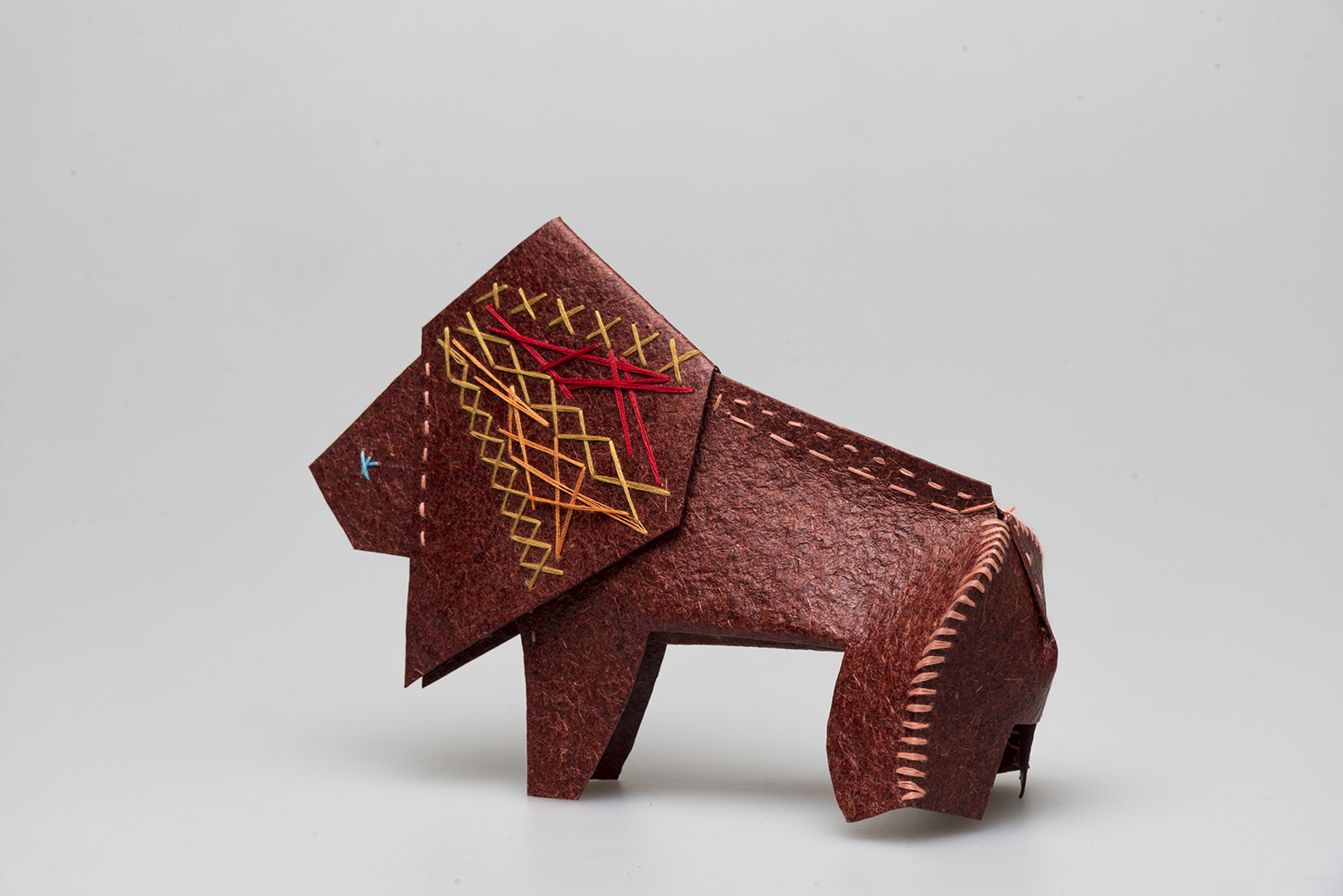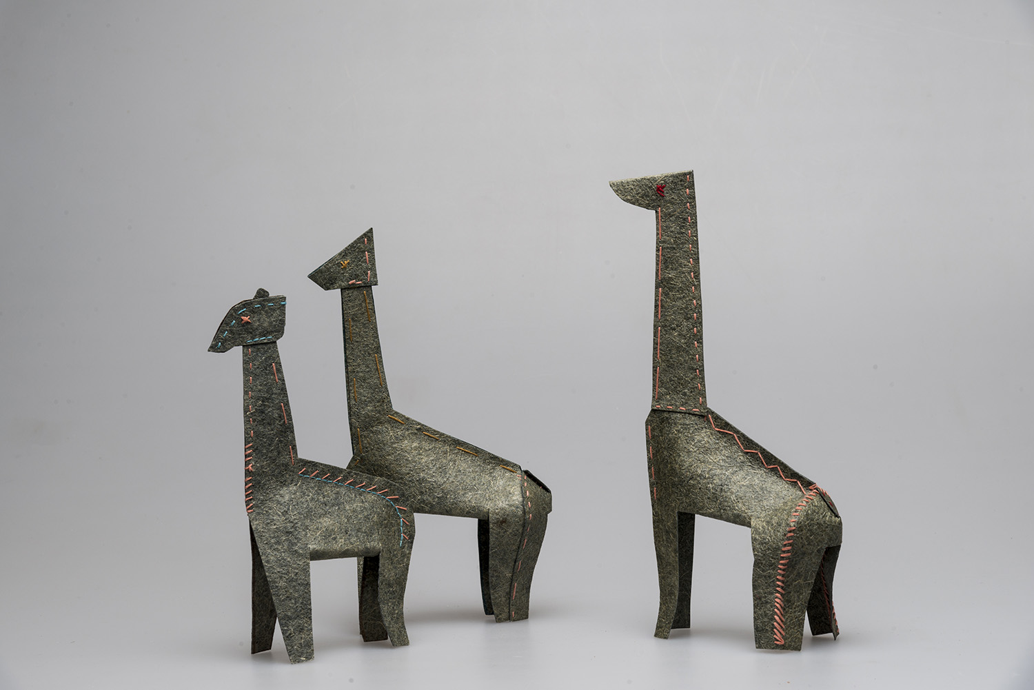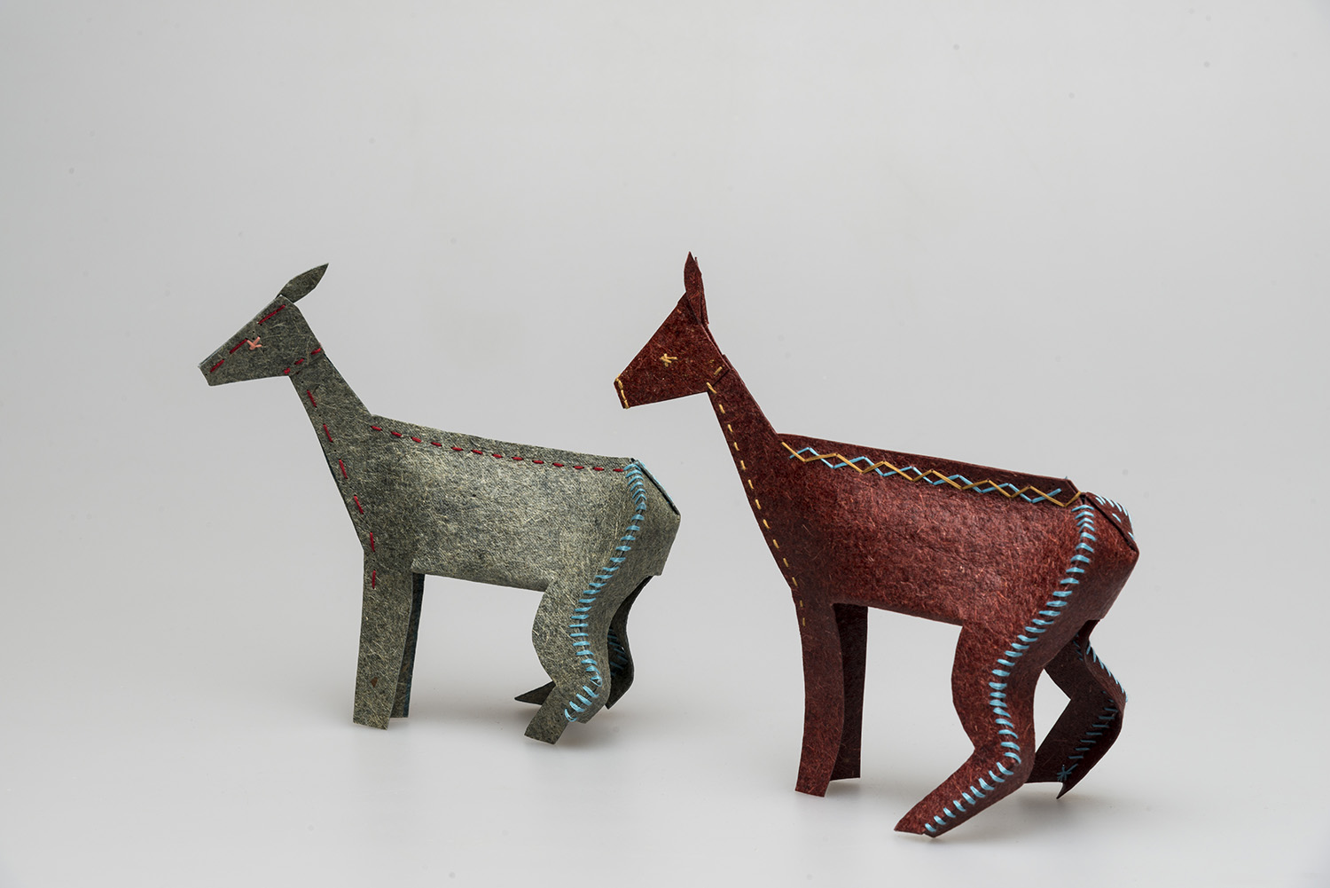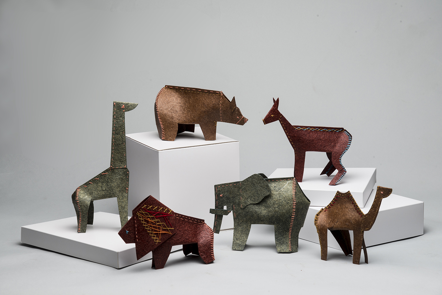 ZOOŠI is a set of six children’s toys, abstracted from children’s drawings created during workshops held as part of the design process. They are made from Malai, a biocomposite derived from coconut-water waste that, in feel, resembles animal hide. Malai is non-toxic, vegan, and water-resistant; it lasts four to eight years and then begins to biodegrade without burdening the soil. For these reasons, Malai became the collection’s primary material. The animal shapes are designed to support and stimulate fine-motor skills and natural hand movement. Each toy is supplied as a sewing pattern: the child cuts out the pieces and hand-stitches them into the final animal. The series serves as a tool for developing fine motor skills while also addressing the climate crisis.