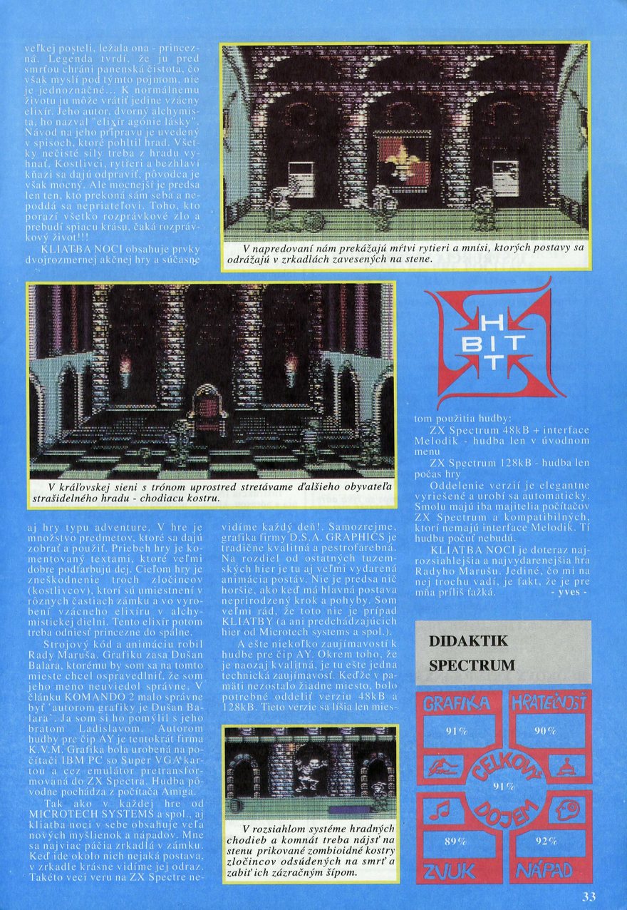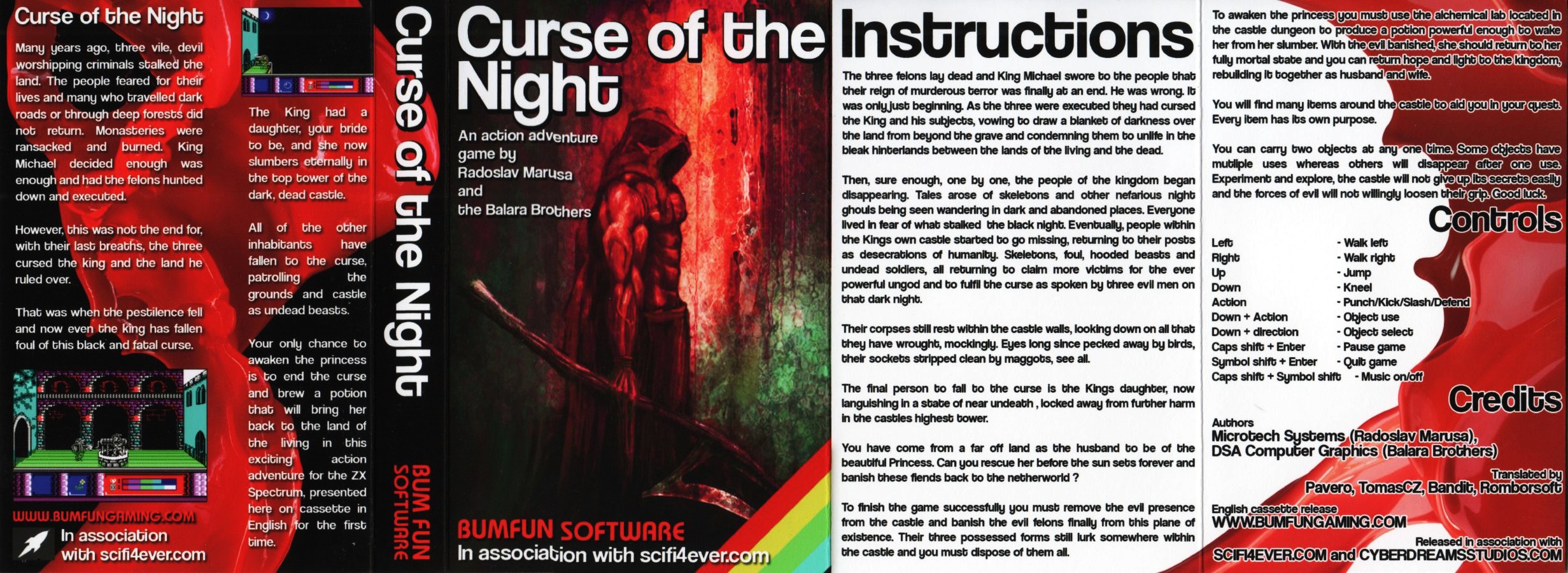 Kliatba noci je hra Radoslava Marušu. Táto trochu netradične poňatá akčná adventúra je originálnym pôvodným titulom tvorcu, ktorým preukazuje svoju technickú zdatnosť i porozumenie žánru a jeho silných stránok. Ako rytier v nej blúdite zámkom, vyhýbate sa alebo bojujete so zakliatymi obyvateľmi zámku a v jednotlivých graficky a výtvarne nápadito spracovaných obrazovkách zbierate predmety určené na prípravu elixíru na prebudenie spiacej princeznej. Zaujímavým prvkom je teda i využitie dobre známeho rozprávkového trópu o zakliatej krásavici. Svojím grafickým spracovaním predstavovala hra jeden z najkvalitnejších domácich titulov v dobe svojho vydania. Výnimočné je napríklad aj zakomponovanie odrazov postáv v zrkadlách (dokonca aj v rozbitých) nachádzajúcich sa v niektorých úrovniach. Kliatbe noci nechýba ani súbojový systém, aj keď jeho využitie nie je pre potreby dokončenia hry vôbec potrebné.