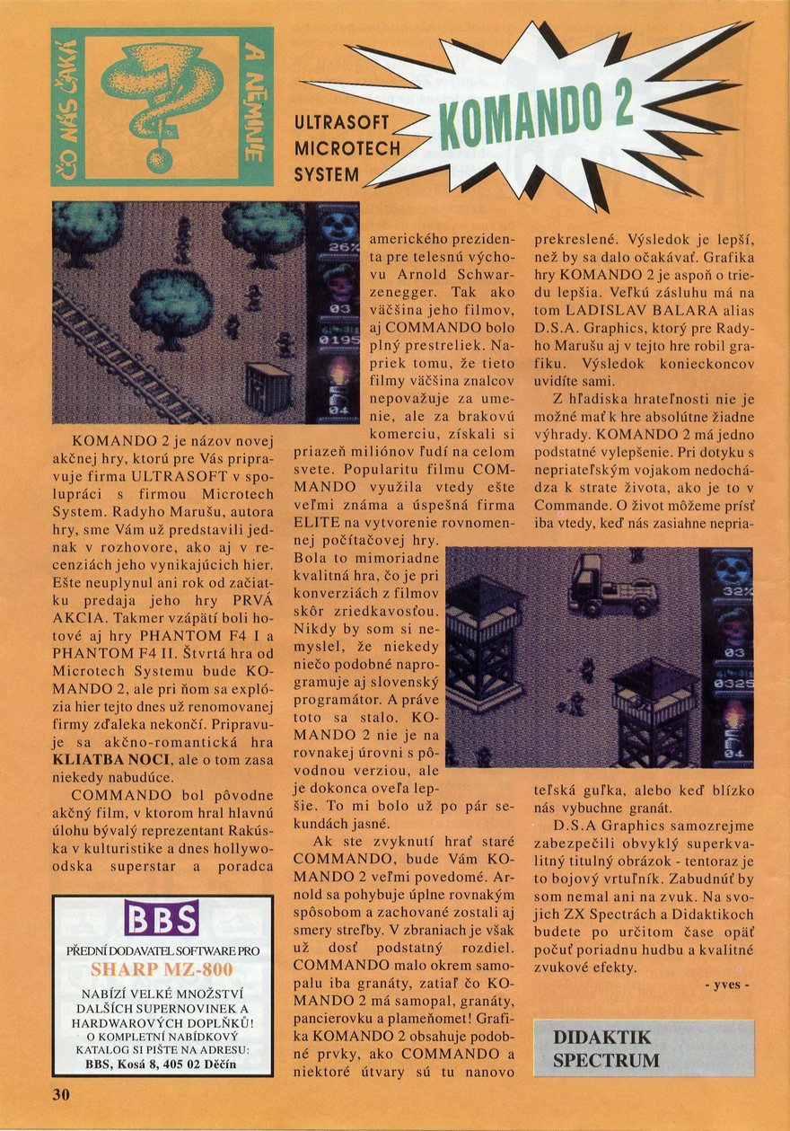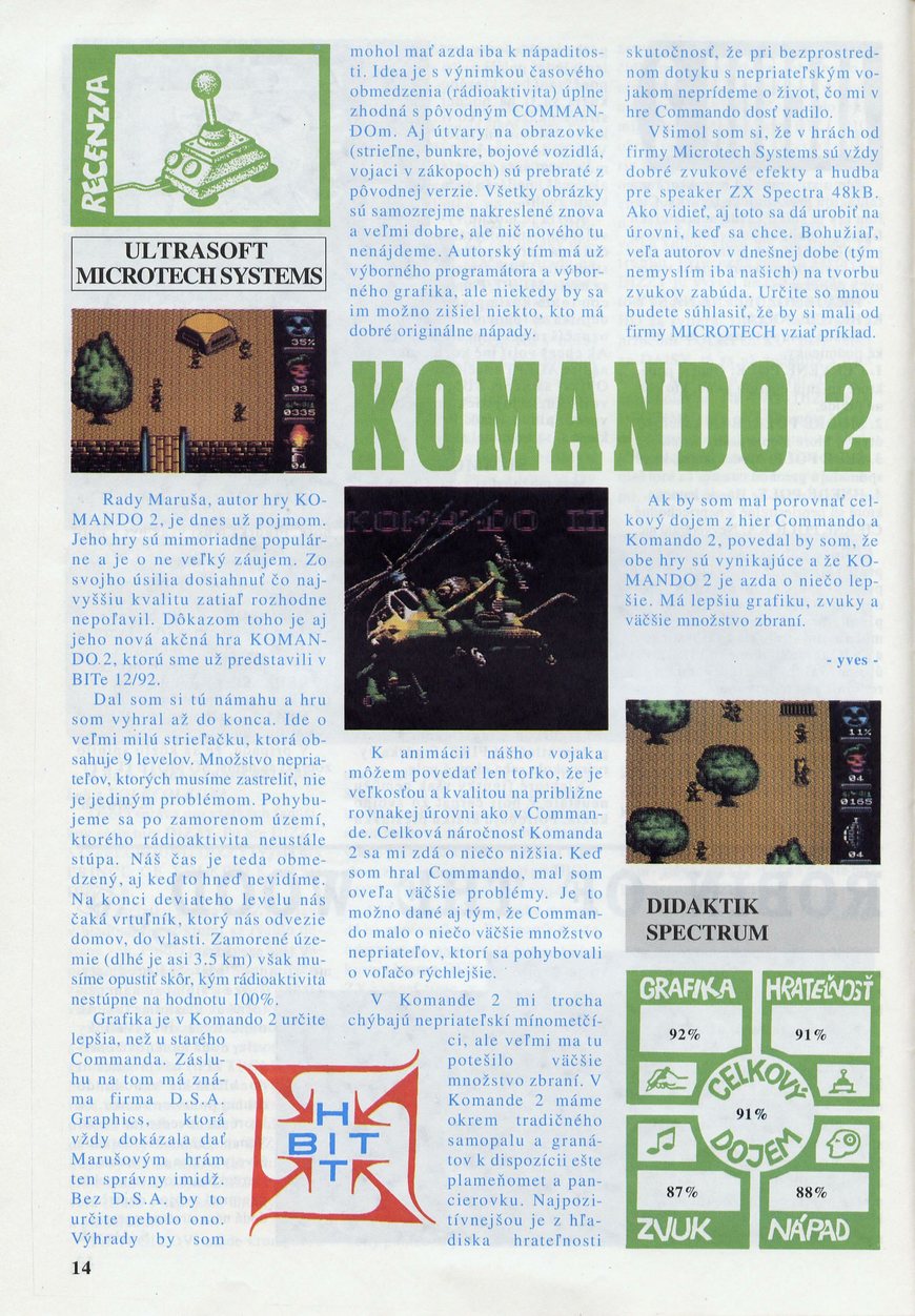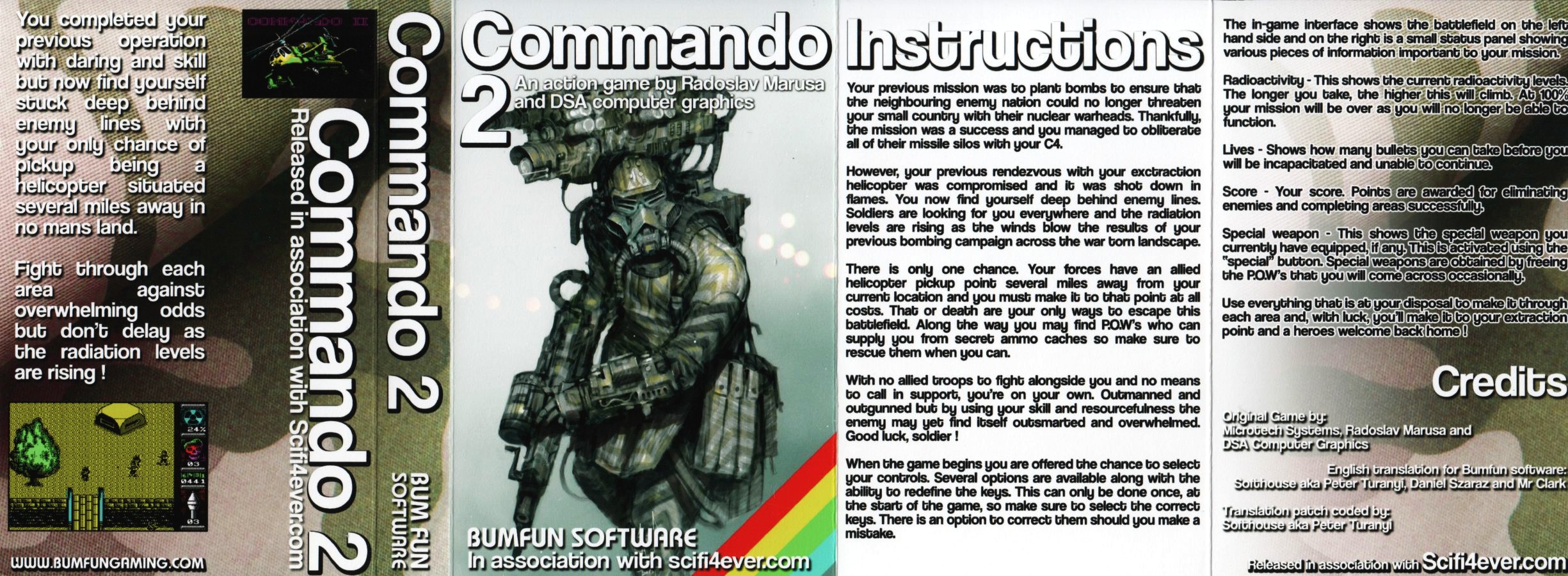 KOMANDO 2 je akčná plnografická hra s vojnovým námetom. Náš hrdina — člen špeciálneho záškodníckeho komanda bol zhodený na padáku do tyla nepriateľa. Jeho úlohou bolo pomocou špeciálnej plastickej trhaviny mimoriadnej výbušnej sily — semtexu poškodiť jadrový reaktor, v ktorom susedný štát vyrába plutónium pre atómové hlavice svojich rakiet. / Preklad hry do anglického jazyka: Daniel Száraz