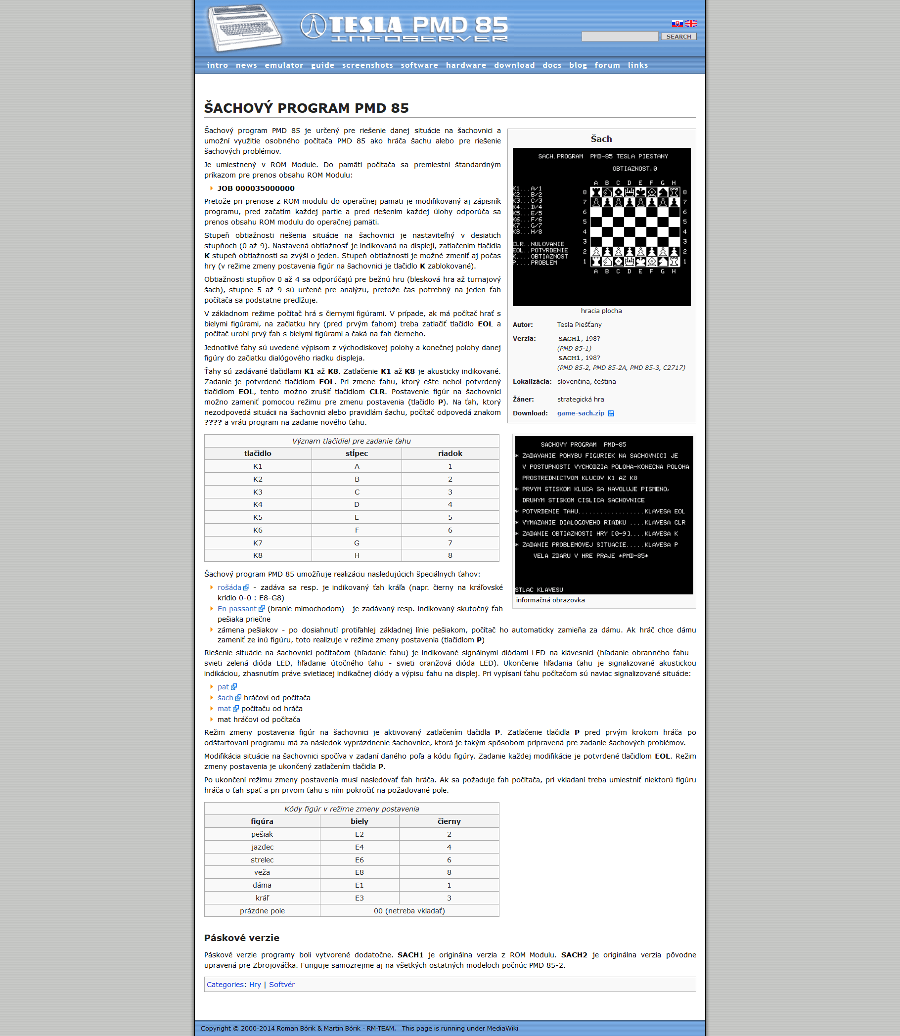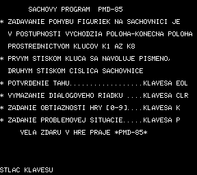 Šachový program PMD 85 je určený pre riešenie danej situácie na šachovnici a umožní využitie osobného počítača PMD 85 ako hráča šachu alebo pre riešenie šachových problémov.