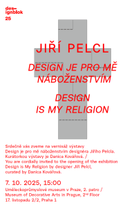 Pozývame vás na aktuálnu samostatnú výstavu Jiřího Pelcla, v poradí už tridsiatu šiestu, ktorá nesie názov „Dizajn je pre mňa náboženstvom“ a je inštalovaná v Uměleckoprůmyslovém muzeu v Prahe (8. 10. – 2. 11. 2025). Výstava sa koná pri príležitosti festivalu dizajnu Designblok. Zameriava sa na autorove realizované návrhy výrobkov, ktoré sa dlhodobo vyrábajú. Súčasťou výstavy je aj umelecká intervencia do stálej expozície múzea, kde sú umiestnené ďalšie Pelclove objekty a prototypy.