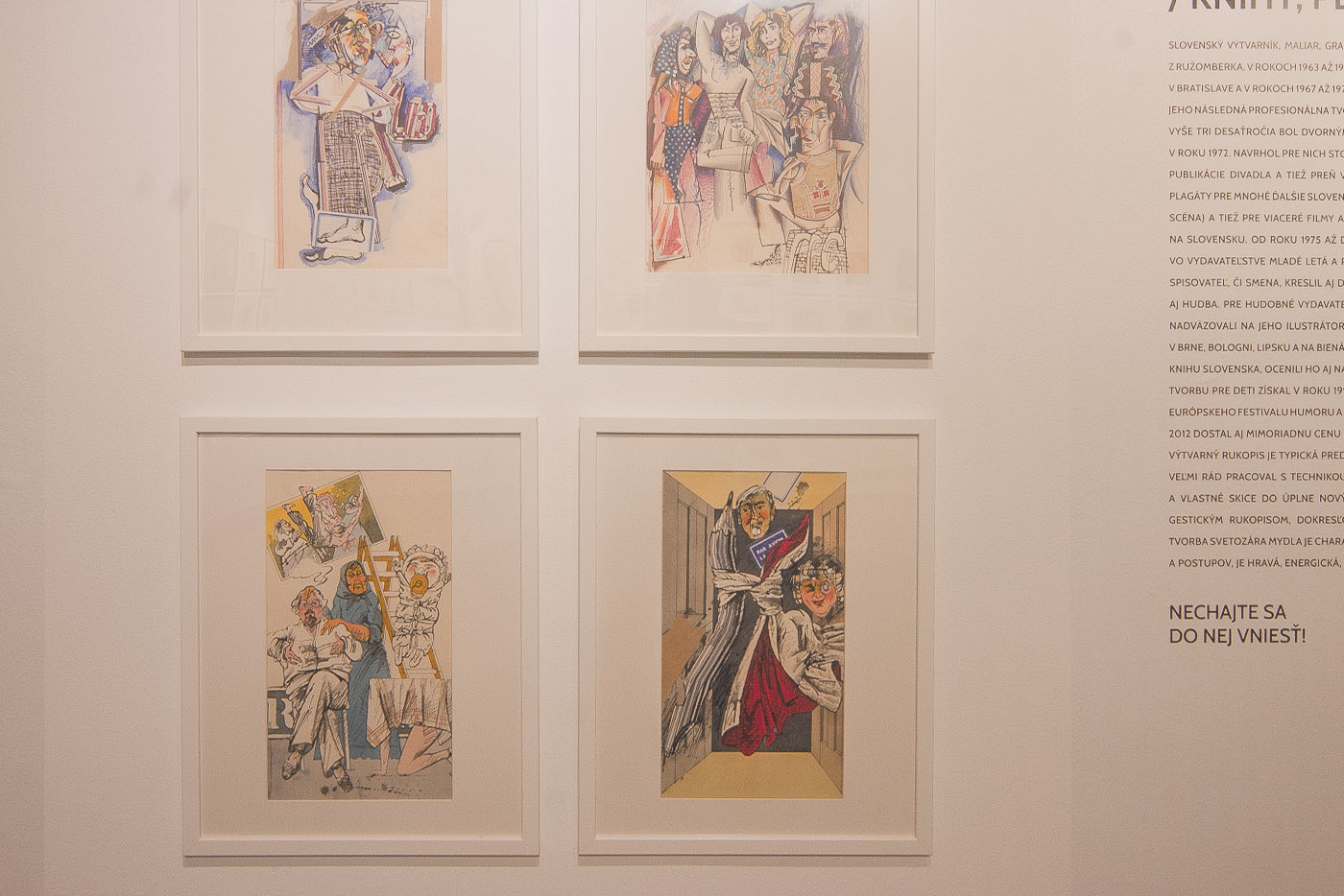 Výber vystavených prác z obdobia 70., 80. a 90. rokov 20. storočia je zameraný najmä na Mydlovu knižnú a ilustrátorskú tvorbu pre detskú aj „dospelácku“ literatúru, ktorú tvoril hlavne pre vydavateľstvá Mladé letá, Buvik, Slovenský spisovateľ a Smena; plagátovú tvorbu pre divadlá, filmy či výstavy a hlavne pre Radošinské naivné divadlo, ktorým bol dvorným grafikom; a výber návrhov obálok gramoplatní rôznych hudobných žánrov a interpretov. Diela na výstavu boli zapožičané zo zbierkového fondu Slovenského múzea dizajnu a z pozostalosti Svetozára Mydla od jeho rodiny.