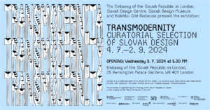 Veľvyslanectvo Slovenskej Republiky v Londýne, s podporou Ministerstva zahraničných vecí a európskych záležitostí SR otvára v stredu 03. 07. 2024 o 17.30 h výstavu Slovenského centra dizajnu, Slovenského múzea dizajnu a francúzskeho partnera Kolektiv Cité Radieuse – Transmodernita v zrekonštruovanej budove Veľvyslanectva Slovenskej Republiky v Londýne, ktorú navrhli architekti Šrámek, Bočan a Štepánský.