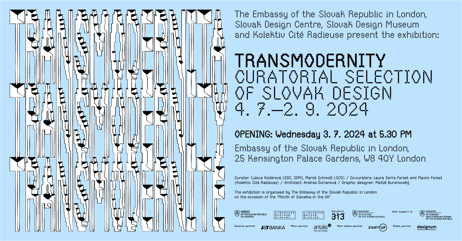 Výstava Transmodernita vznikla v roku 2023 v spolupráci so Slovenským Inštitútom v Paríži a Slovenským inštitútom vo Viedni ako spoločný projekt Slovenského centra dizajnu, Slovenského múzea dizajnu a francúzskeho partnera Kolektiv Cité Radieuse. Po úspešnej prezentácii slovenského dizajnu v Slovenskom Inštitúte vo Viedni a v Galérii 313 Koletiv v Le Corbusiérovej Unité d’Habitation v Marseille znovu otvárame výstavu v brutalistickej budove Veľvyslanectva Slovenskej Republiky v Londýne.