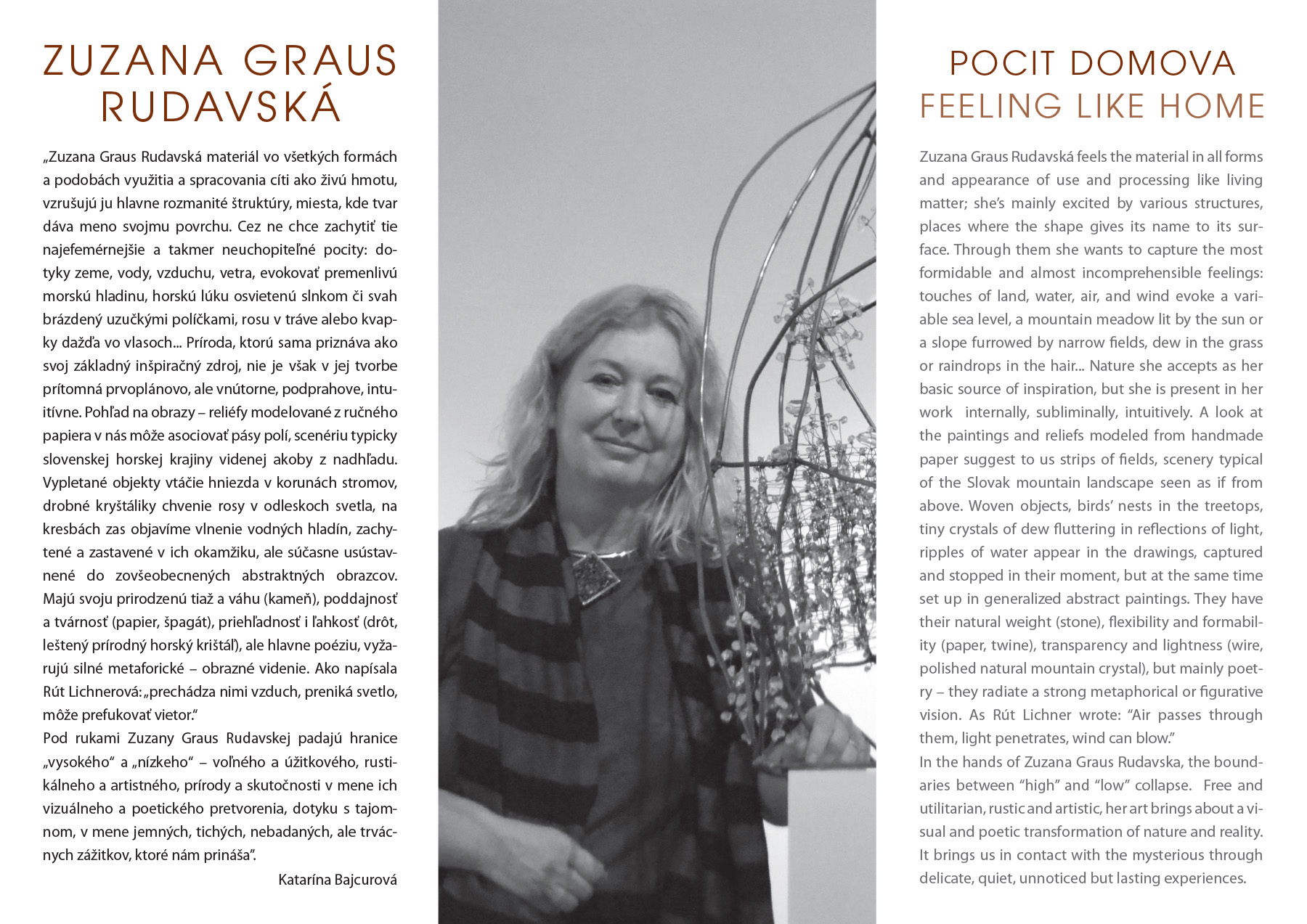 Pod rukami Zuzany Graus Rudavskej padajú hranice „vysokého“ a „nízkeho“ – voľného a úžitkového, rustikálneho a artistného, prírody a skutočnosti v mene ich vizuálneho a poetického pretvorenia, dotyku s tajomnom, v mene jemných, tichých, nebadaných, ale trvácnych zážitkov, ktoré nám prináša”.